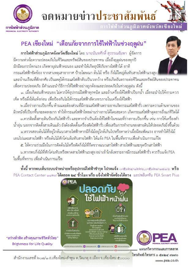 การไฟฟ้าส่วนภูมิภาคจังหวัดเชียงใหม่ โดย นายนันทศักดิ์ สุวรรณอัมพา ผู้จัดการ มีความห่วงใยความปลอดภัยในชีวิตและทรัพย์สินของประชาชน เมื่อถึงฤดูฝนของทุกปี มักมีลมกระโชกแรง เกิดพายุฝนฟ้าคะนอง และทำให้เกิดอุบัติภัยทางไฟฟ้าได้ อาทิ กระแสไฟฟ้าขัดข้อง จากสาเหตุเสาอากาศ ป้ายโฆษณา ต้นไม้ หรือ กิ่งไม้ใหญ่ล้มทับสายไฟฟ้าแรงสูงและบ้านเรือนที่พักอาศัย เป็นเหตุให้กระแสไฟฟ้าดับเป็นวงกว้าง หรือเกิดอันตรายต่อชีวิตและทรัพย์สินของประชาชน เพื่อความปลอดภัย มีคำแนะนำวิธีการใช้ไฟฟ้าอย่างถูกต้องและปลอดภัยในช่วงฤดูฝน