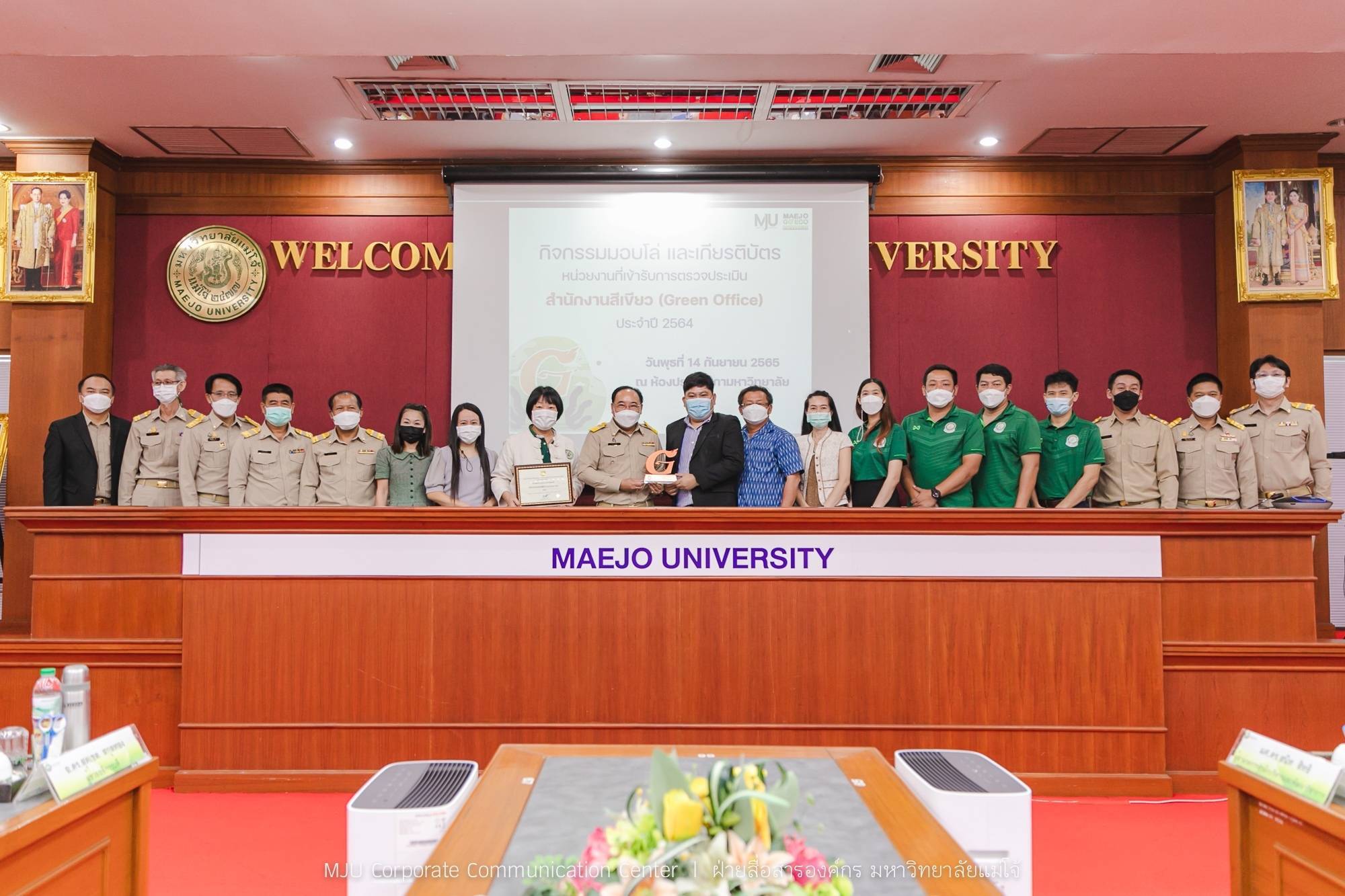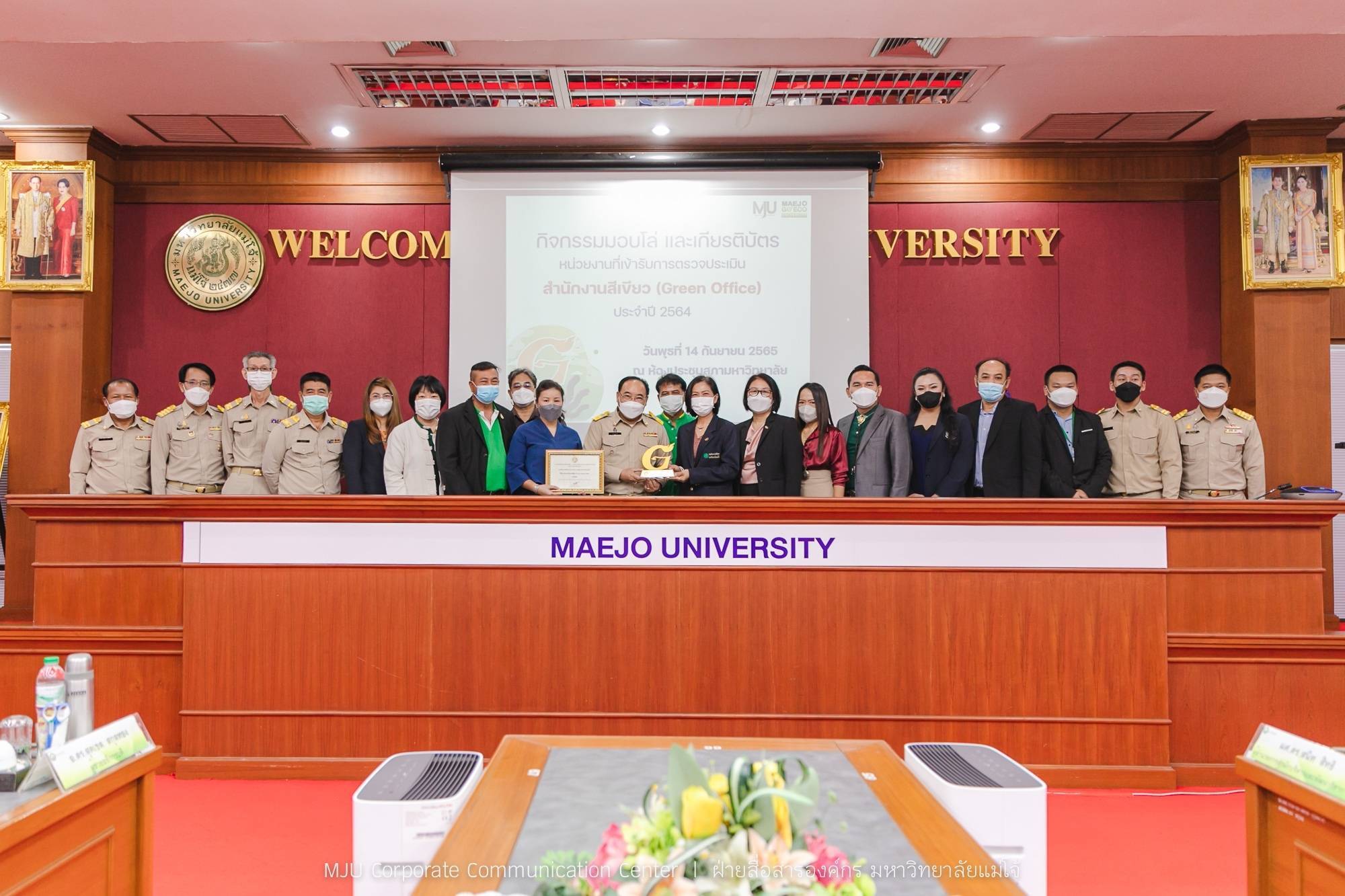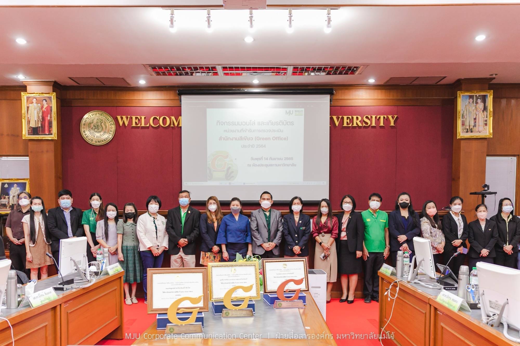 วันพุธที่ 14 กันยายน พ.ศ. 2565 มหาวิทยาลัยแม่โจ้ มีพิธีส่งมอบรางวัลตราสัญลักษณ์ G-Green รางวัล Green office ระดับประเทศ ให้เป็นเกียรติประวัติกับ 3 หน่วยงานที่ผ่านการตรวจประเมิน สำนักงานสีเขียว Green Office ประจำปี 2564 ในระดับดีเยี่ยม (G ทอง) และระดับดีมาก (G ทองแดง) จากกรมส่งเสริมคุณภาพและสิ่งแวดล้อม กระทรวงทรัพยากรธรรมชาติและสิ่งแวดล้อม