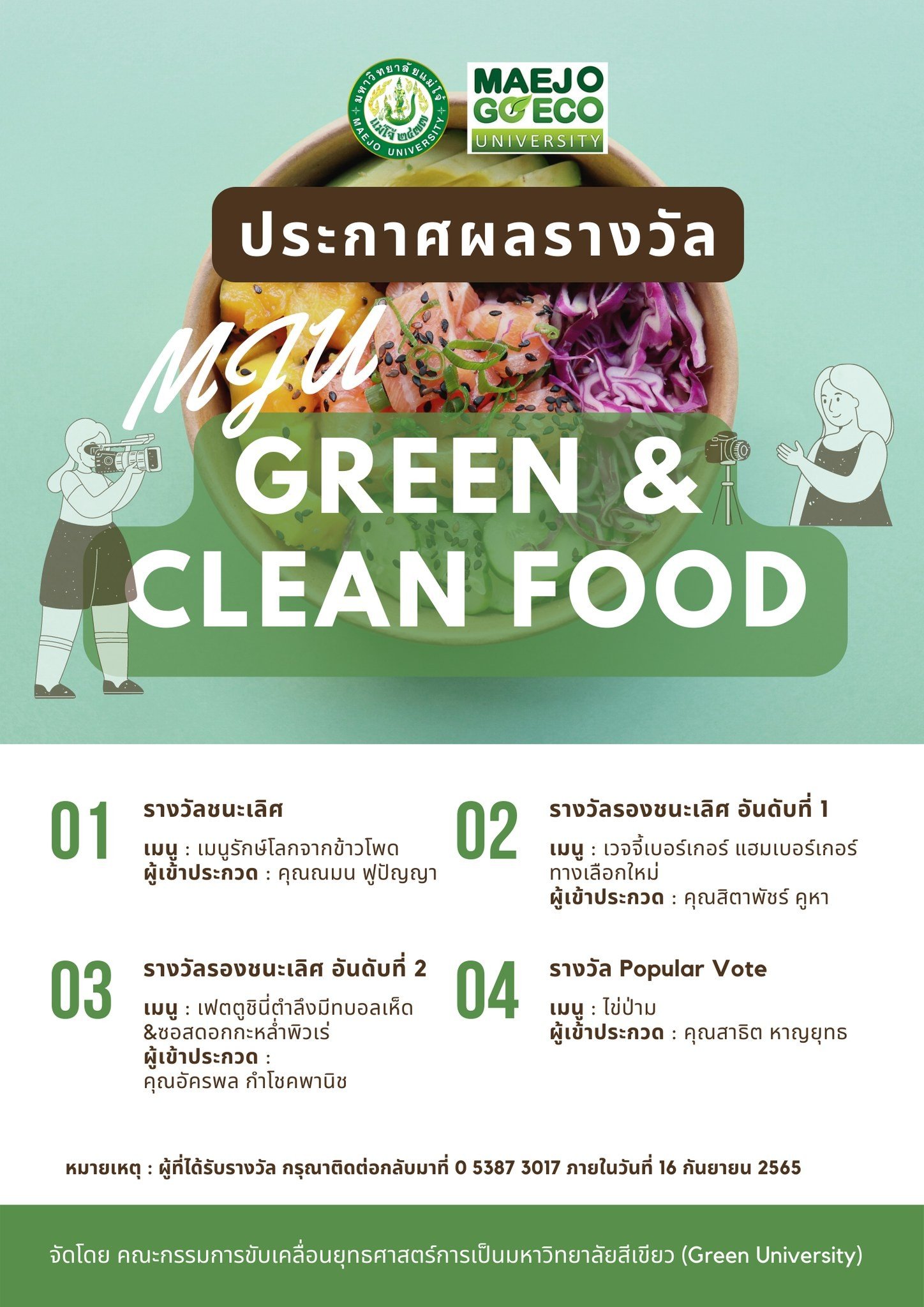 มหาวิทยาลัยแม่โจ้ โดย คณะกรรมการขับเคลื่อนยุทธศาสตร์การเป็นมหาวิทยาลัยสีเขียว (Green University) จัดการประกวดคลิปทำอาหาร ภายใต้หัวข้อ “MJU Green & Clean Food” เมนูรักษ์โลก สะอาด ปลอดภัย ใส่ใจสุขภาพ เพื่อส่งเสริมให้คนรุ่นใหม่ หันมาใส่ใจสุขภาพและสิ่งแวดล้อม โดยนำเสนอเป็นคลิปวิดีโอผ่านการเล่าเรื่อง “อาหาร” ซึ่งเป็นส่วนหนึ่งในกิจกรรมขับเคลื่อนยุทศาสตร์การเป็นมหาวิทยาลัยสีเขียว ชิงเงินรางวัลรวม 25,000 บาท ซึ่งมีผู้สนใจส่งผลงานเข้าร่วมประกวดจากทั่วประเทศเป็นจำนวนมาก โดยผลการประกวด มีดังนี้