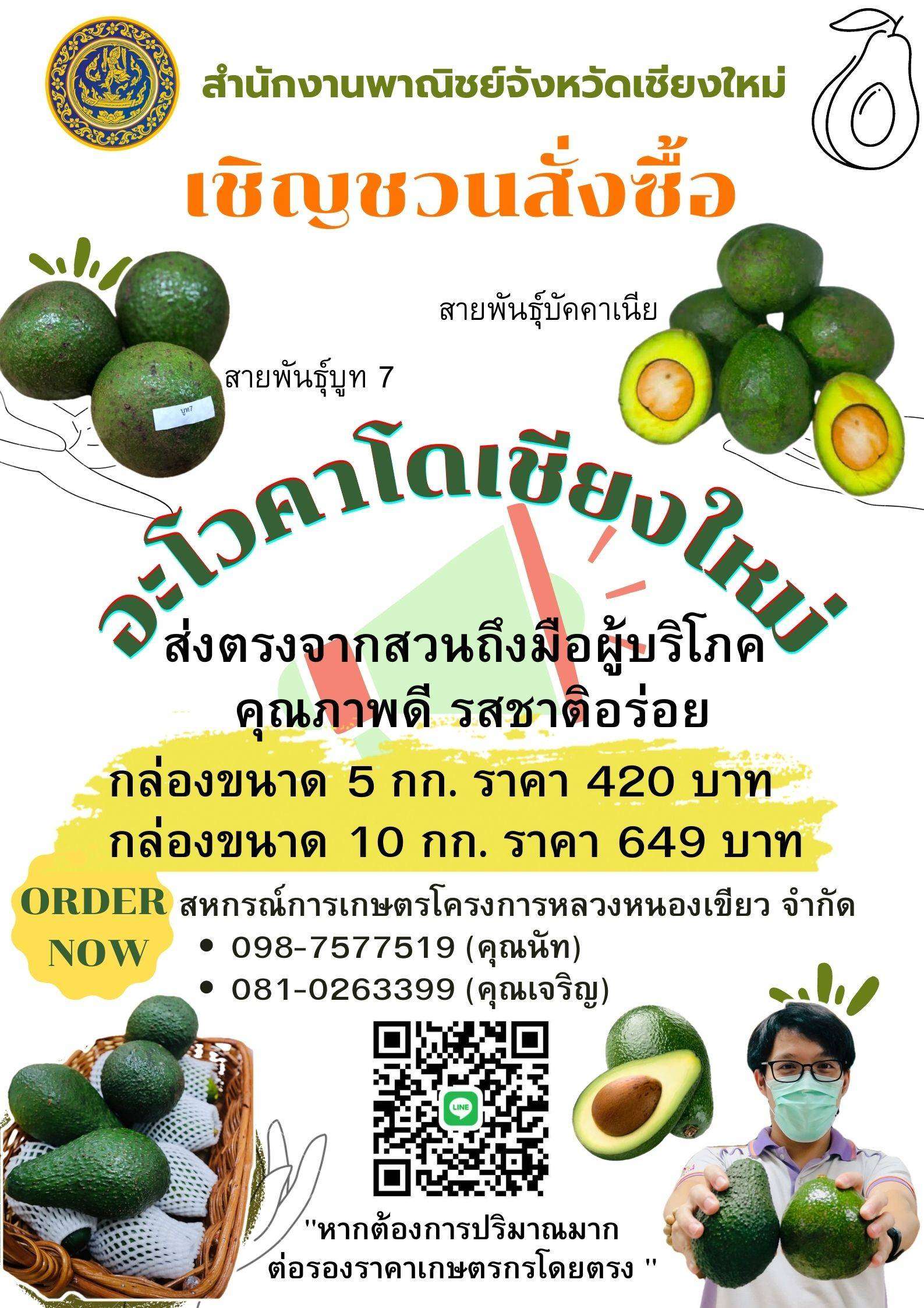 สำนักงานพาณิชย์จังหวัดเชียงใหม่ ขอเชิญชวนทุกท่านช่วยซื้อ “อะโวคาโดจังหวัดเชียงใหม่” สายพันธุ์บัคคาเนีย และสายพันธุ์บูท 7