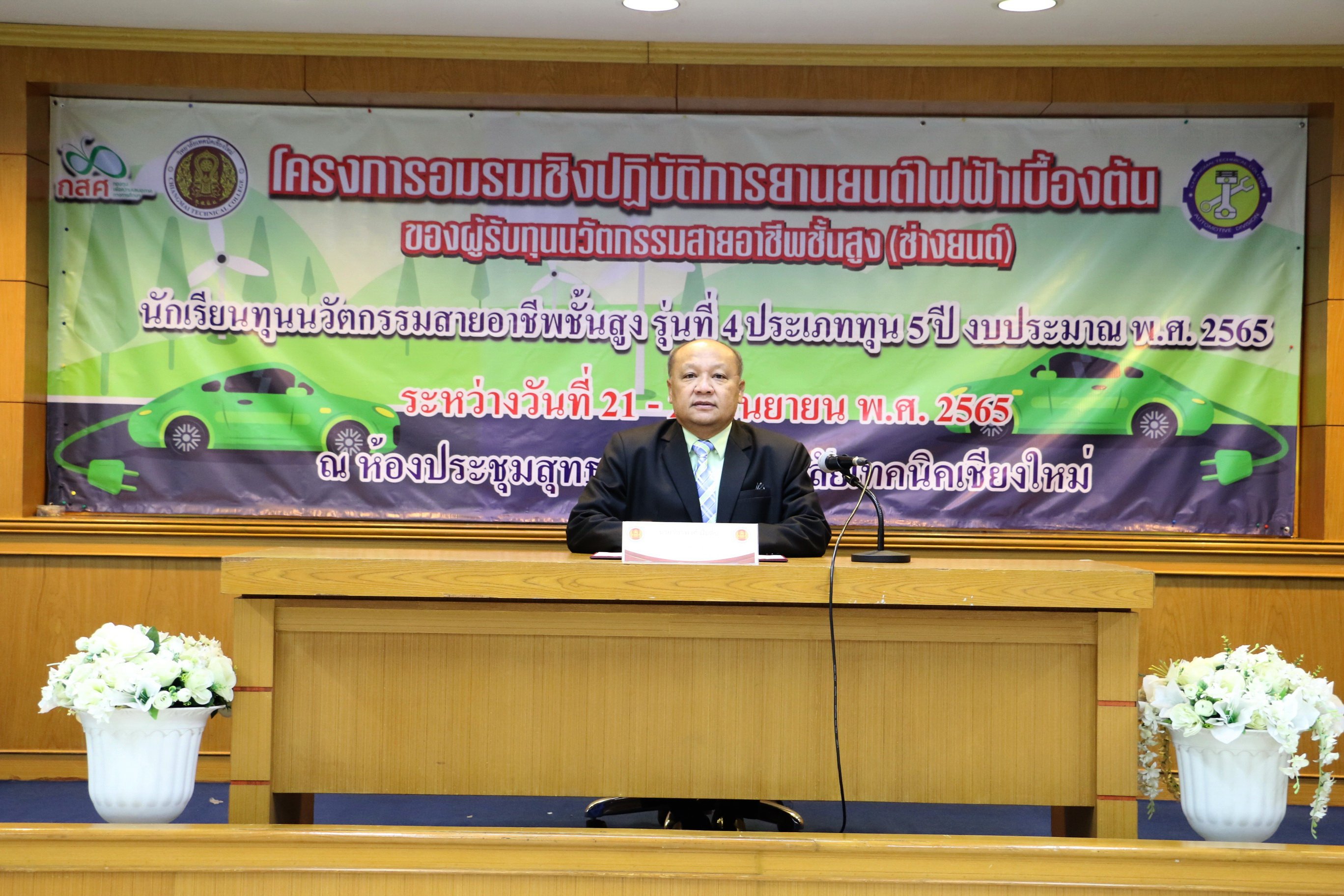 วันที่ 21 กันยายน 2565 นายวัชรพงศ์ ฝั้นติ๊บ ผู้อำนวยการวิทยาลัยเทคนิคเชียงใหม่ ให้เกียรติเป็นประธานกล่าวเปิดงาน โครงการอบรมเชิงปฎิบัติการยานยนต์ไฟฟ้าเบื้องต้น ของผู้รับทุนนวัตกรรมสายอาชีพชั้นสูง (ช่างยนต์) นักเรียนทุนนวัตกรรมสายอาชีพชั้นสูง รุ่นที่ 4 ประเภททุน 5 ปี งบประมาณ พ.ศ. 2565 ระว่างวันที่ 21-22 กันยายน 2565 ณ ห้องประชุมสุทธาธรรม วิทยาลัยเทคนิคเชียงใหม่ โดยมีผู้บริหาร คณะครูและนักเรียนทุนนวัตกรรมสายอาชีพ รุ่นที่ 4 เข้ารับการอบรม จำนวน 62 คน วิทยากรจาก