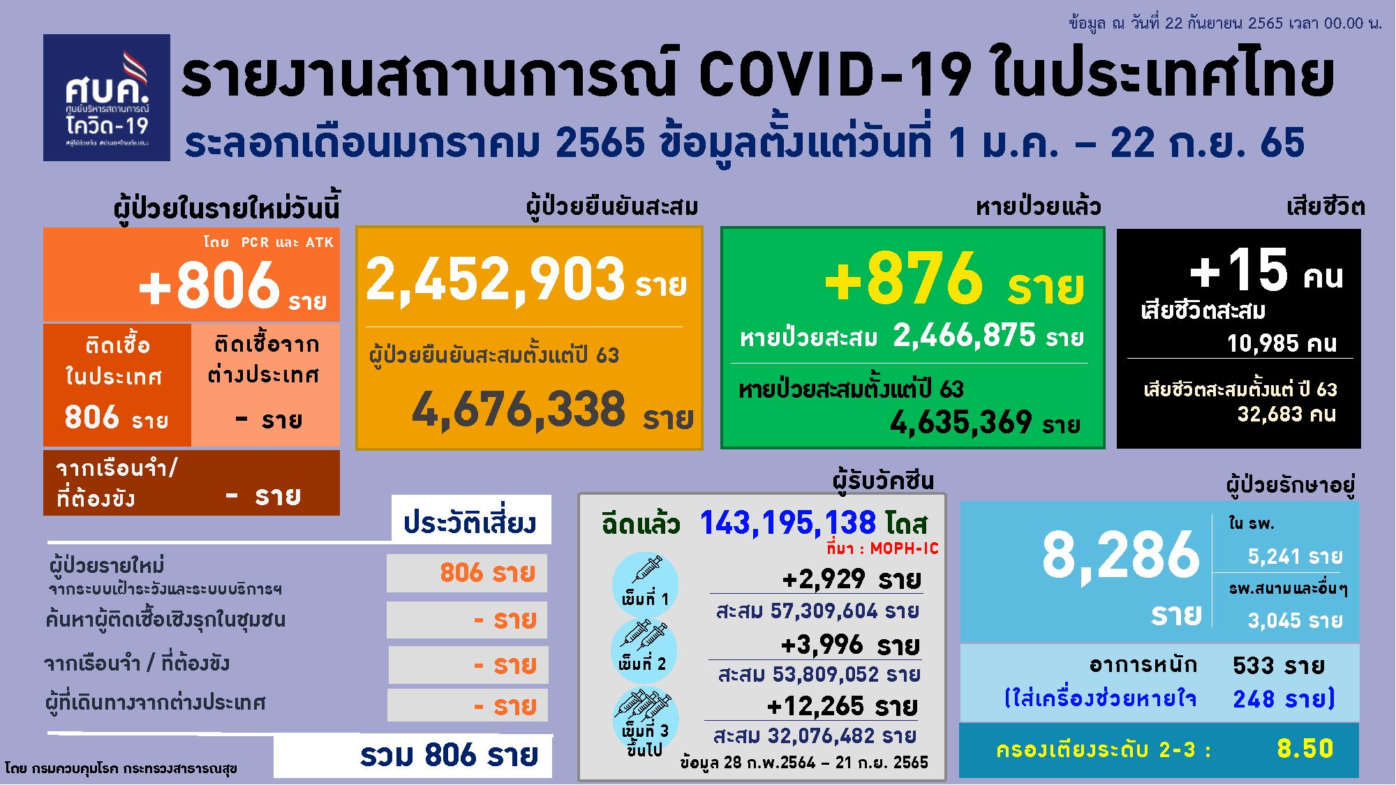 ขณะที่สาธารณสุข แถลงสถานการณ์ตั้งแต่ 1 มกราคม 2565 พบผู้ติดเชื้อโควิด-19 เพิ่ม 806 ราย สะสมเป็น 2,452,903 ราย เสียชีวิตเพิ่ม 15 ราย เสียชีวิตสะสม 10,985 ราย หายป่วยวันนี้ 876 ราย สะสม 2,466,875 ราย รักษาตัวอยู่ 8,286 ราย