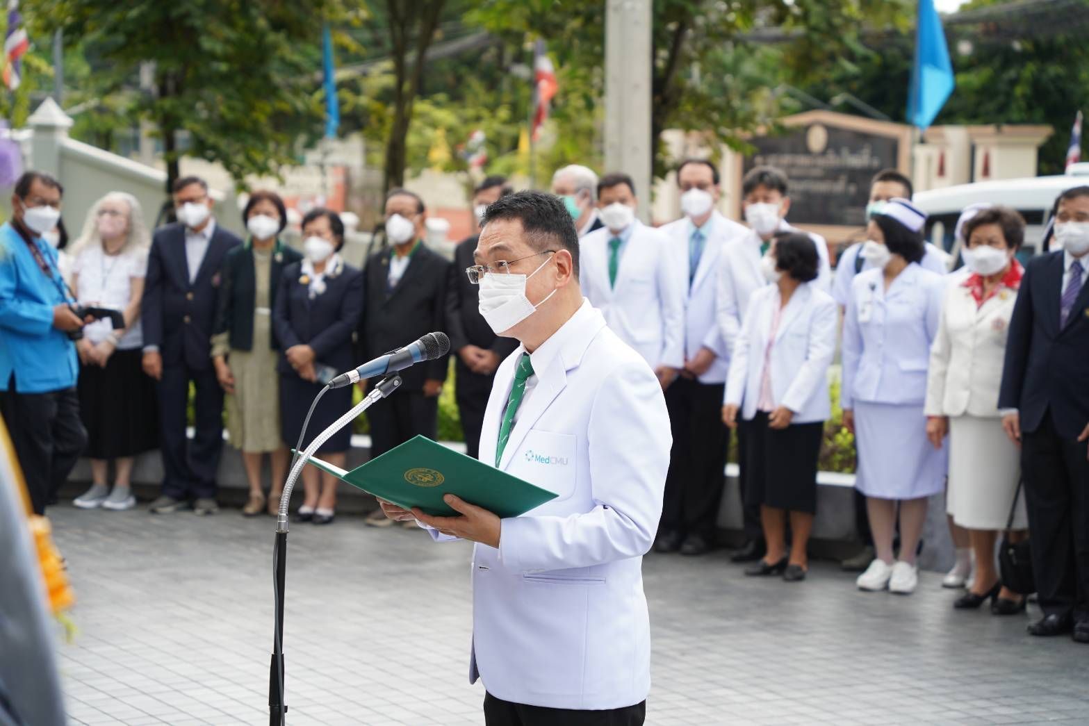 ศ.(เชี่ยวชาญพิเศษ ) นพ.บรรณกิจ โลจนาภิวัฒน์ คณบดีคณะแพทยศาสตร์ มช. กล่าวถวายราชสดุดี ในพิธีวางพวงมาลาถวายบังคมพระราชานุสาวรีย์ สมเด็จพระมหิตลาธิเบศร อดุลยเดชวิกรม พระบรมราชชนก เนื่องในวันมหิดล ประจำปี 2565