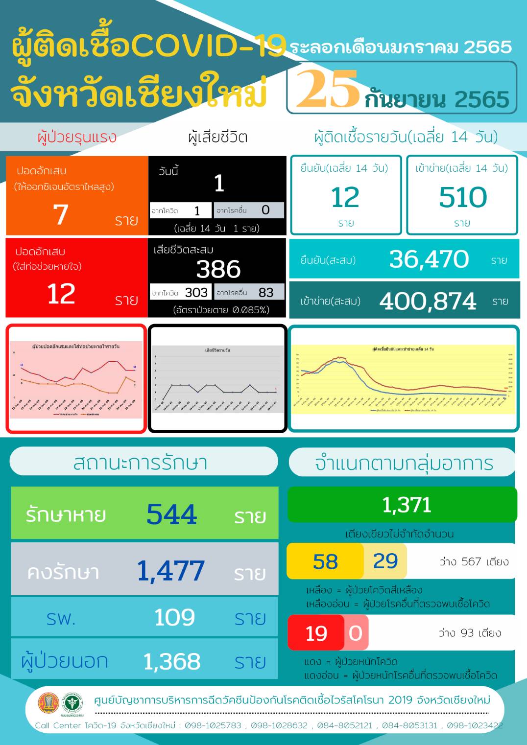 สาธารณสุข จ.เชียงใหม่ เผยสถานการณ์ COVID-19 ในพื้นที่ พบผู้ป่วย Covid-19 ยืนยันเพิ่ม 12 ราย สะสม 36,470 ราย มีผู้เสียชีวิตเพิ่ม 1 ราย สะสม 386 ราย เข้าข่ายติดเชื้อสะสม 400,874 ราย รักษาตัวอยู่ 1,477 ราย รักษาหายวันนี้ 544 ราย เมื่อวันที่ 25 ก.ย. 2565