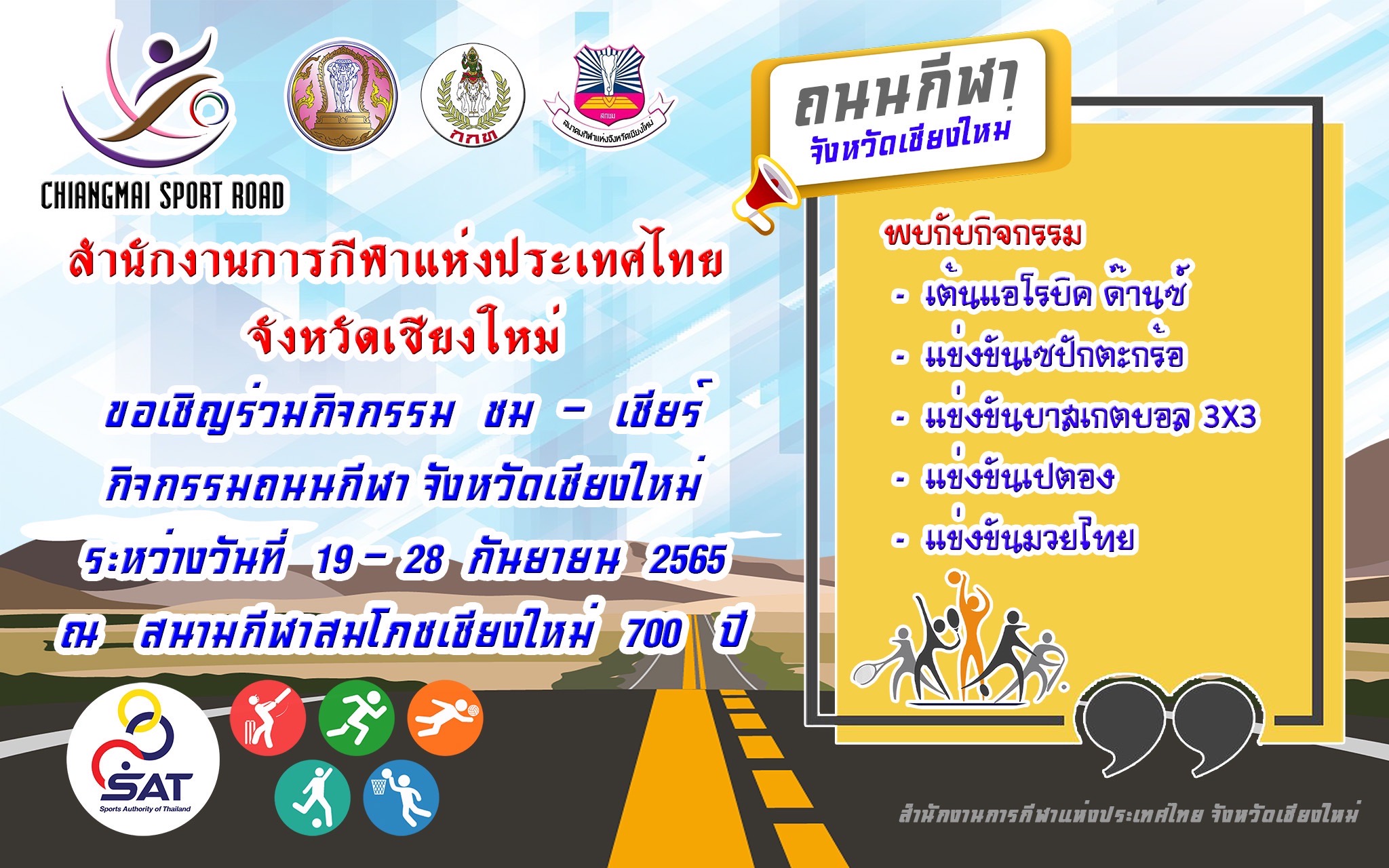 นายก่อพงศ์ นำบุญจิตต์ ผอ. กกท. จ.เชียงใหม่ เผยว่ากิจกรรมถนนกีฬา จ.เชียงใหม่ ประจำปีงบประมาณ 2565 ณ สนามกีฬาสมโภชเชียงใหม่ 700 ปี โดยดำเนินกิจกรรมแข่งขัน 5 ชนิดกีฬา