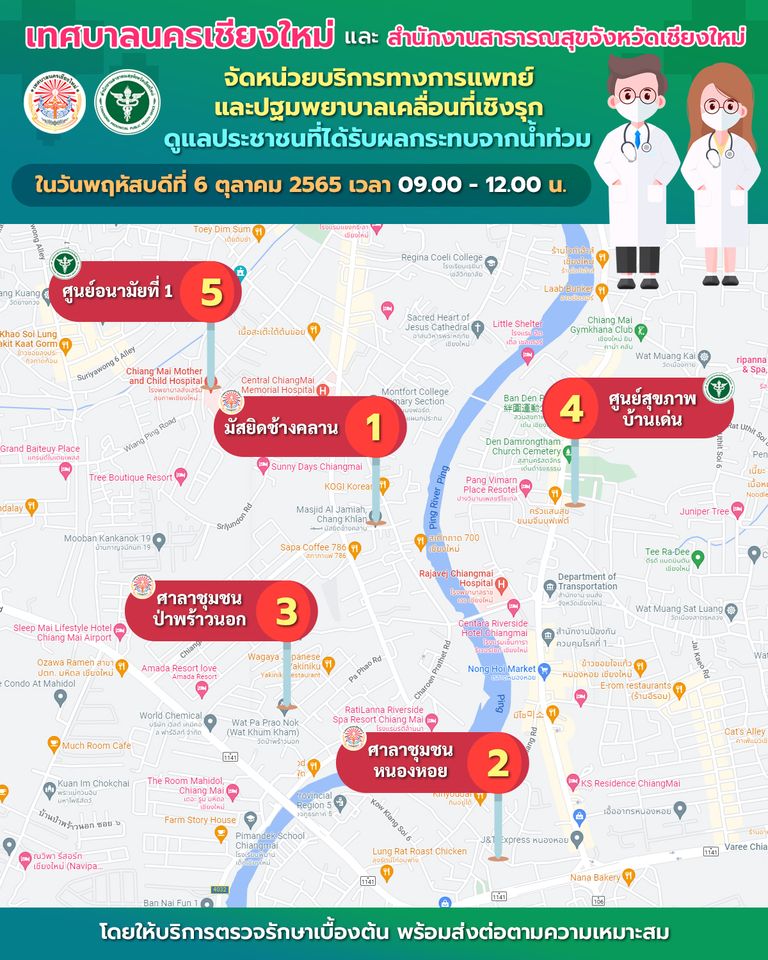 วันที่ 6 ตุลาคม 2565 นายอัศนี บูรณุปกรณ์ นายกเทศมนตรีนครเชียงใหม่ มอบหมายให้ นายพิศุทธ์ พิศุทธกุล นายวีรวิชญ์ ธีรสวัสดิ์ ที่ปรึกษานายกเทศมนตรีนครเชียงใหม่ พร้อมด้วย สมาชิกสภาเทศบาล และผู้อำนวยการกองยุทธศาสตร์และงบประมาณ ตรวจเยี่ยมจุดจัดหน่วยบริการทางการแพทย์ และปฐมพยาบาลเคลื่อนที่เชิงรุก เพื่อดูแลประชาชนที่ได้รับผลกระทบจากน้ำท่วม โดยเป็นความร่วมมือระหว่างเทศบาลนครเชียงใหม่ และ สำนักงานสาธารณสุขจังหวัดเชียงใหม่ จัดหน่วยบริการทางการแพทย์ จำนวน 5 จุดไว้ให้บริการแก่ผู้ประสบภัยน้ำท่วม ได้แก่