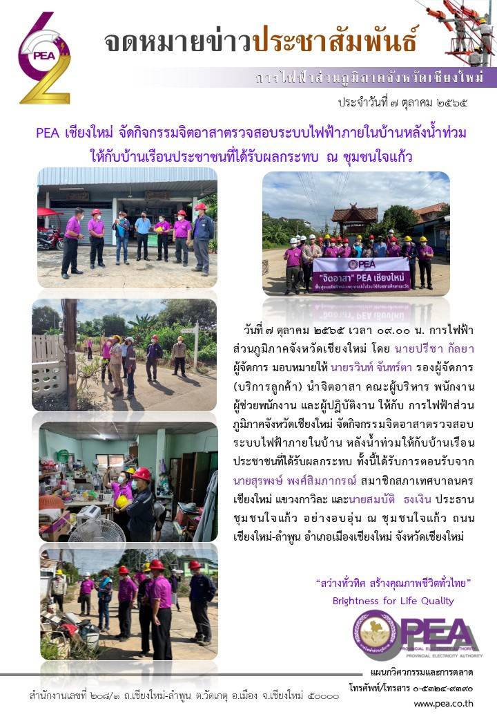 วันที่ 7 ตุลาคม 2565 เวลา 09.00 น. การไฟฟ้าส่วนภูมิภาคจังหวัดเชียงใหม่ โดย นายปรีชา กัลยา ผู้จัดการ มอบหมายให้ นายรวินท์ จันทร์ตา รองผู้จัดการ (บริการลูกค้า) นำจิตอาสา คณะผู้บริหาร พนักงาน ผู้ช่วยพนักงาน และผู้ปฏิบัติงาน ให้กับการไฟฟ้าส่วนภูมิภาคจังหวัดเชียงใหม่ จัดกิจกรรมจิตอาสาตรวจสอบระบบไฟฟ้าภายในบ้าน หลังน้ำท่วมให้กับบ้านเรือนประชาชนที่ได้รับผลกระทบ ทั้งนี้ได้รับการต้อนรับจาก นายสุรพงษ์ พงศ์สิมภากรณ์ สมาชิกสภาเทศบาลนครเชียงใหม่ แขวงกาวิละ และนายสมบัติ ธงเงิน ประธานชุมชนใจแก้ว อย่างอบอุ่น ณ ชุมชนใจแก้ว ถนนเชียงใหม่-ลำพูน อำเภอเมือง จังหวัดเชียงใหม่