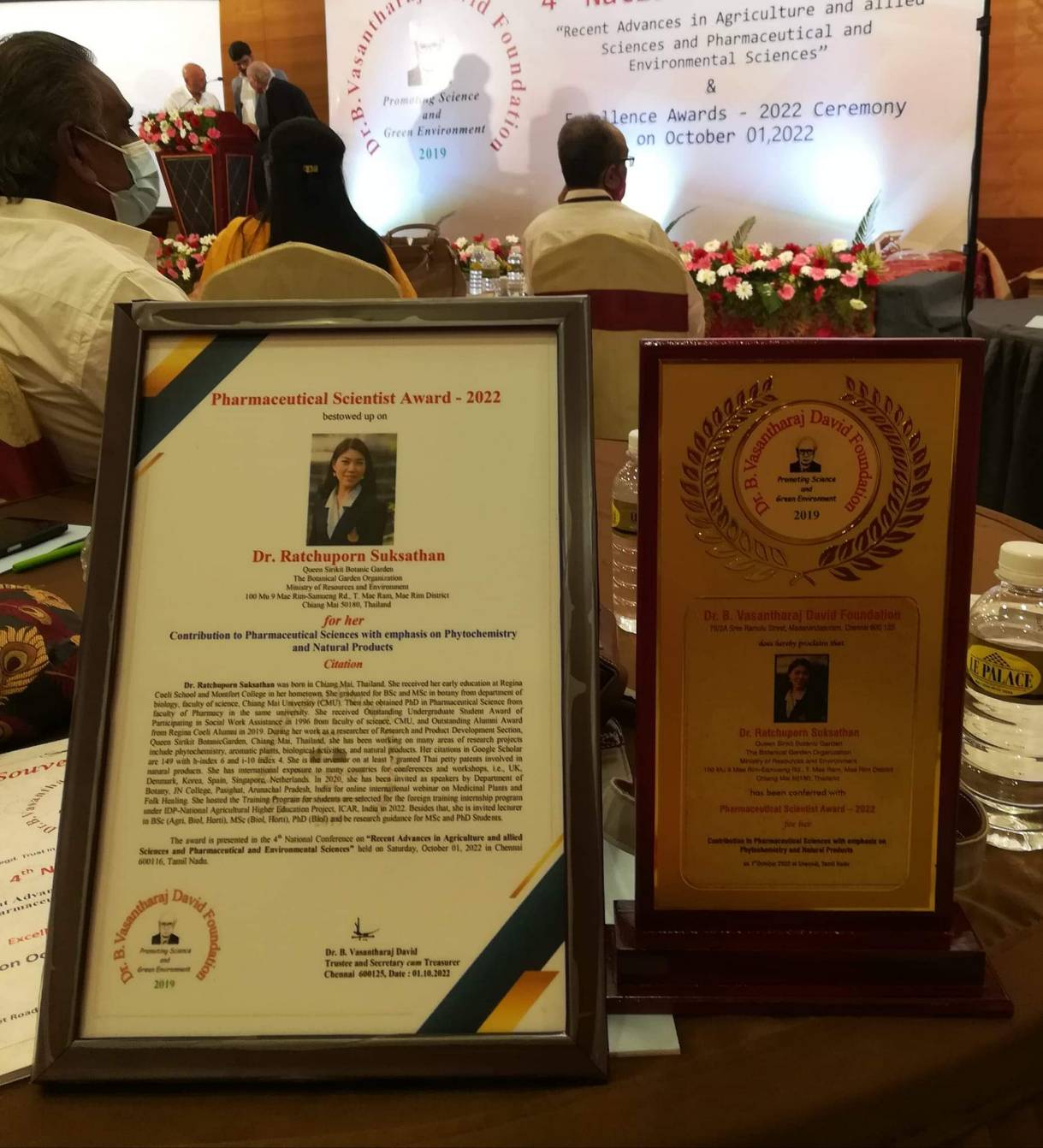 ดร.รัชชุพร สุขสถาน นักวิชาการพฤกษศาสตร์ 7 กลุ่มงานวิจัยเพื่อการพัฒนาและสร้างผลิตภัณฑ์ สำนักวิจัยและอนุรักษ์ สวนพฤกษศาสตร์สมเด็จพระนางเจ้าสิริกิติ์ องค์การสวนพฤกษศาสตร์ ได้รับรางวัลสาขา Pharmaceutical Scientist Award 2022 ซึ่งเป็นรางวัลนักวิจัย สาขาวิทยาศาสตร์เภสัชกรรมดีเด่น ประจำปี 2022 ในด้านพฤกษเคมี และผลิตภัณฑ์ธรรมชาติ โดยมูลนิธิ ดร.บี วสันตราช เดวิด (Dr. B. Vasantharaj David Foundation) ประเทศอินเดีย ที่ก่อตั้งขึ้นในปี 2019 ซึ่งมีคำขวัญ คือ “ส่งเสริมวิทยาศาสตร์และสิ่งแวดล้อมสีเขียว” โดยรางวัลที่มอบนี้เพื่อเป็นเกียรติแก่นักวิทยาศาสตร์ชาวอินเดีย และนักวิชาการด้านการวิจัยในสาขาเกษตร/พิษวิทยา/เภสัช/วิทยาศาสตร์สิ่งแวดล้อม และด้านอื่นๆ ที่เกี่ยวข้องเป็นประจำทุกปี