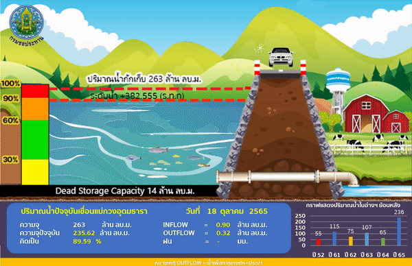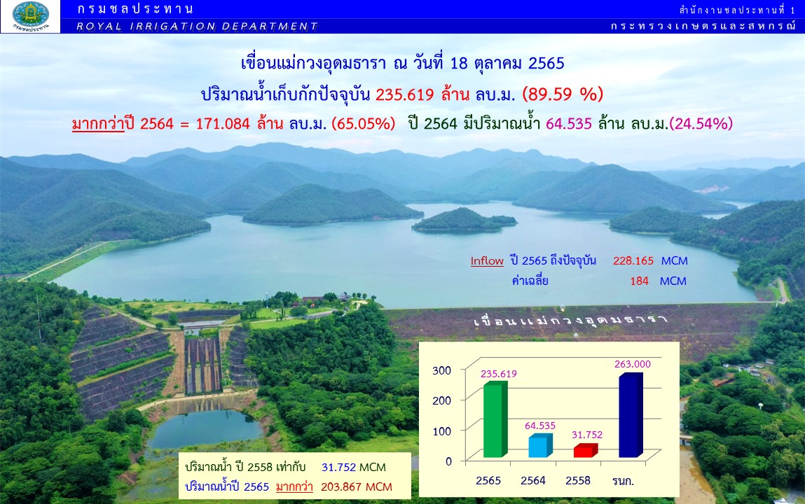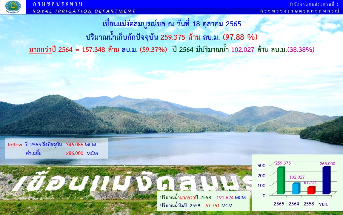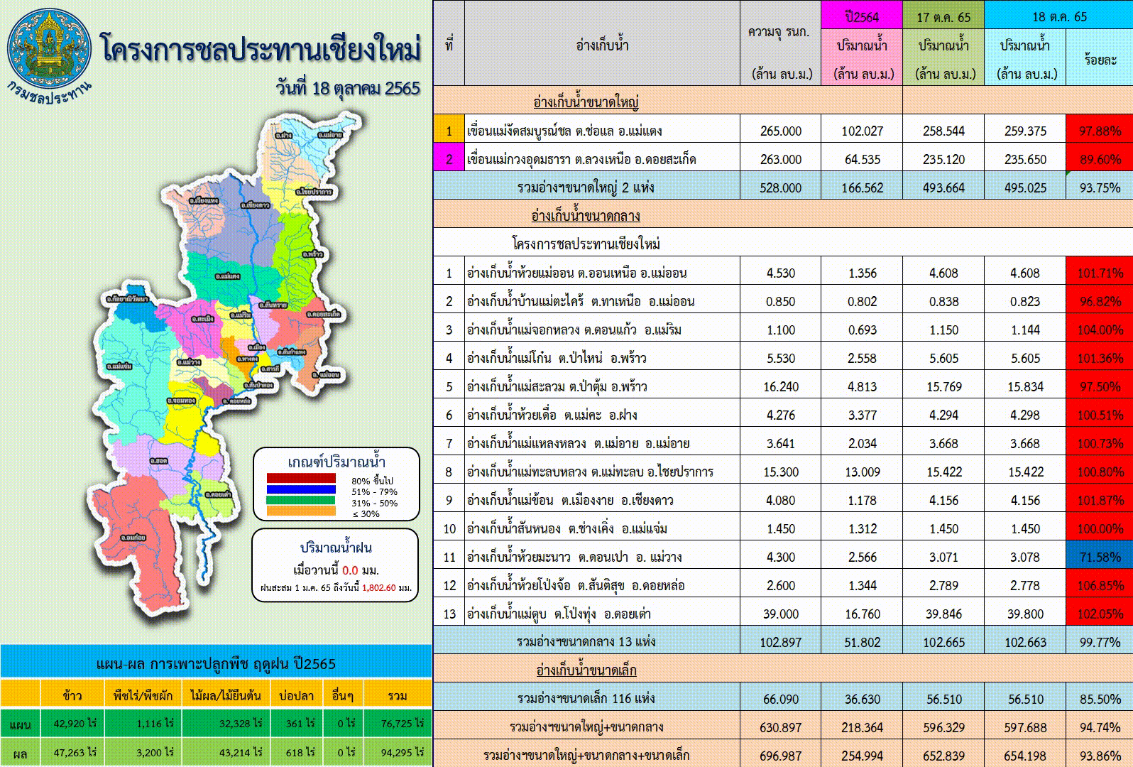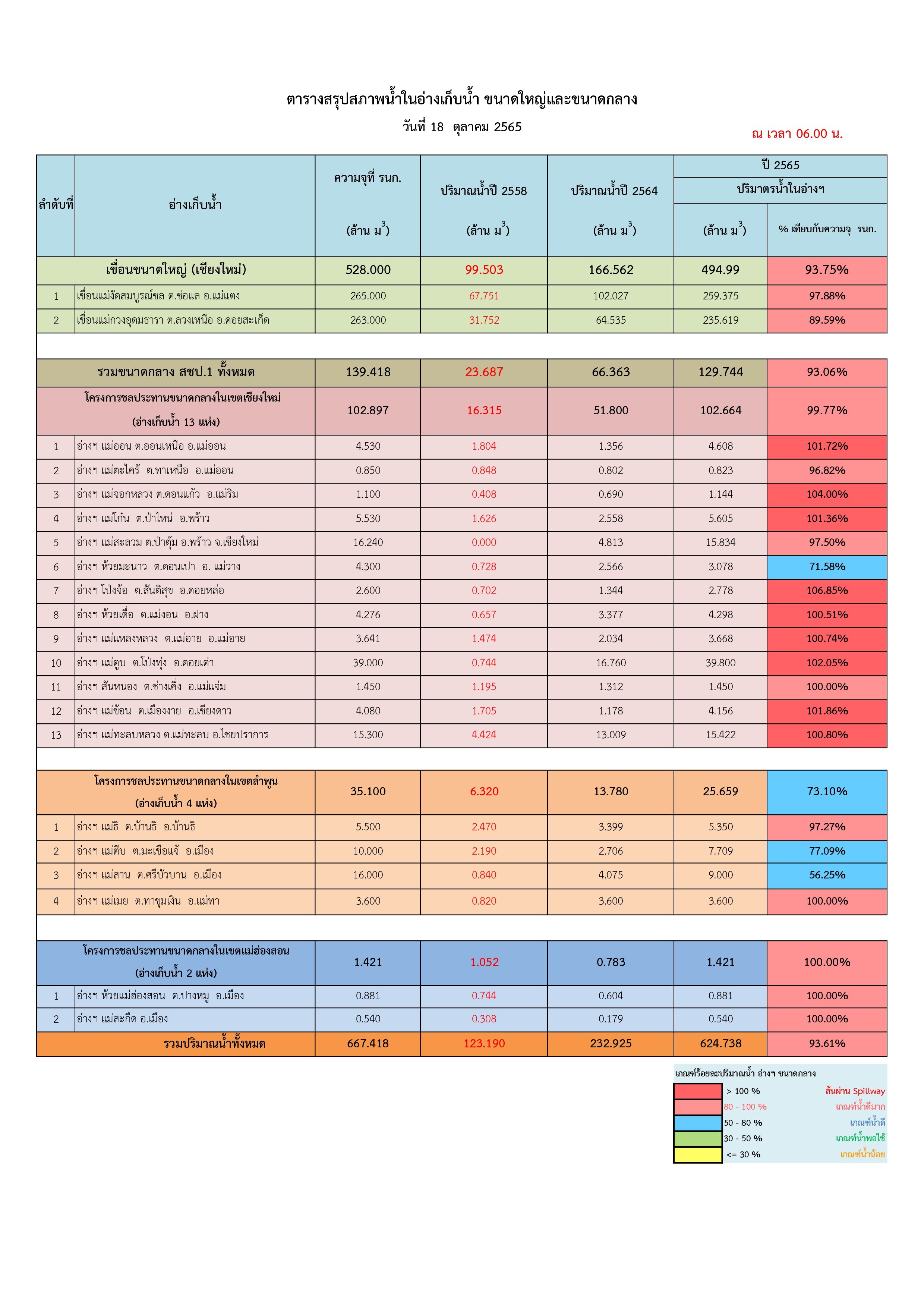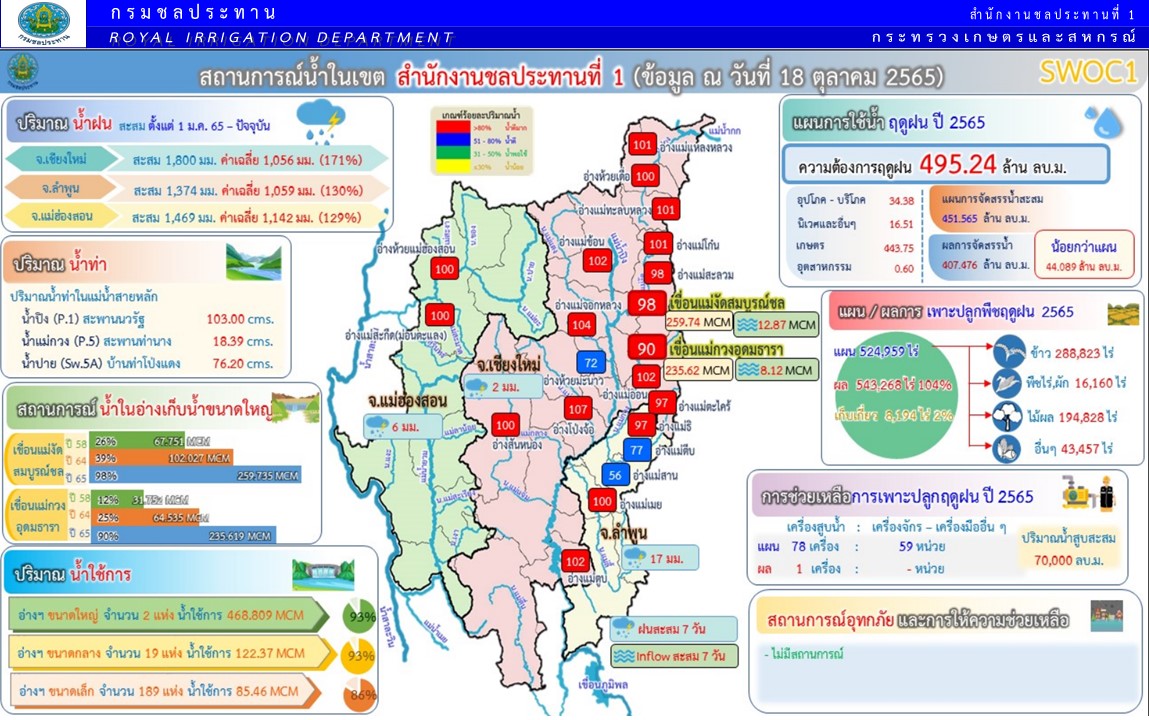 นายอภิวัฒน์ ภูมิไธสง ผู้อำนวยการส่วนจัดสรรน้ำและบริหาร สำนักงานชลประทานที่ 1 กล่าวว่า จากการติดตามข้อมูลศูนย์อุตุนิยมวิทยาภาคเหนือพบว่า ช่วงปลายเดือนตุลาคม จะมีปริมาณฝนตกลงมาอีกเพียงเล็กน้อย วันที่ 22 – 23 ตุลาคม จากสถานการณ์น้ำที่จังหวัดเชียงใหม่เป็นลุ่มน้ำปิงตอนบน เป็นแหล่งน้ำสำคัญที่จะส่งไปยังเขื่อนภูมิพล ทำให้ปริมาณน้ำในปีนี้ส่งไปเกินกว่าค่าเฉลี่ยค่อนข้างเยอะ และยังมีปริมาณน้ำไหลเข้าไปเพิ่มอีกอย่างต่อเนื่อง สำหรับสถานการณ์น้ำในเขื่อนขนาดใหญ่ของจังหวัดเชียงใหม่ เขื่อนแม่งัดสมบูรณ์ชล ปริมาณน้ำปัจจุบัน 259.37 ล้าน ลบ.ม. คิดเป็น 97.88 เปอร์เซ็นต์ เขื่อนแม่กวงอุดมธารา ปริมาณน้ำ 235.62 ล้าน ลบ.ม. คิดเป็น 89.59 เปอร์เซ็นต์ อ่างเก็บน้ำขนาดเล็ก จำนวน 19 แห่ง ปริมาณน้ำรวม 13. ล้าน ลบ.ม. คิดเป็น 93 เปอร์เซ็นต์ และอ่างเก็บน้ำขนาดเล็ก จำนวน 189 แห่ง ปริมาณน้ำรวม 83 ล้าน ลบ.ม. คิดเป็น 84 เปอร์เซ็นต์ และแสดงให้เห็นชัดเจนว่าน้ำมีปริมาณที่มากขึ้นอย่างชัดเจนมากที่สุดคือ อ่างเก็บน้ำแม่ตูบ จากเดิมที่มีปริมาณน้ำ 20 เปอร์เซ็นต์ ปัจจุบันมีน้ำเต็ม 100 เปอร์เซ็นต์ ซึ่งไม่เคยเกิดขึ้นมาก่อน