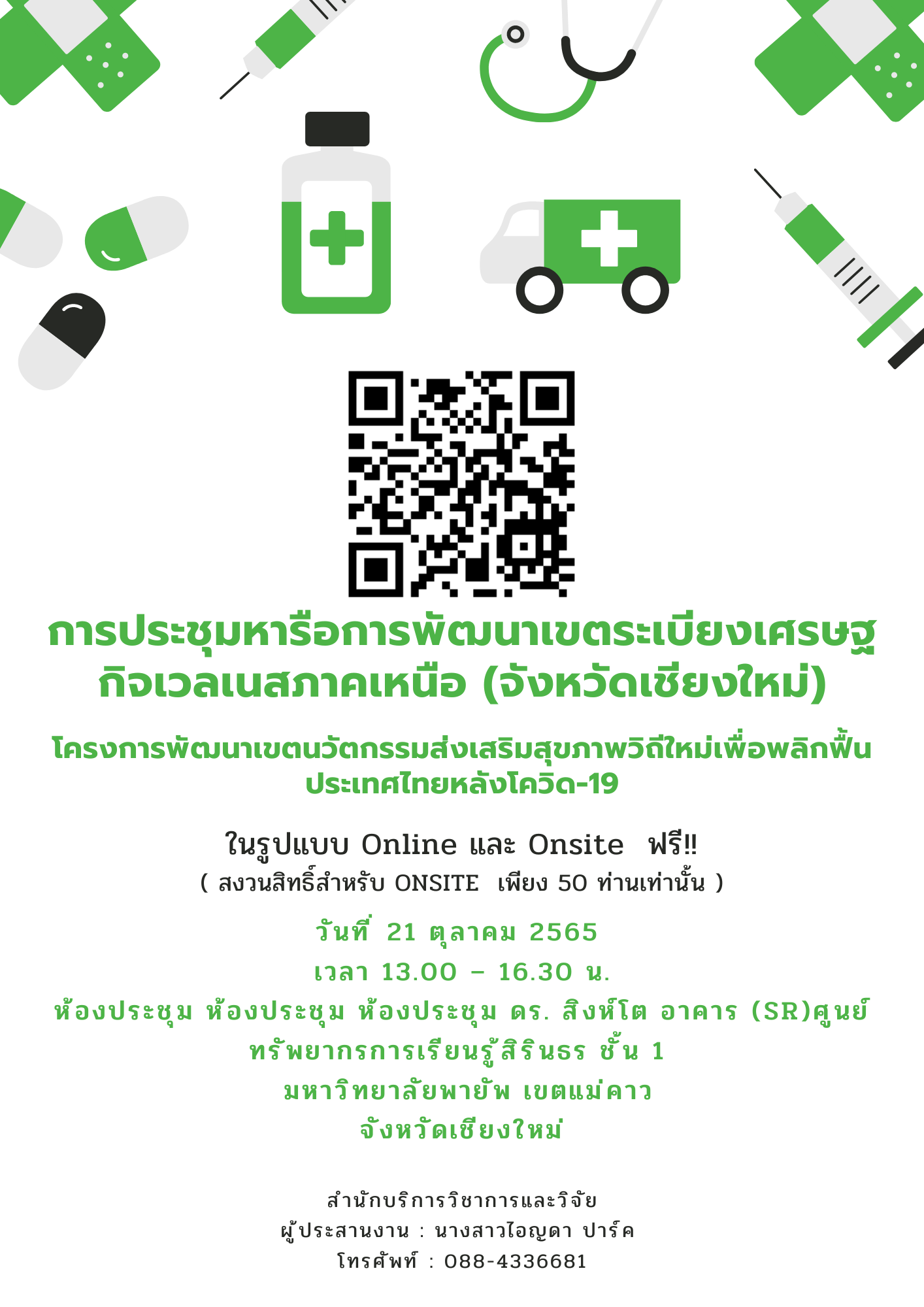 มหาวิทยาลัยพายัพ จะจัดประชุมหารือการพัฒนาเขตระเบียงเศรษฐกิจเวลเนสภาคเหนือ (จังหวัดเชียงใหม่) ในวันที่ 21 ตุลาคม 2565 เวลา 13.00 – 16.30 น. ณ ห้องประชุม ดร. สิงห์โต จ่างตระกูล อาคารศูนย์ทรัพยากรการเรียนรู้สิรินธร มหาวิทยาลัยพายัพ เขตแม่คาว ในรูปแบบ Online และ Onsite โดยการสนับสนุนของหน่วยบริหารและจัดการทุนด้านการพัฒนาระดับพื้นที่ (บพท.) และองค์กรเครือข่าย
