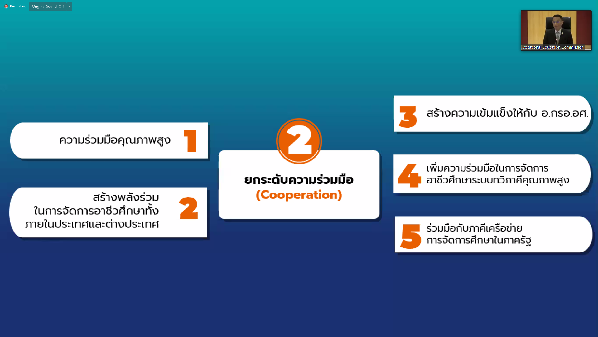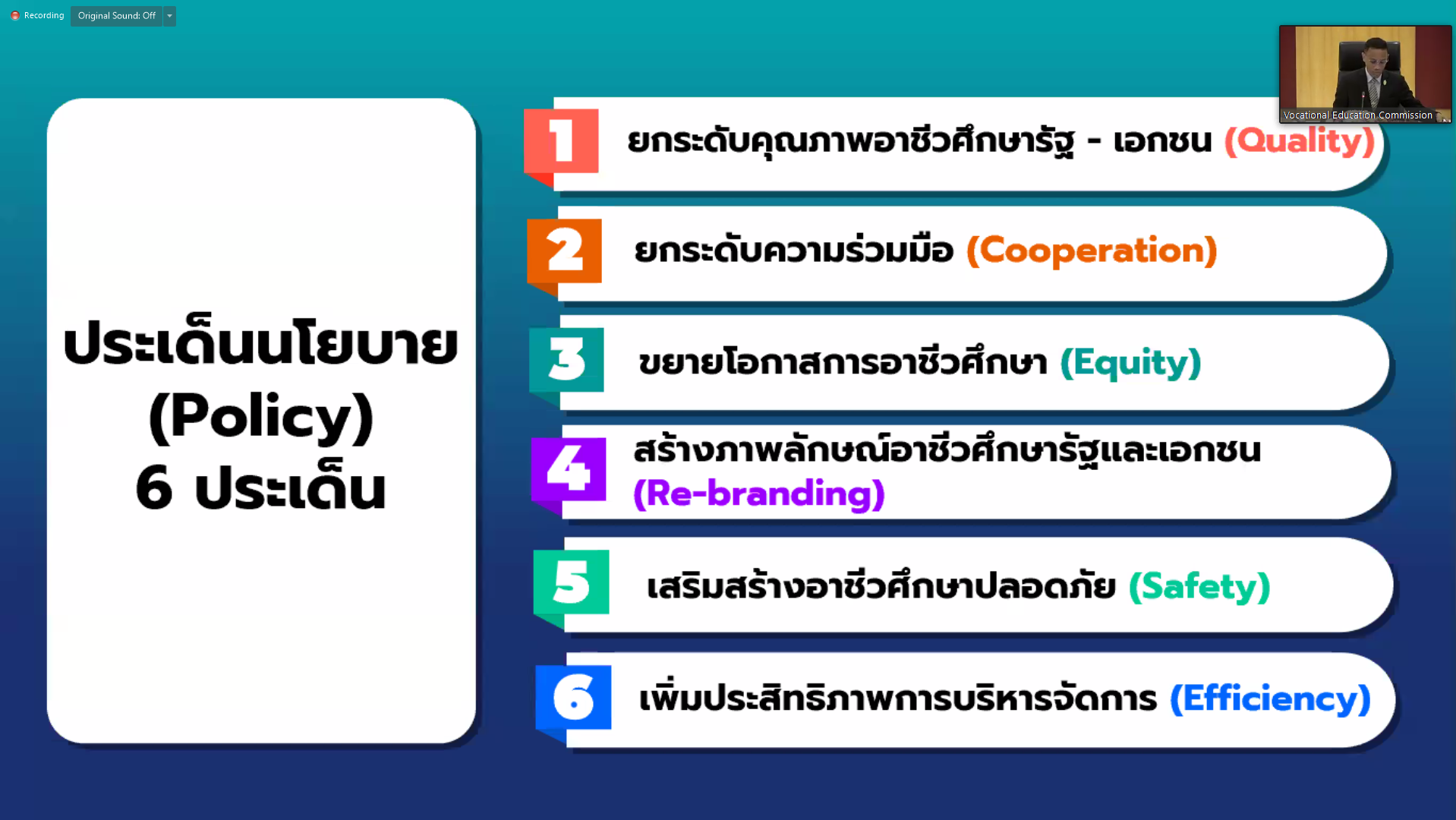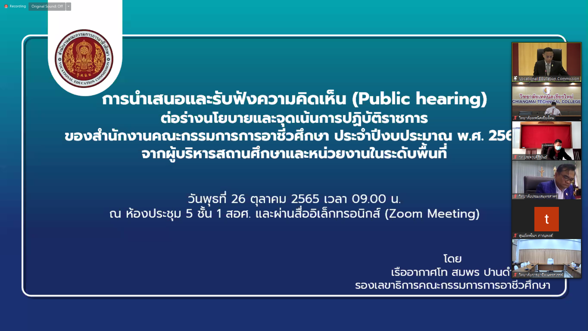วันที่ 26 ตุลาคม พ.ศ. 2565 นายวัชรพงศ์ ฝั้นติ๊บ ผู้อำนวยการ วิทยาลัยเทคนิคเชียงใหม่ ประธานกรรมการอาชีวศึกษาจังหวัดเชียงใหม่ พร้อมด้วย ผู้บริหารสถานศึกษาสังกัดอาชีวศึกษาจังหวัดเชียงใหม่ เข้าร่วมประชุมพิจารณาร่างนโยบายและจุด เน้นการปฏิบัติราชการ ของสำนักงานคณะกรรมการการอาชีวศึกษา ประจำปีงบประมาณ พ.ศ. 2566 เพื่อแสดงความคิดเห็น และให้ข้อเสนอแนะ ในการวางแผนนโยบาย จุดเน้น ในการปฏิบัติราชการของสถานศึกษา ในสังกัดสำนักคณะกรรมการการอาชีวศึกษา ผ่านระบบ Zoom Meeting จัดโดย สำนักงานคณะกรรมการการอาชีวศึกษา กระทรวงศึกษาธิการ