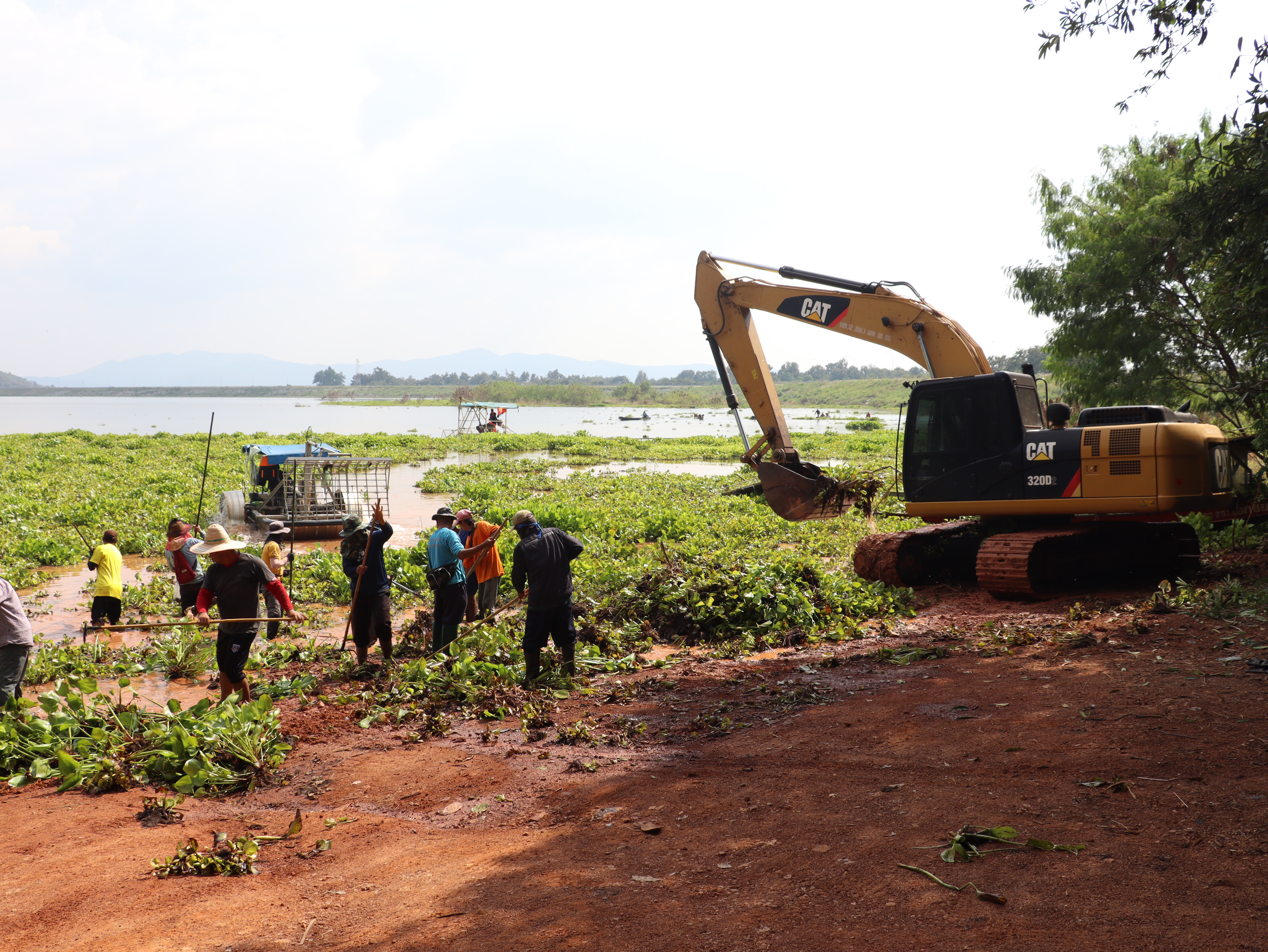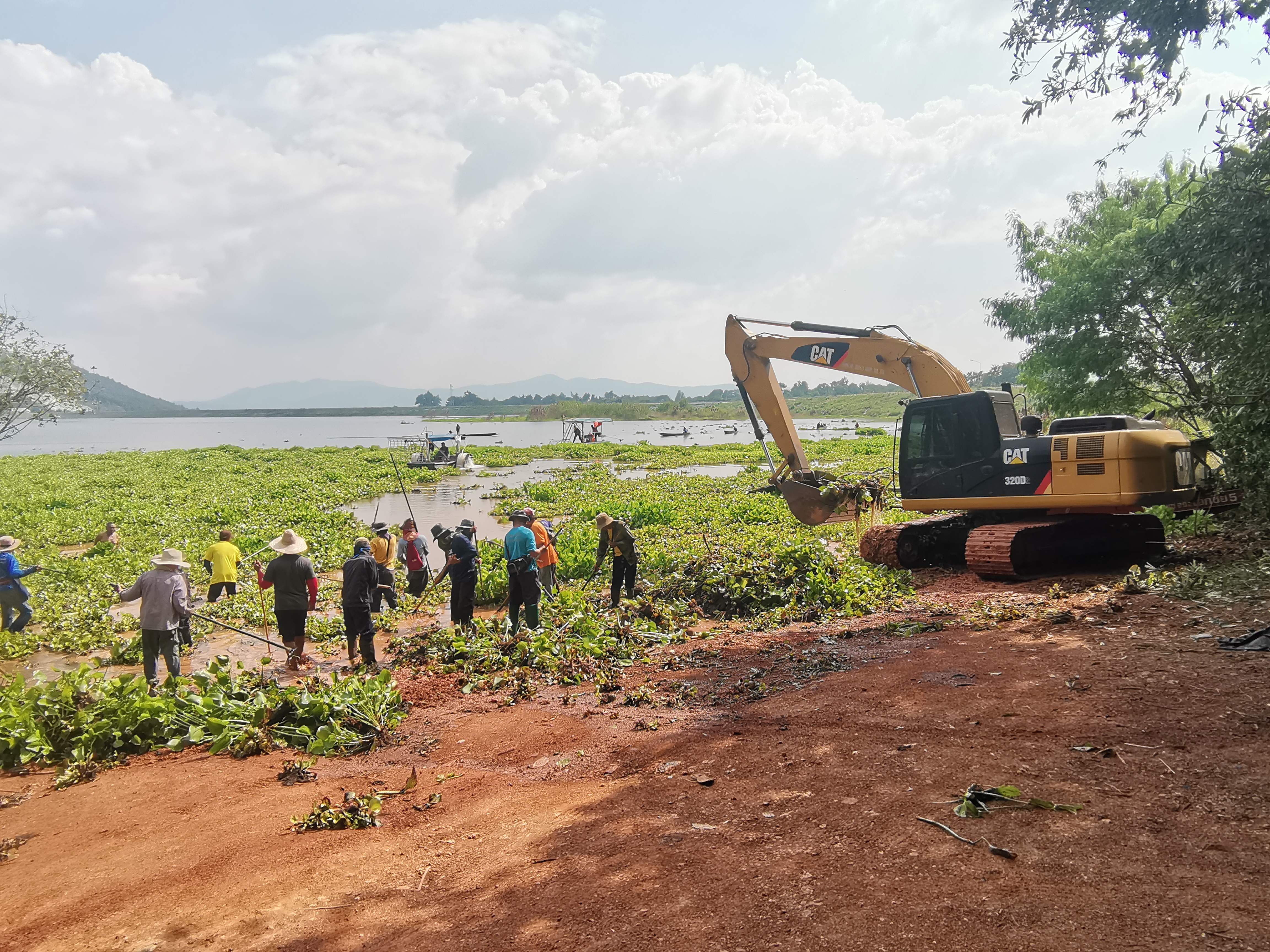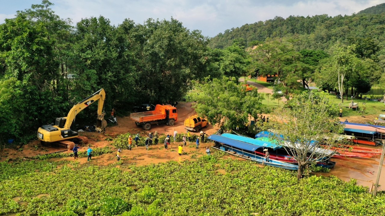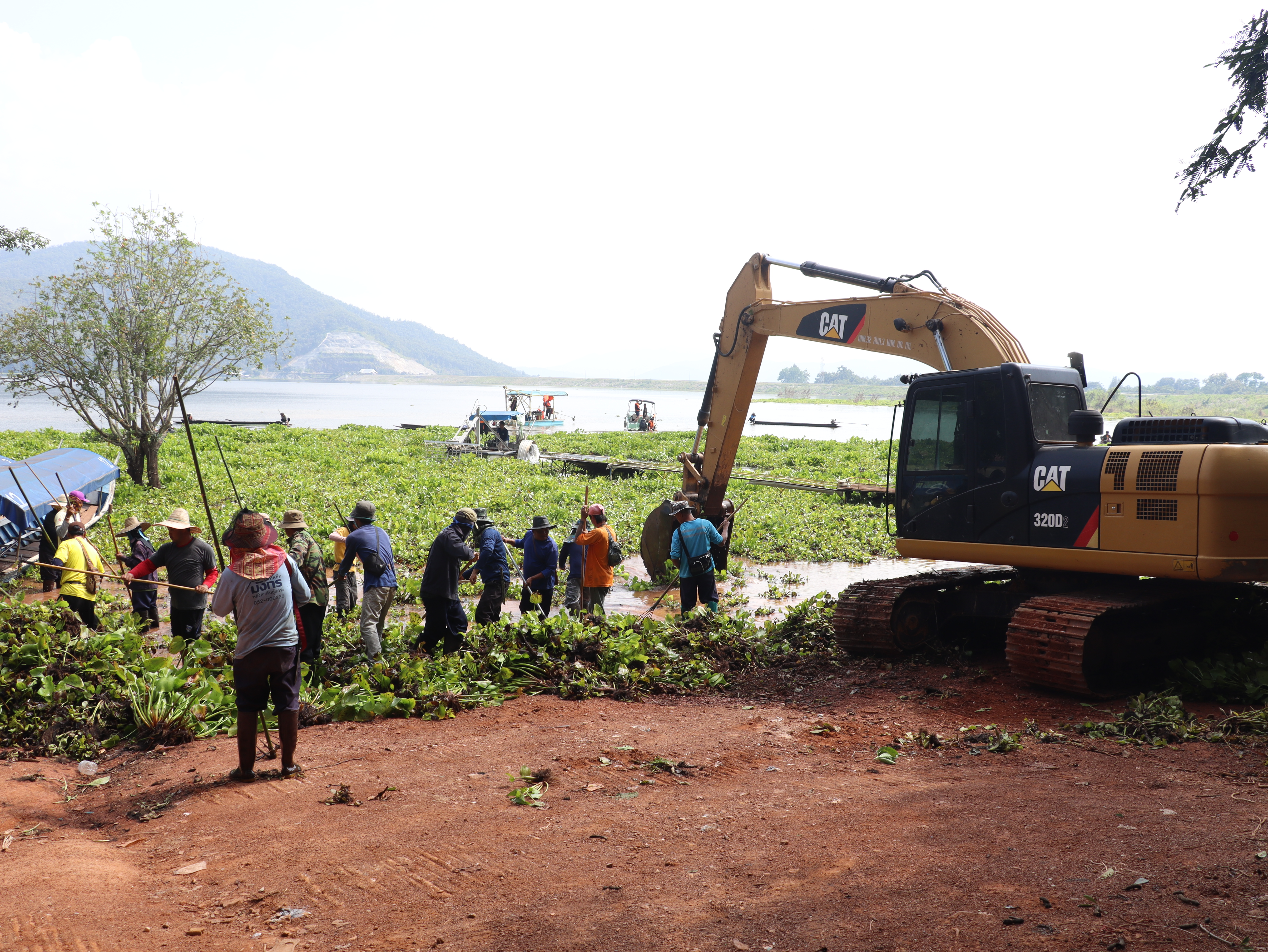วันที่ 25 ต่อเนื่องถึงวันที่ 27 ต.ค. 65 นายชัยณรงค์ นันตาสาย นอภ.แม่แตง พร้อมด้วย นายเฉลิมเกียรติ อินทกนก ผู้อำนวยการ โครงการส่งน้ำและบำรุงรักษาแม่แฝก-แม่งัดสมบูรณ์ชล นำกำลังเจ้าหน้าที่ฝ่ายปกครอง อ.แม่แตง เจ้าหน้าที่โครงการส่งน้ำและบำรุงรักษาแม่แฝก เจ้าหน้าที่อุทยานแห่งชาติศรีลานนา เจ้าหน้าที่โรงไฟฟ้าเขื่อนแม่งัดสมบูรณ์ชล ชาวบ้าน อ.แม่แตง และผู้ประกอบการแพท่องเที่ยวเขื่อนแม่งัด รวมกว่า 200 คน พร้อมกับเครื่องจักรกล และเรือกำจัดวัชพืชในน้ำ ช่วยกันกำจัดผีกตบชวาที่ไหลมารวมกันหน้าที่ทำการอุทยานแห่งชาติศรีลานนา หลังเจ้าหน้าที่และชาวประมงพื้นบ้าน ตลอดจนผู้ประกอบการแพท่องเที่ยว นำเรือหางยาวและเรือกำจัดวัชพืชในน้ำรวม 20 ลำ ช่วยกันผลักผักตบชวาที่ลอยอยู่ตามจุดต่างๆ หน้าเขื่อนมารวมกัน ก่อนจะใช้รถแบ็คโฮตักผักตบขึ้นรถบรรทุกนำไปกองรวมกันไว้