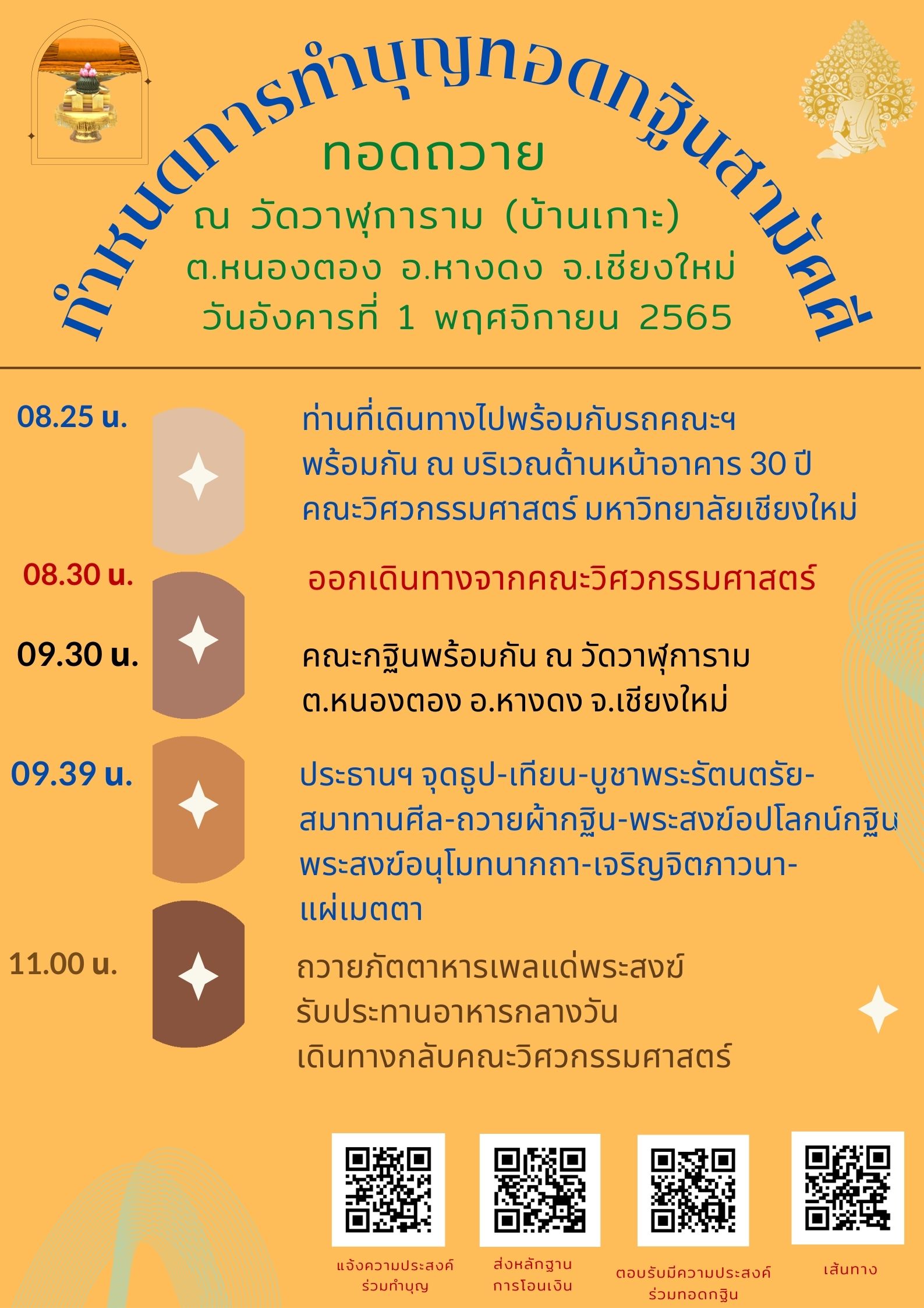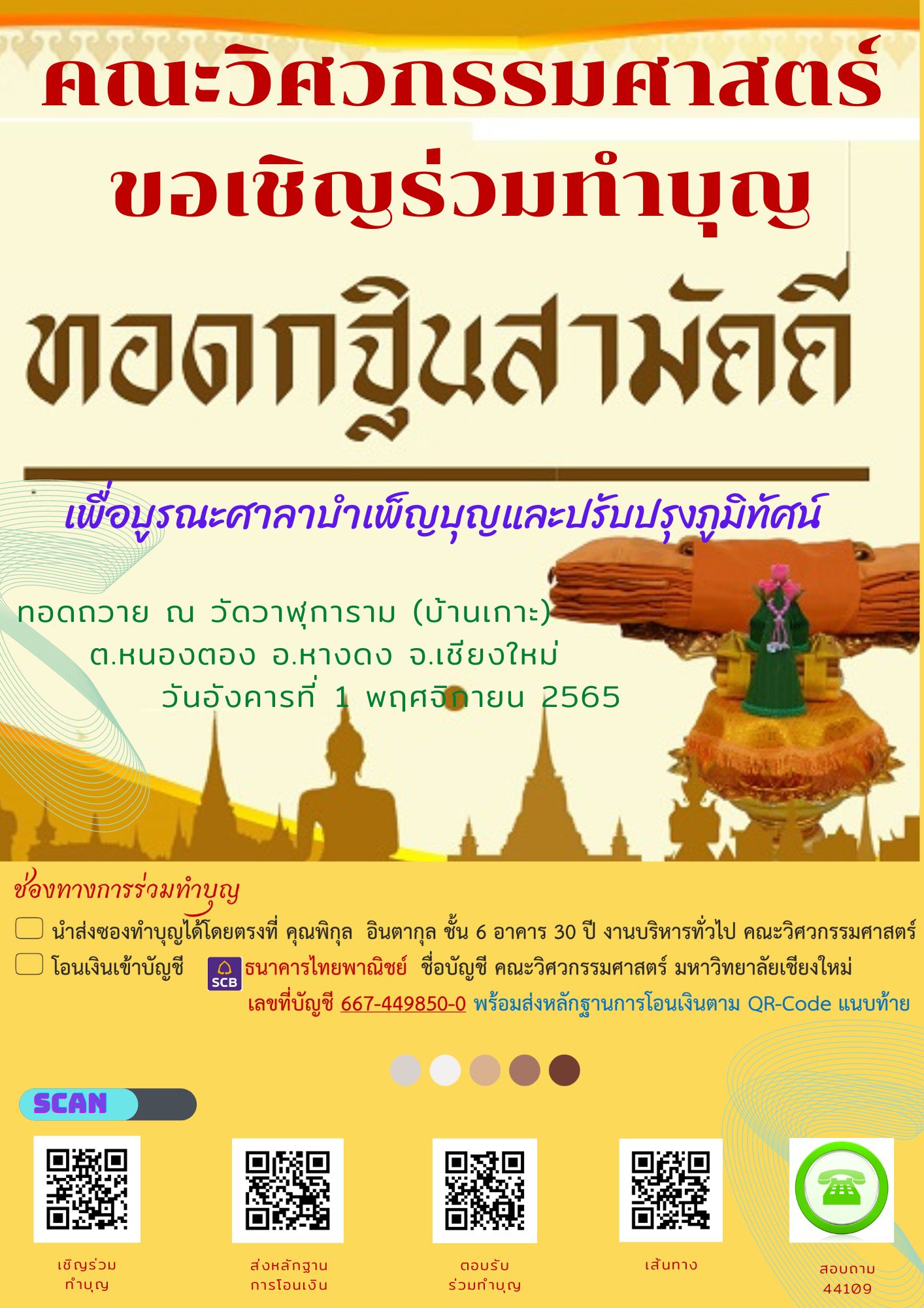 คณะวิศวกรรมศาสตร์ มหาวิทยาลัยเชียงใหม่ ขอเชิญร่วมทำบุญทอดกฐินสามัคคีเพื่อบูรณะศาลาบำเพ็ญบุญและปรับปรุงภูมิทัศน์ ทอดถวาย ณ วัดวาฬุการาม (บ้านเกาะ) ตำบลหนองตอง อำเภอหางดง จังหวัดเชียงใหม่ ในวันอังคารที่ 1 พฤศจิกายน 2565