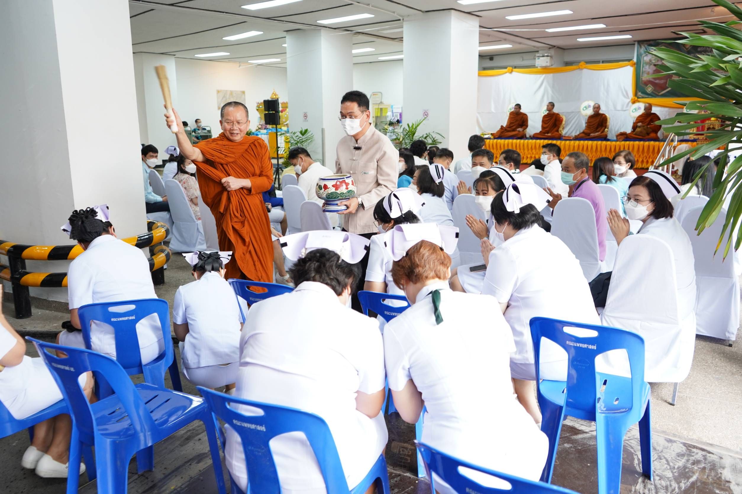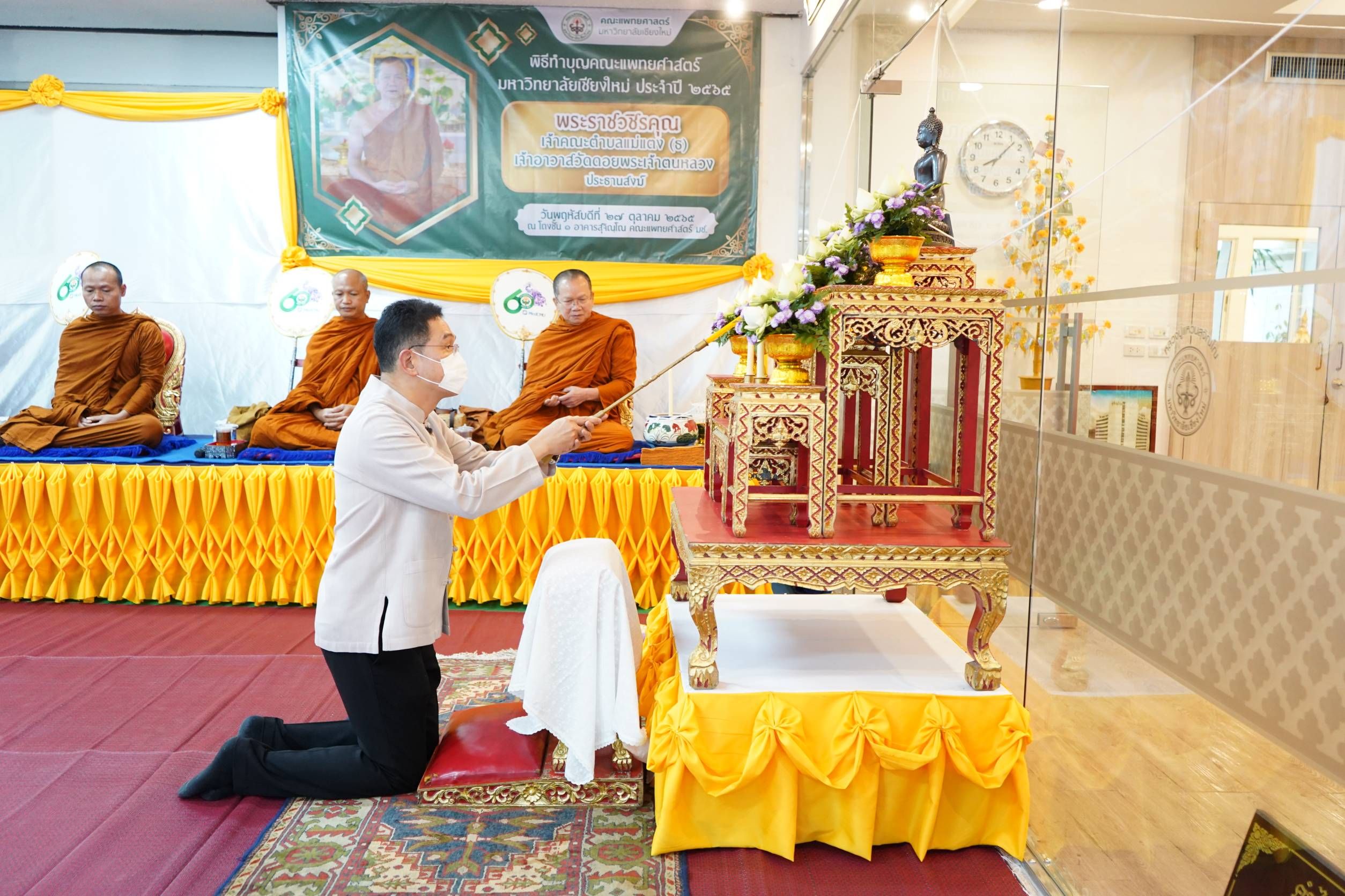 พระราชวชิรคุณ เจ้าคณะตำบลแม่แตง (ธ) เจ้าอาวาสวัดดอยพระเจ้าตนหลวง อ.แม่แตง จ.เชียงใหม่ เป็นประธานสงฆ์ ในพิธีทำบุญคณะแพทยศาสตร์ มช. ครบ 63 ปี โดยมี ศ.(เชี่ยวชาญพิเศษ) นพ.บรรณกิจ โลจนาภิวัฒน์ คณบดีคณะแพทยศาสตร์ มช.เป็นประธานฝ่ายฆราวาส จุดธูปเทียนบูชาพระรัตนตรัย และนำคณะผู้บริหาร พร้อมบุคลากรคณะแพทยศาสตร์ มช.เข้าร่วมในพิธีทำบุญเพื่อความเป็นสิริมงคลในโอกาส วันสถาปนาคณะแพทยศาสตร์ ครบ 63 ปี และอุทิศส่วนกุศลให้แก่ผู้เสียชีวิตที่โรงพยาบาลมหาราชนครเชียงใหม่ในรอบปีที่ผ่านมา เมื่อวันที่ 27 ตุลาคม 2565 ณ บริเวณโถงชั้น 1 อาคารสุจิณโณ คณะแพทยศาสตร์ มช.