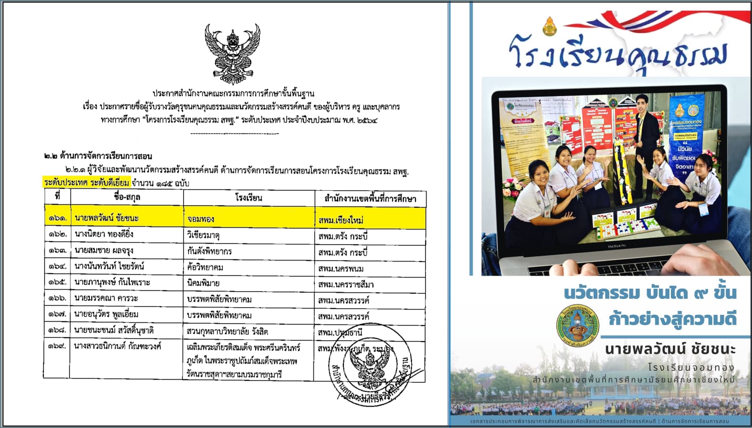 นายพลวัฒน์ ชัยชนะ ครูกลุ่มสาระการเรียนรู้สังคมศึกษา ศาสนาและวัฒนธรรม โรงเรียนจอมทอง ได้รับรางวัล คุรุชนคนคุณธรรม “ระดับประเทศ” และได้รับรางวัล ผู้วิจัยและพัฒนานวัตกรรมสร้างสรรค์คนดี ด้านการจัดการเรียนการสอน “ระดับประเทศ ระดับดีเยี่ยม” จาก สำนักงานคณะกรรมการการศึกษาขั้นพื้นฐาน (สพฐ.) โครงการโรงเรียนคุณธรรม สพฐ. ประจำปี พ.ศ. 2564