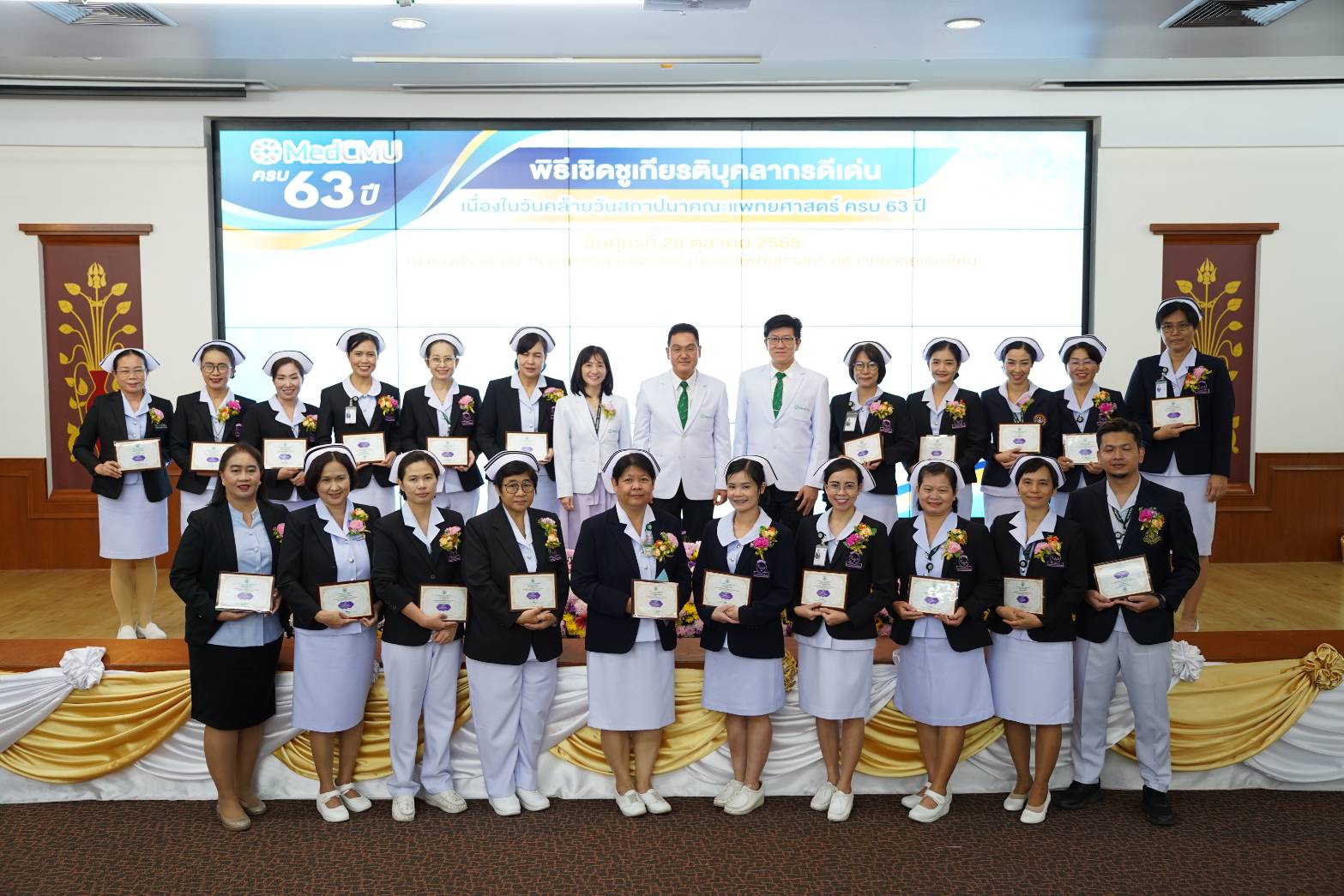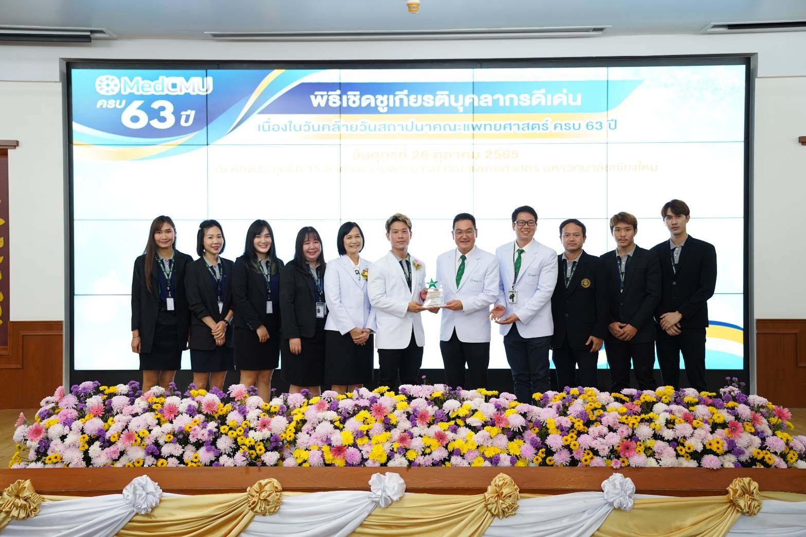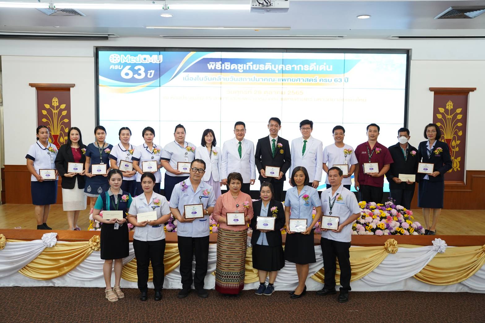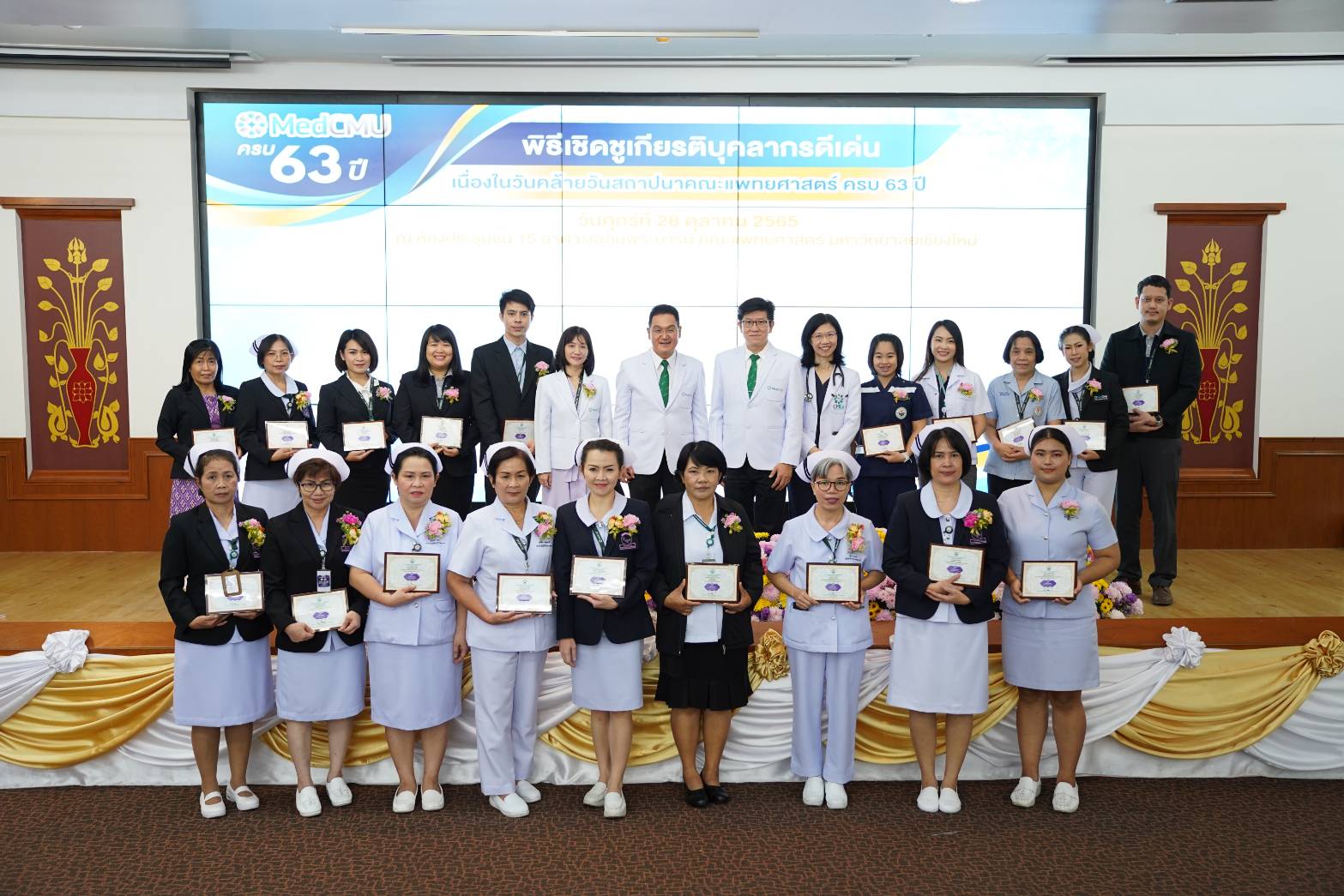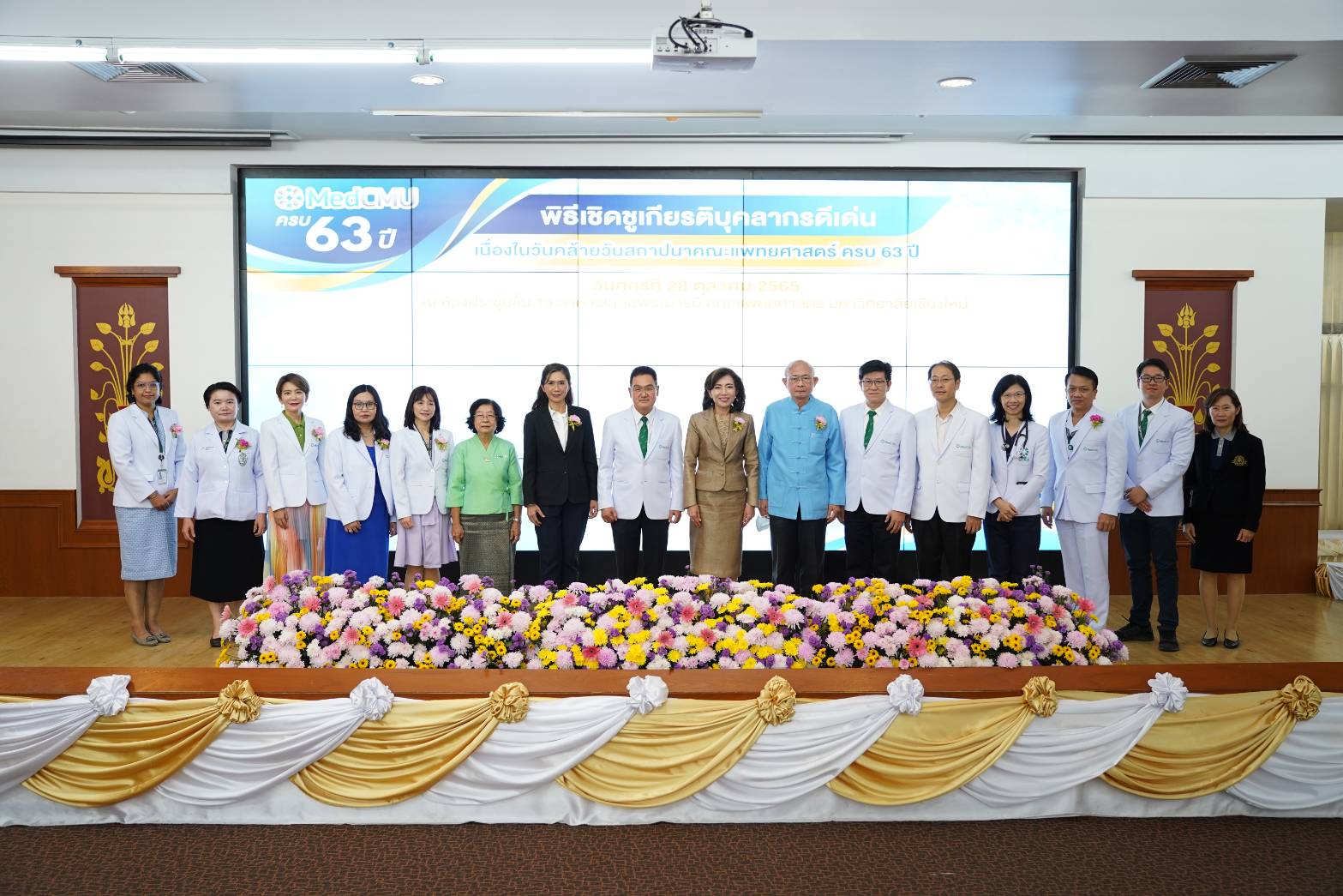 ศ.(เชี่ยวชาญพิเศษ) นพ.บรรณกิจ โลจนาภิวัฒน์ คณบดีคณะแพทยศาสตร์ มช. เป็นประธานในพิธีเชิดชูเกียรติบุคลากรดีเด่น เนื่องในโอกาสวันคล้ายวันสถาปนาคณะแพทยศาสตร์ มช. ครบ 63 ปี โดยจัดให้มีพิธีมอบโล่ เกียรติบัตร รางวัล และทุน ดังนี้