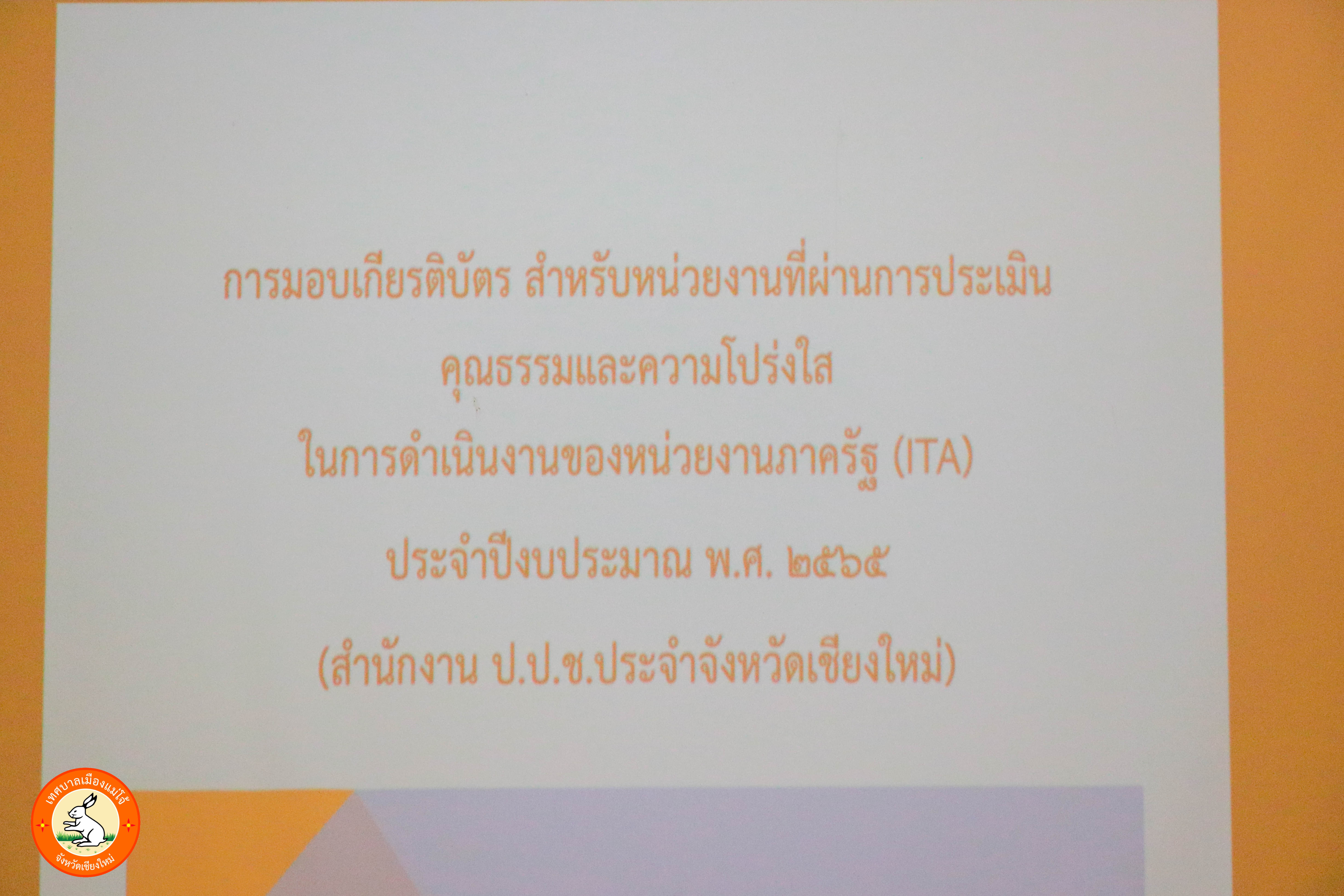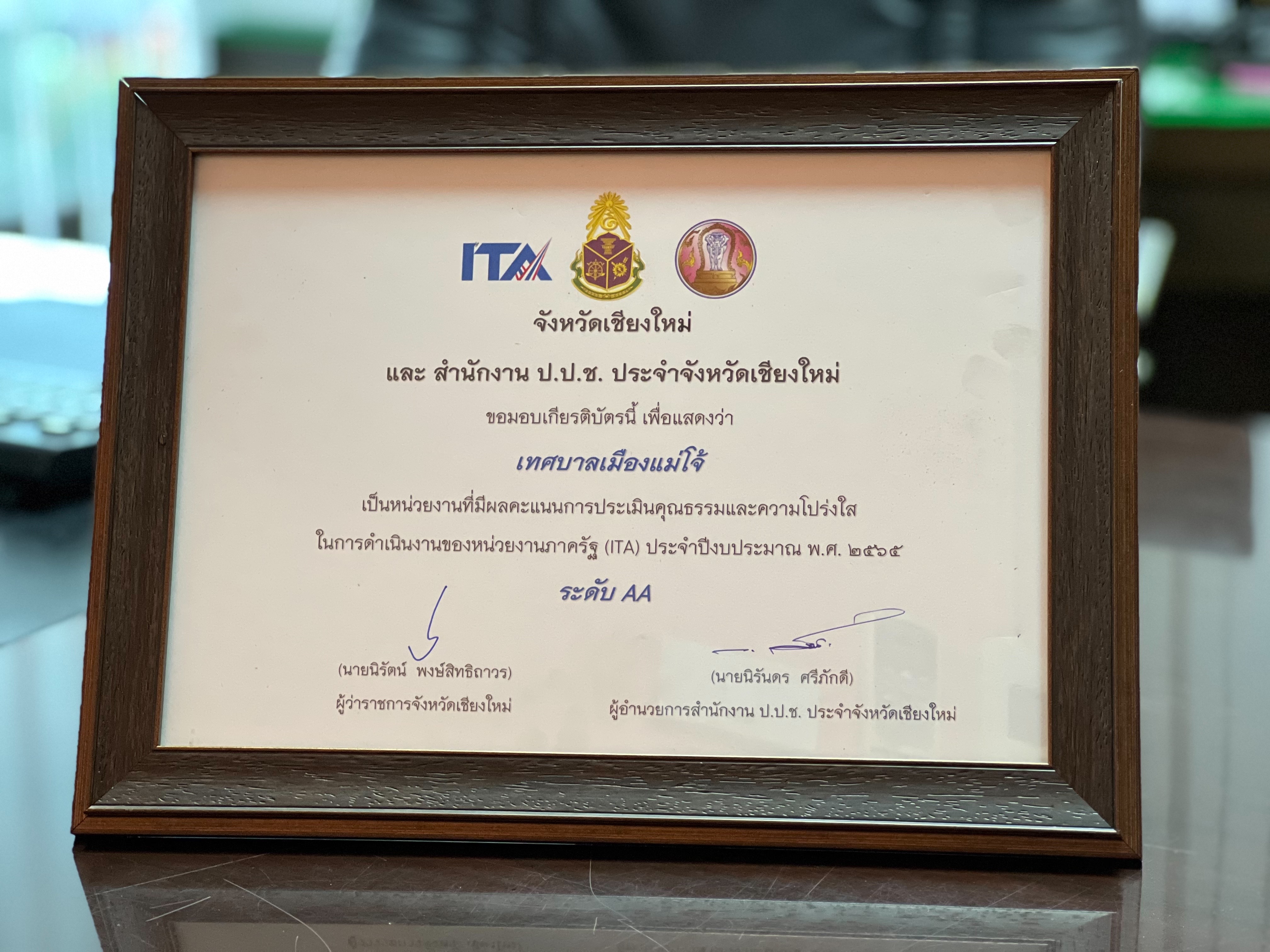 เทศบาลเมืองแม่โจ้ เข้ารับรางวัลการประเมินคุณธรรมและความโปร่งใสในการดำเนินงานของหน่วยงานภาครัฐ (ITA) ประจำปีงบประมาณ พ.ศ. 2565 (สำนักงาน ป.ป.ช.ประจำจังหวัดเชียงใหม่)