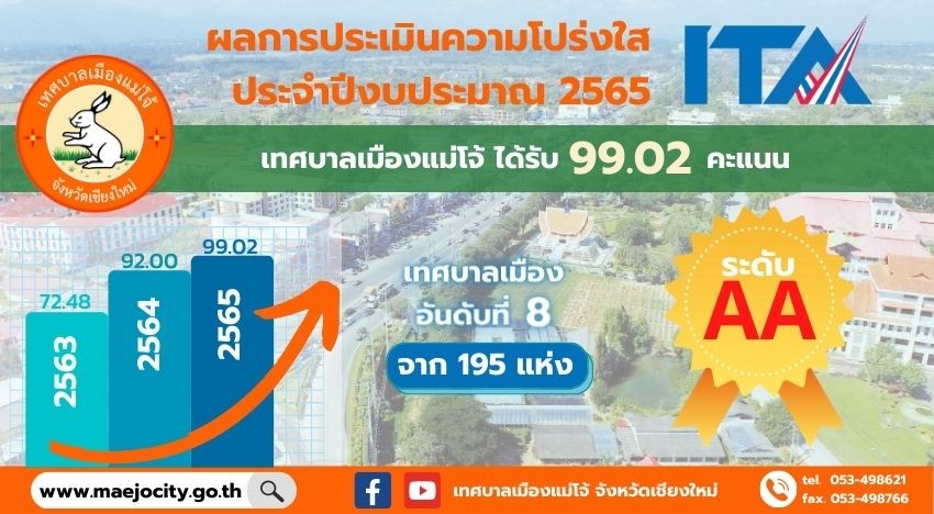 โดยการคัดเลือกจากหน่วยงานที่ได้รับคะแนนการประเมินฯ ตั้งแต่ 99 คะแนนขึ้นไป ซึ่งเทศบาลเมืองแม่โจ้ ได้คะแนนการประเมินฯ ที่ 99.02 คะแนน (ระดับ AA) ซึ่งเป็นอันดับที่ 8 จากเทศบาลเมืองทั่วประเทศ จำนวน 195 แห่ง โดยเทศบาลเมืองแม่โจ้ มีเป้าหมายในปี 2566 ที่จะพัฒนาประสิทธิภาพการทำงานและความโปร่งใส สามารถตรวจสอบได้ให้ดียิ่งขึ้นไป