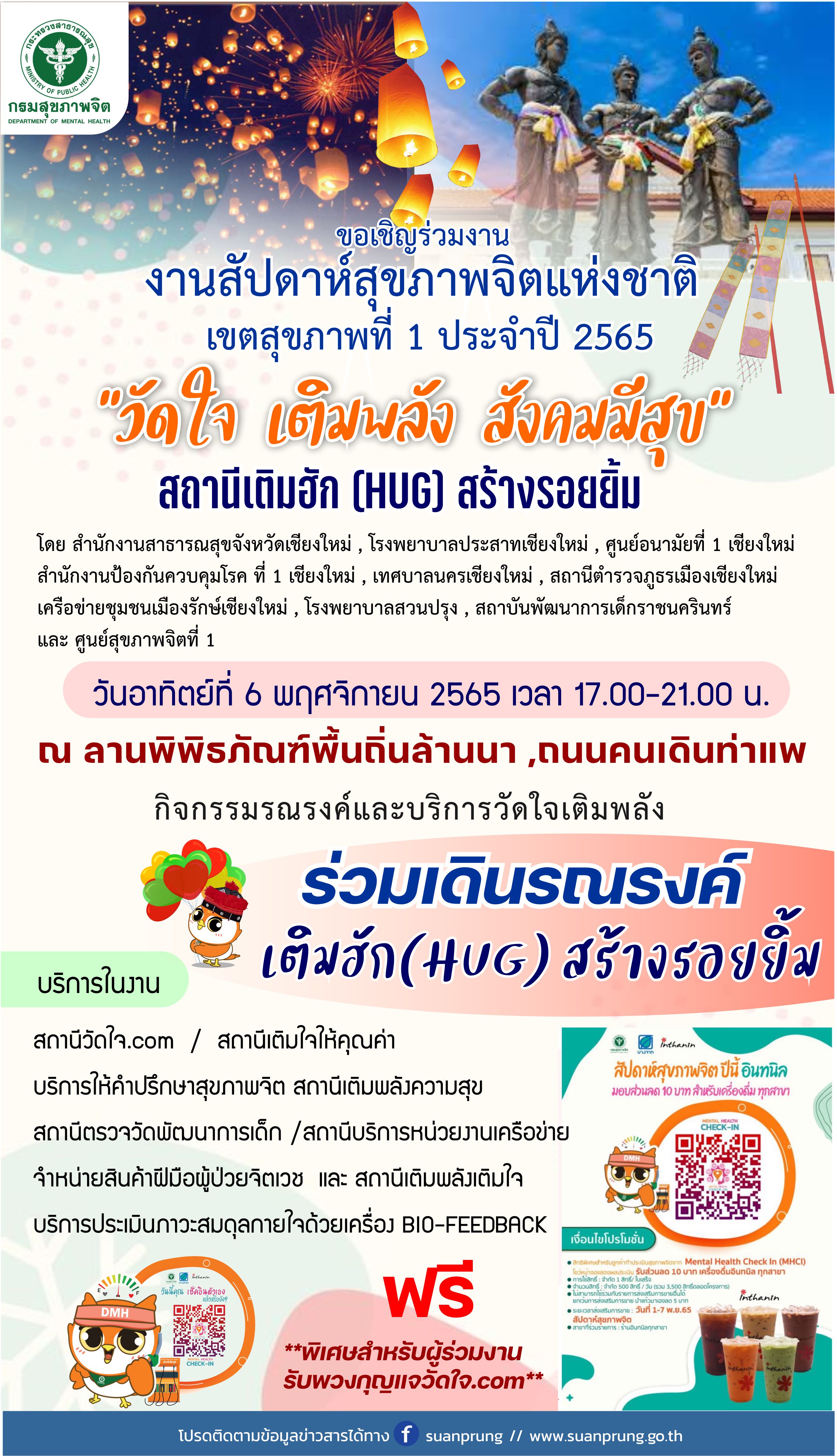 โดยโรงพยาบาลสวนปรุง สถาบันพัฒนาการเด็กราชครินทร์ และศูนย์สุขภาพจิตที่ 1 จึงได้จัดโครงการรณรงค์สัปดาห์สุขภาพจิตแห่งชาติ ประจำปี 2565 ในเขตสุขภาพจิตที่ 1 ภายใต้หัวข้อ วัดใจ เติมพลัง สังคมมีสุข กิจกรรมสถานีเติมฮัก สร้างรอยยิ้ม โดยได้รับการสนับสนุนจากหน่วยงานภาครัฐในจังหวัดเชียงใหม่ และจังหวัดแม่ฮ่องสอน ซึ่งได้คัดเอากิจกรรมสำคัญๆ อาทิ กิจกรรมสัปดาห์สุขภาพจิตสัญจร วันที่ 2-3 พฤศจิกายน 2565 ณ โรงพยาบาลศรีสังวาล จังหวัดแม่ฮ่องสอน วันที่ 6 พฤศจิกายน 2565 ณ ข่วงพิพิธภัณฑ์ถิ่นล้านนา (ตรงข้ามอนุสาวรีย์สามกษัตริย์) และวันที่ 7 พฤศจิกายน 2565 ณ โรงพยาบาลสวนปรุง อำเภอเมืองจังหวัดเชียงใหม่ ทั้งนี้พี่น้องที่สนใจเข้าร่วมสอบถามรายละเอียดได้ที่ฝ่ายงานประชาสัมพันธ์ โรงพยาบาลสวนปรุง โทร 053-908500 ได้ทุกวันในเวลาราชการ