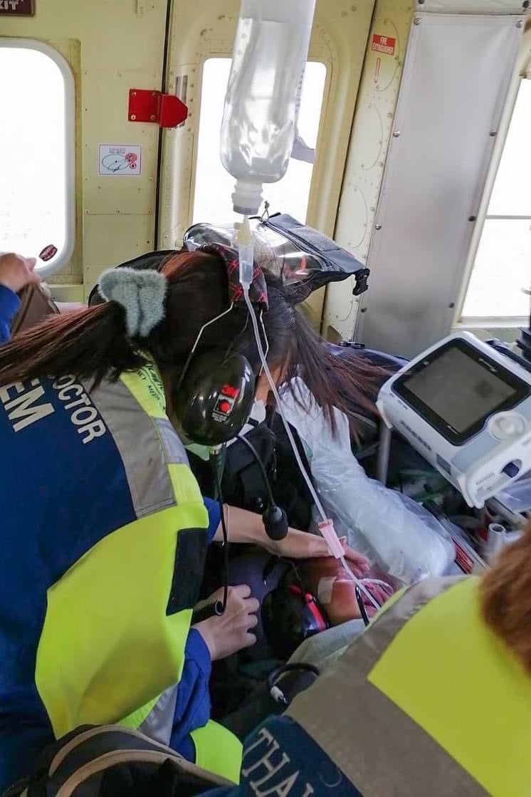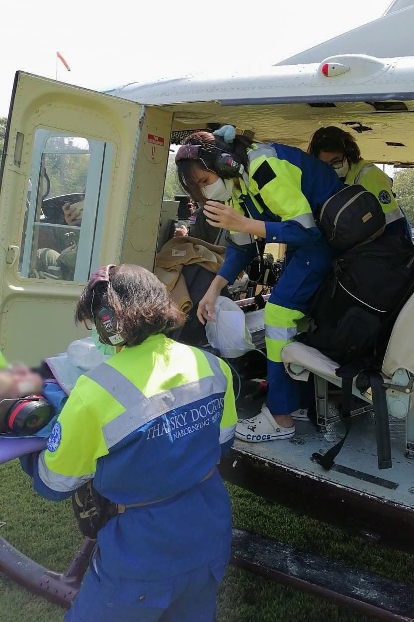 ทั้งนี้ได้ประสานงานศูนย์นเรนทร สถาบันการแพทย์ฉุกเฉินแห่งชาติ เพื่อแจ้งขอรับการสนับสนุนอากาศยานจากหน่วยบินตำรวจเชียงใหม่ ได้รับการสนับสนุนอากาศยานจากหน่วยบินตำรวจเชียงใหม่ รุ่น Bell 412 ชุดปฏิบัติการบินประกอบด้วย พ.ต.อ.ศักดิ์สุริยา บุตราช นักบิน, พ.ต.ท.ธงชัย ปัญญาเลิศ นักบิน, ส.ต.อ.ถนอมศักดิ์ ทองพรหม ช่างอากาศยาน ชุดปฏิบัติการบิน Sky Doctor โรงพยาบาลนครพิงค์ ประกอบด้วย พญ. หทัยรัตน์ จันทร์พรหมกุล, พญ.พัชรพร มงคลแสง, น.ส.ณัฐนรี ใสด้วง, น.ส.พิชญา ศรีนิล
