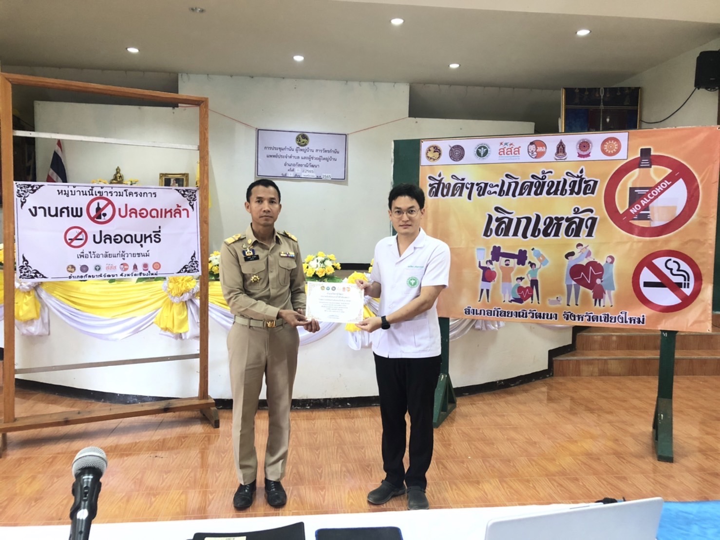 ภายใต้กิจกรรม “หมู่บ้านนี้ งานศพปลอดเหล้า ปลอดบุหรี่ เพื่อไว้อาลัยแก่ผู้วายชนม์” เพื่อลดภาระค่าใช้จ่ายให้แก่เจ้าภาพ ลดการทะเลาะวิวาท และสร้างความสงบเรียบร้อยให้แก่หมู่บ้าน ชุมชน พร้อมนี้อำเภอได้เตรียมการจัดงาน “วิ่ง” ในช่วงหน้าหนาวนี้ เพื่อส่งเสริมเรื่องการออกกำลังกาย และให้ประชาชนในพื้นที่ได้หันมารักษาสุขภาพร่างกาย เพื่อพัฒนาคุณภาพชีวิตของประชาชนในพื้นที่ ตลอดจนเป็นการนำแนวนโยบายของรัฐบาลสู่การปฏิบัติอย่างเป็นรูปธรรม