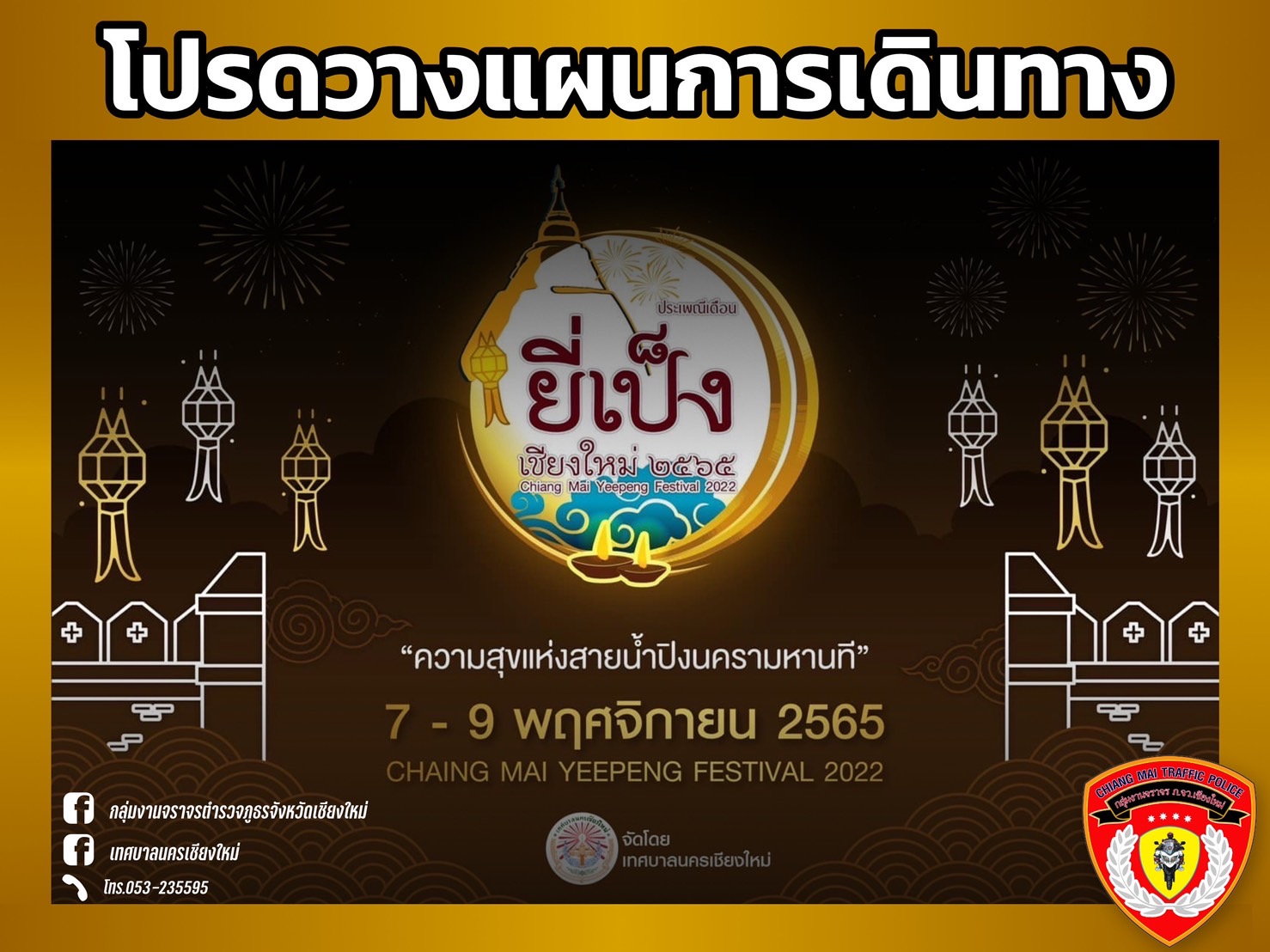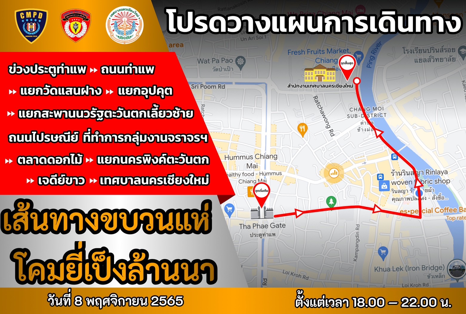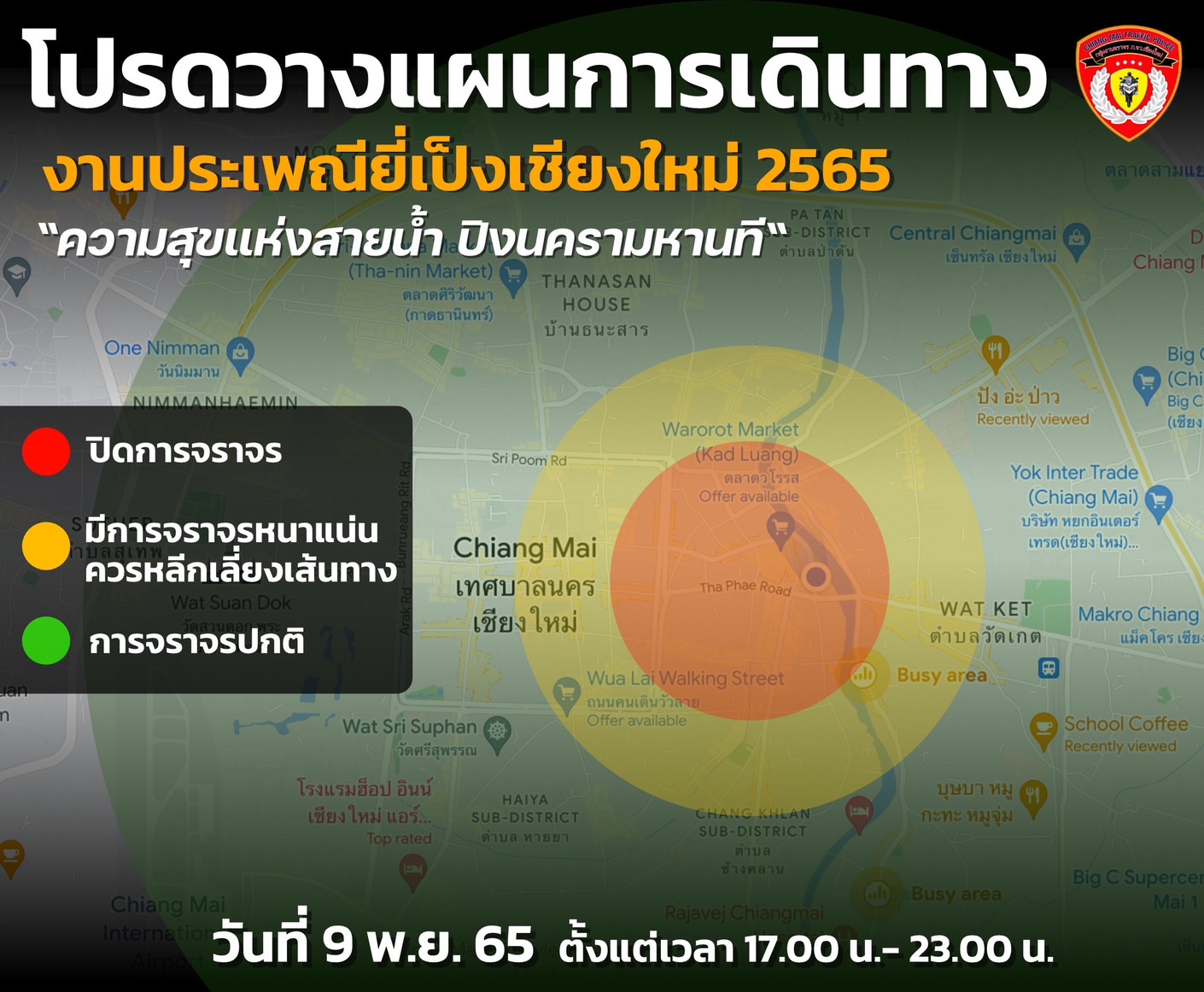 จราจรเชียงใหม่ แจ้งว่า ในช่วงระหว่างวันที่ 7-9 พฤศจิกายน 2565 จะมีการจัดกิจกรรมประเพณีเดือนยี่เป็งเชียงใหม่ ของเทศบาลนครเชียงใหม่ “ความสุขแห่งสายน้ำปิงนครามหานที” บริเวณข่วงประตูท่าแพและอนุสาวรีย์สามกษัตริย์จราจรเชียงใหม่ ฝากวางแผนการเดินทางหรือเผื่อระยะเวลาในการเดินทางเส้นทาง ดังนี้