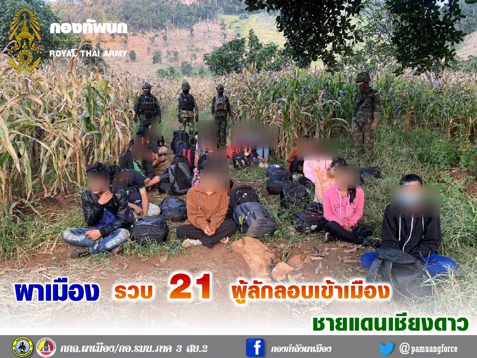 ห้วงเย็นวันที่ 4 พ.ย. 65 หน่วยเฉพาะกิจกรมทหารม้าที่ 5 กองกำลังผาเมือง จัดกำลังพล จำนวน 1 ชุดปฏิบัติการ ปฏิบัติภารกิจลาดตระเวนเฝ้าตรวจ บริเวณช่องทางหนองกะลาง ต.เมืองนะ อ.เชียงดาว จ.เชียงใหม่ ตรวจพบกลุ่มบุคคลต้องสงสัย เจ้าหน้าที่จึงได้แสดงตัวเพื่อขอทำการตรวจค้น พบเป็นผู้ลักลอบเข้าเมืองโดยผิดกฎหมาย จำนวน 21 คน จากการสอบถามเบื้องต้นให้การว่า ได้เดินเข้ามาทางช่องทางธรรมชาติ โดยมีผู้นำพามารอรับที่แนวชายแดน และได้จ่ายเงินให้ผู้นำพาคนละ 13,000 บาท เพื่อจะเดินทางไปทำงานที่ จ.เชียงใหม่ หน่วยจึงได้ควบคุมตัวบุคคลดังกล่าวทั้งหมด ส่งให้กับเจ้าหน้าที่ตำรวจ สภ.นาหวาย เพื่อดำเนินคดีตามกฎหมายต่อไป