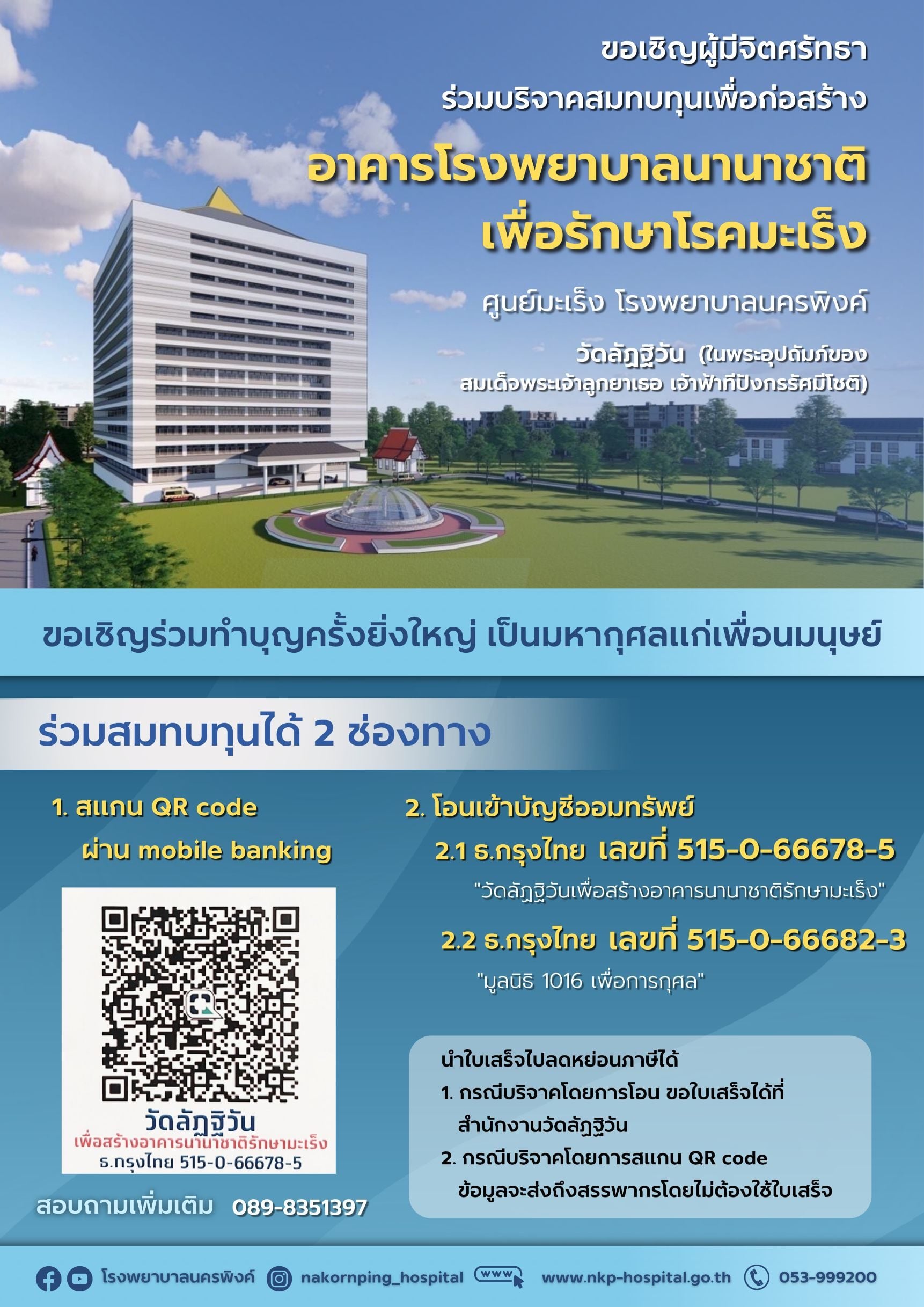 มีห้องปฏิปัติการ หอผู้ป่วย ห้องผ่าตัด การแพทย์ทางเลือก การรักษาประคับประคอง และหอผู้ป่วยสงฆ์อาพาธ จึงขอเชิญผู้มีจิตศรัทธาร่วมบริจาคเงินสมทบทุน เพื่อก่อสร้างอาคารได้ 2 ช่องทางดังต่อไปนี้