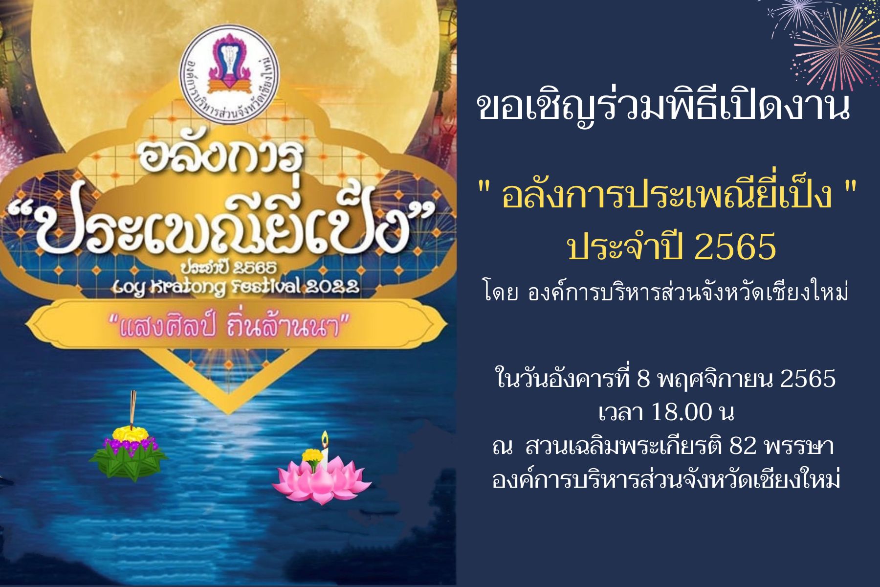 องค์การบริหารส่วนจังหวัดเชียงใหม่ ขอเชิญชวนพี่น้องมัคคุเทศก์ พาครอบครัวและนักท่องเที่ยว ทั้งชาวไทยและชาวต่างชาติ เข้าร่วมพิธีเปิดงานอลังการประเพณียี่เป็ง ประจำปี 2565 และลอยกระทงหลังพิธีเปิดในบริเวณงาน วันอังคารที่ 8 พฤศจิกายน 2565 เวลา 18.00 น .ณ สวนเฉลิมพระเกียรติ 82 พรรษา ติดกับโรงแรมกรีนเลค รีสอร์ท หลังศาลากลางจังหวัดเชียงใหม่