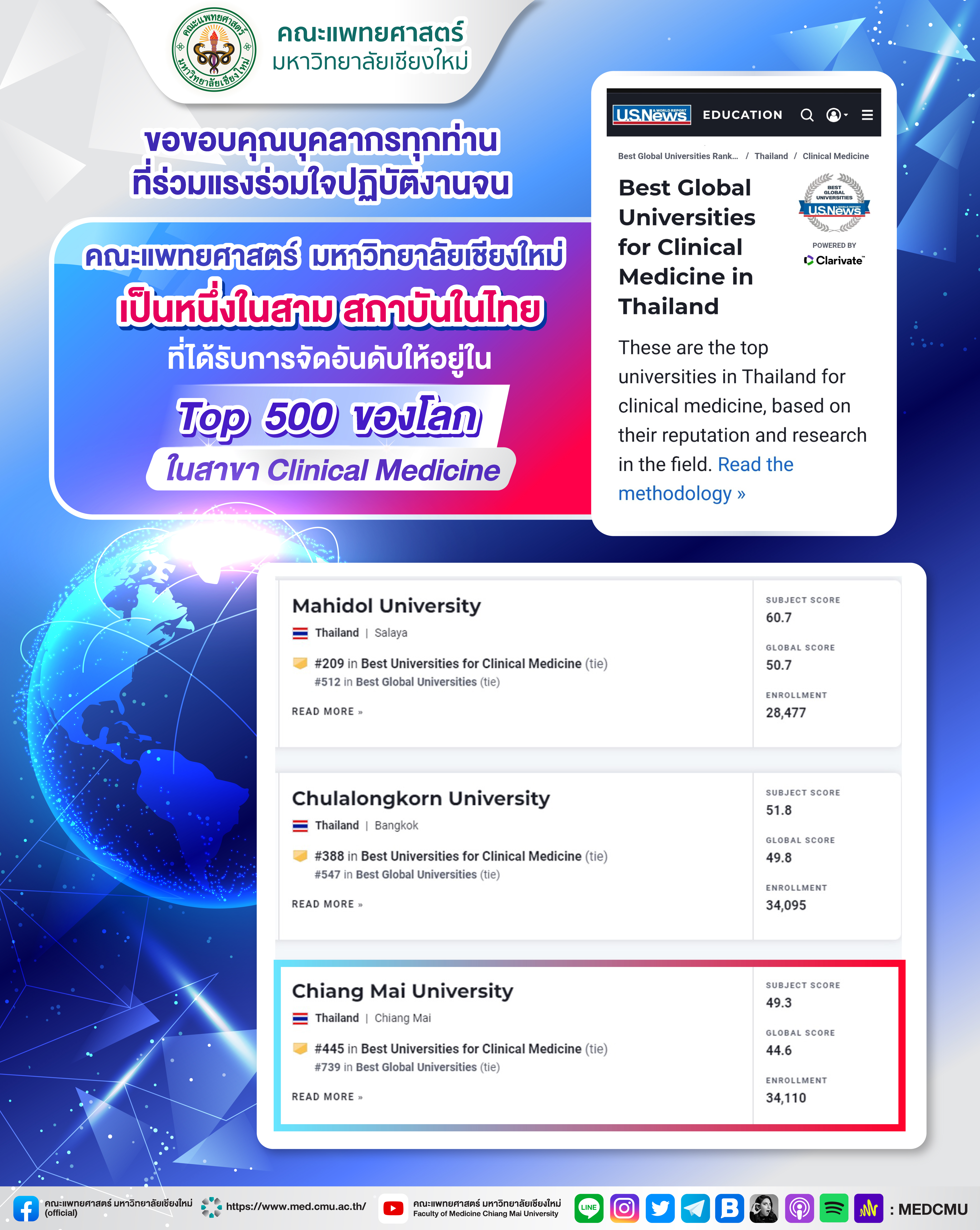 คณะแพทยศาสตร์ มช. ติด Top 500 ของโลก
