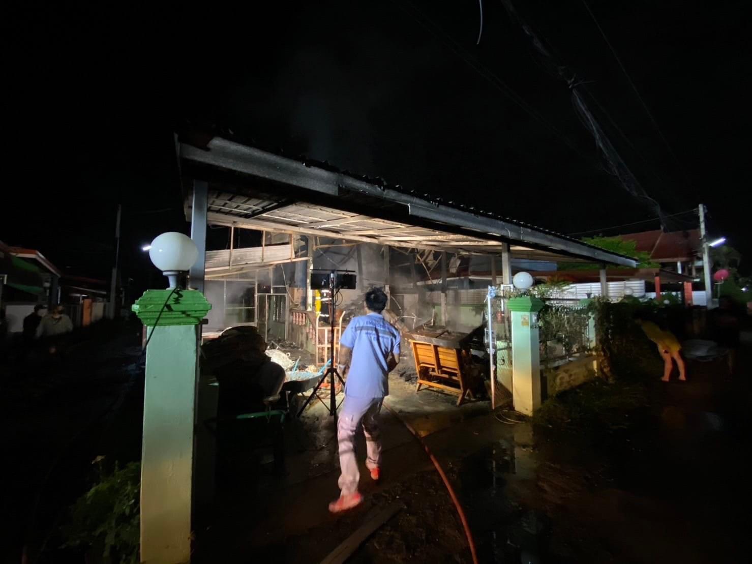 ในเบื้องต้นเจ้าของบ้านเล่าว่าขณะที่ตนเองพร้อมกับภรรยานอนอยู่ที่ชั้นล่างของบ้าน ได้ยินเสียงระเบิดนึกว่าเสียงประทัด แล้วเสียงระเบิดก็ตามมาอีกมีเสียงคล้ายไฟไหม้และฝ้าเพดานถล่มลงมาที่ชั้น2 เกิดไฟลุกท่วม จึงรีบปลุกภรรยาพากันหลบหนีออกมา ดังกล่าว ส่วนสาเหตุสันนิษฐานว่าเกิดจากไฟฟ้าลัดวงจร และจะได้เปิดดูกล้องวงจรปิดกันอีกครั้ง