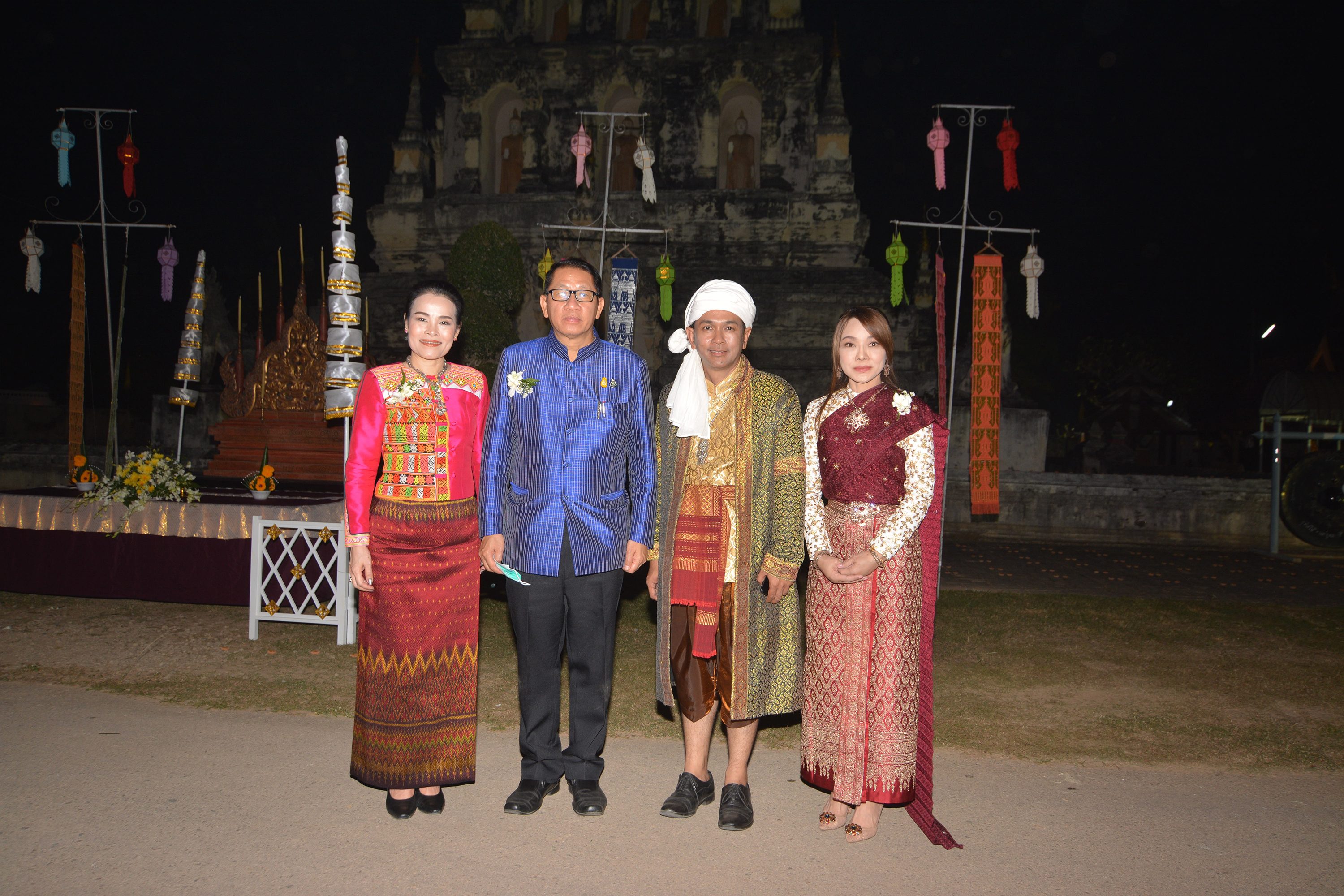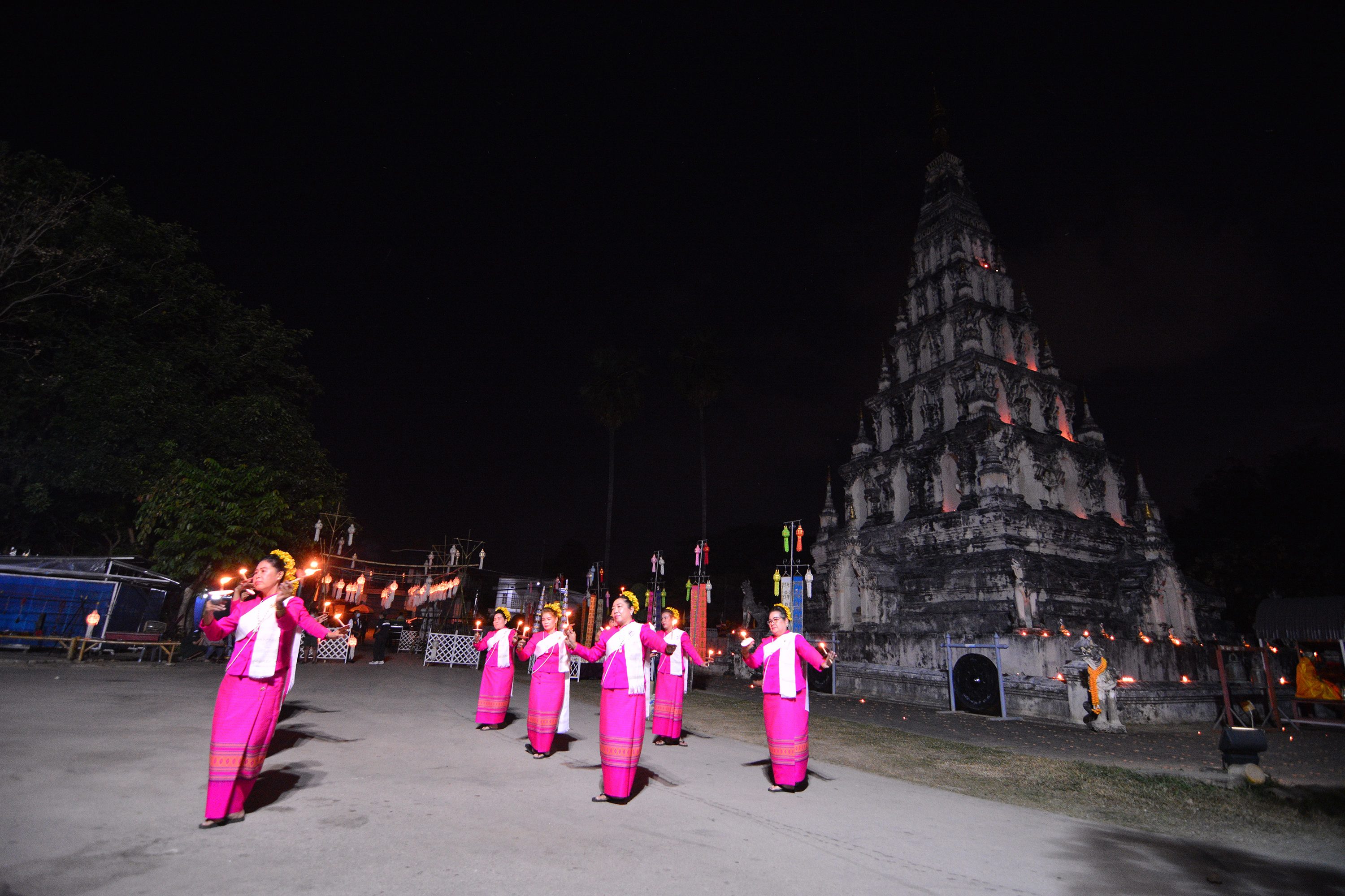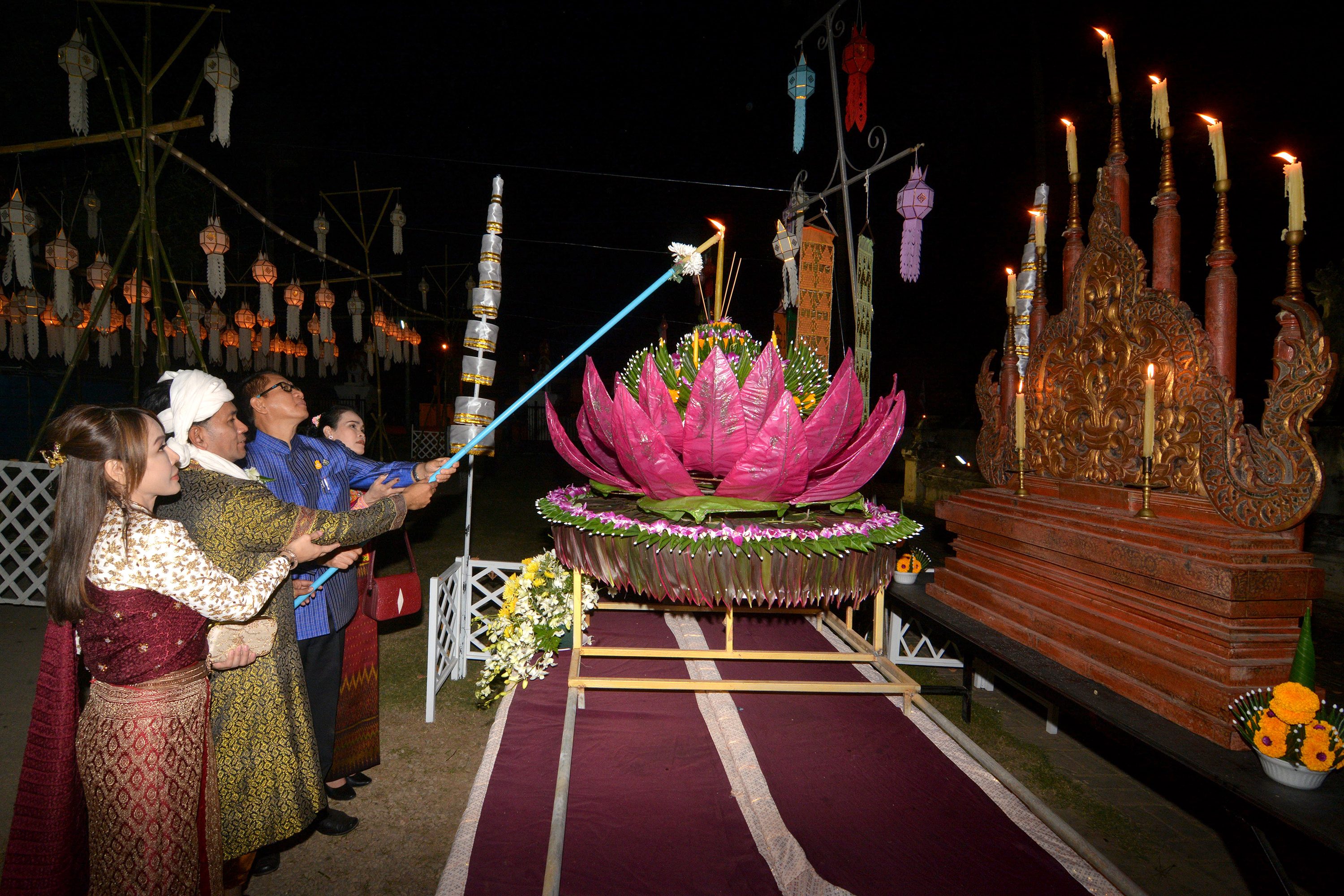 บรรยากศภายในงาน ผู้ร่วมงานแต่งกายด้วยชุดพื้นเมือง ชุดชาติพันธ์ ร่วมจุดผางประทีปถวายโคมเป็นพุทธบูชา พระเจดีย์เหลี่ยม (กู่คำหลวง) อย่างยิ่งใหญ่ ซึ่งครั้งนี้ถือเป็นเป็นแรกแห่งการเริ่มต้นที่จะจัดให้เป็นประเพณีสำคัญของทุกๆ ปี ในช่วงประเพณียี่เป็งรำลึกของจังหวัดเชียงใหม่ ณ วัดเจดีย์เหลี่ยม ต.ท่าวังตาล อ.สารภี จ.เชียงใหม่