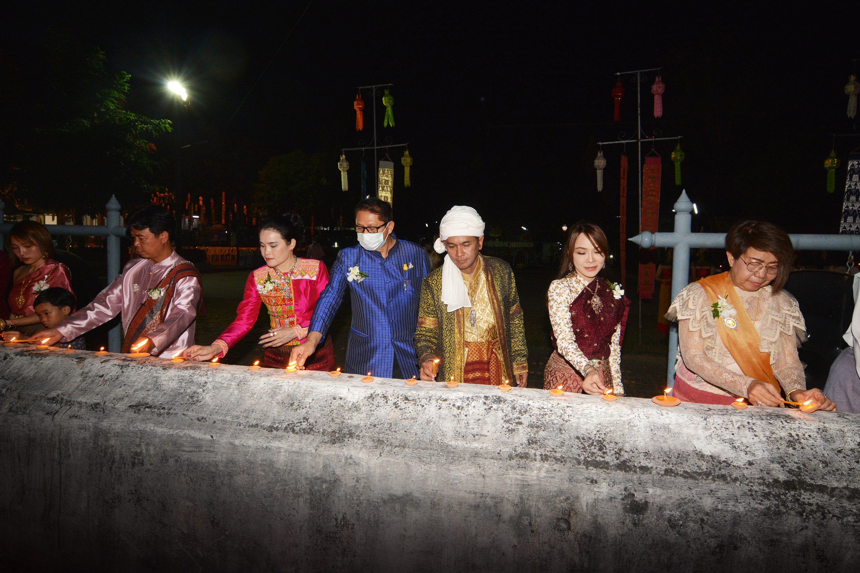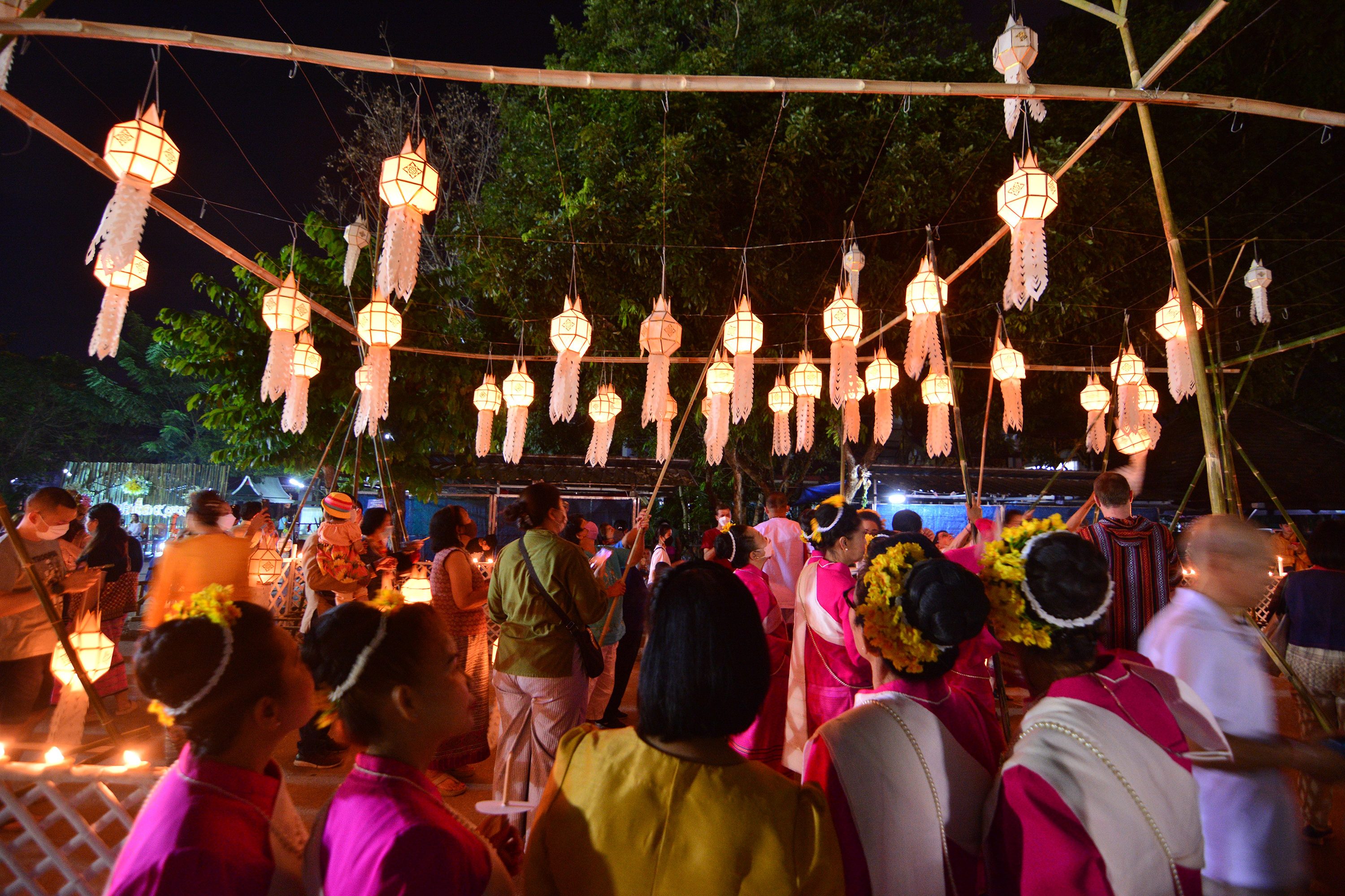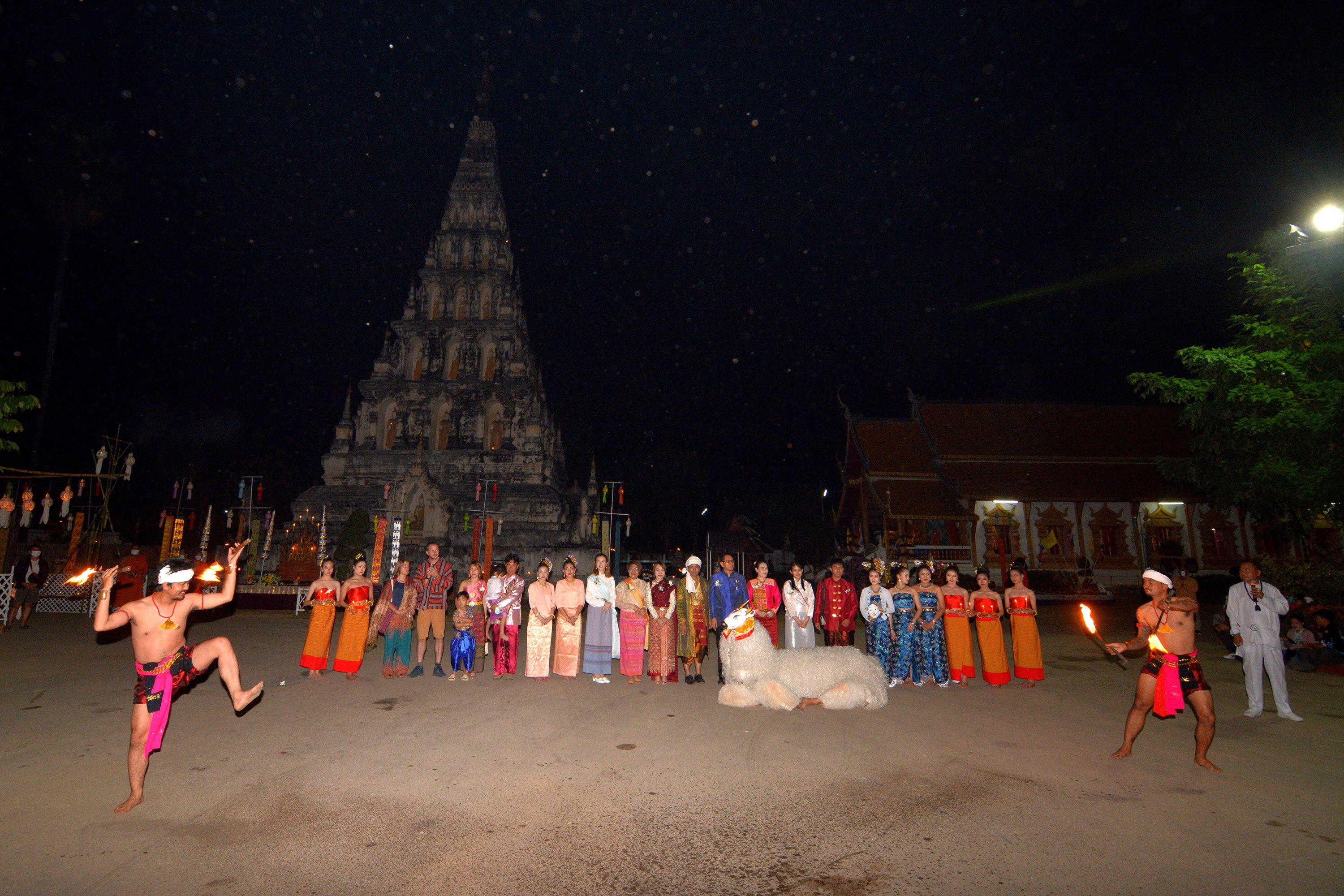 บรรยากศภายในงาน ผู้ร่วมงานแต่งกายด้วยชุดพื้นเมือง ชุดชาติพันธ์ ร่วมจุดผางประทีปถวายโคมเป็นพุทธบูชา พระเจดีย์เหลี่ยม (กู่คำหลวง) อย่างยิ่งใหญ่ ซึ่งครั้งนี้ถือเป็นเป็นแรกแห่งการเริ่มต้นที่จะจัดให้เป็นประเพณีสำคัญของทุกๆ ปี ในช่วงประเพณียี่เป็งรำลึกของจังหวัดเชียงใหม่ ณ วัดเจดีย์เหลี่ยม ต.ท่าวังตาล อ.สารภี จ.เชียงใหม่