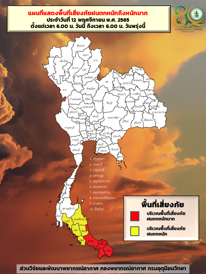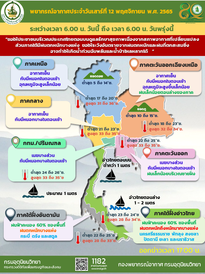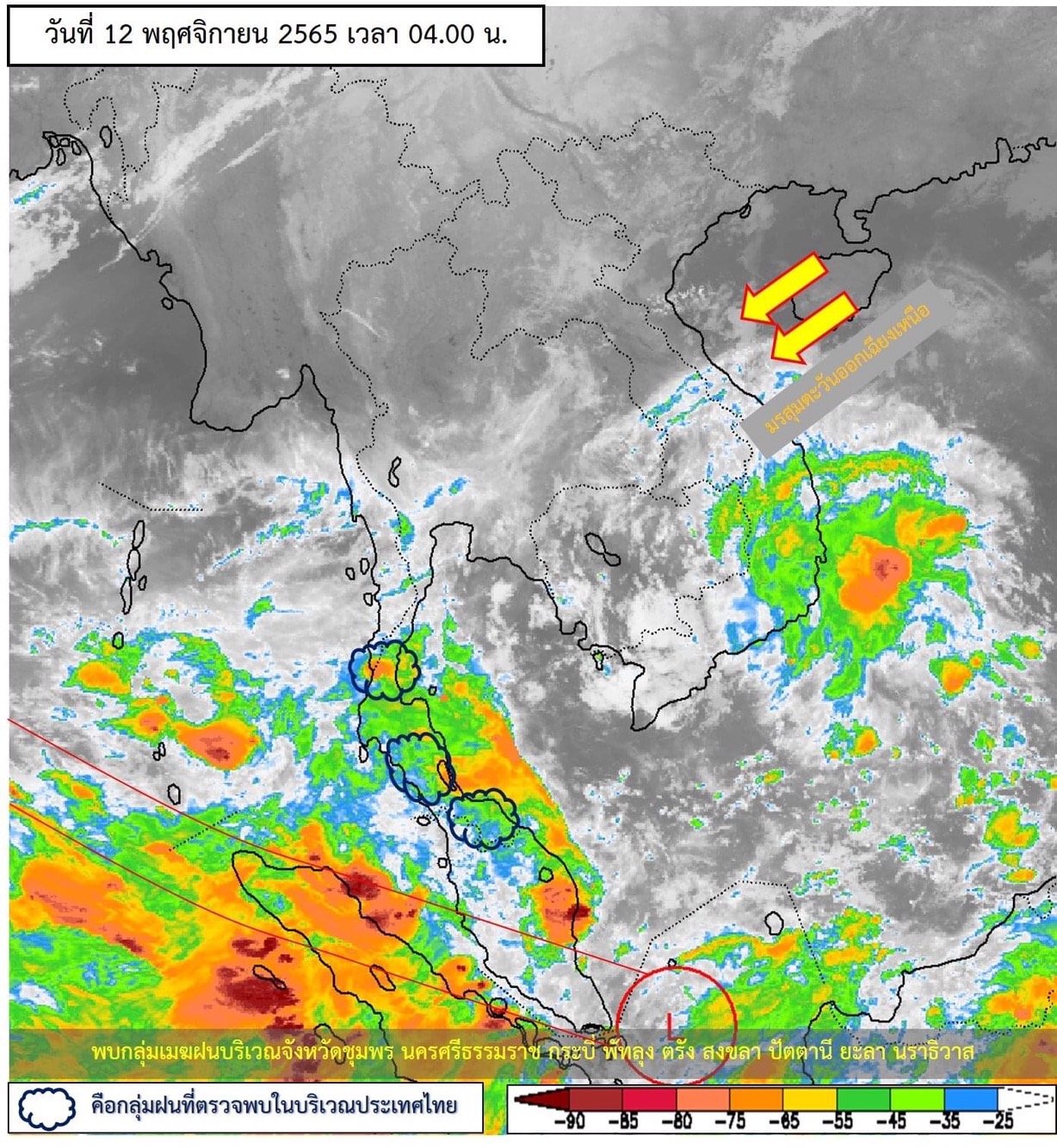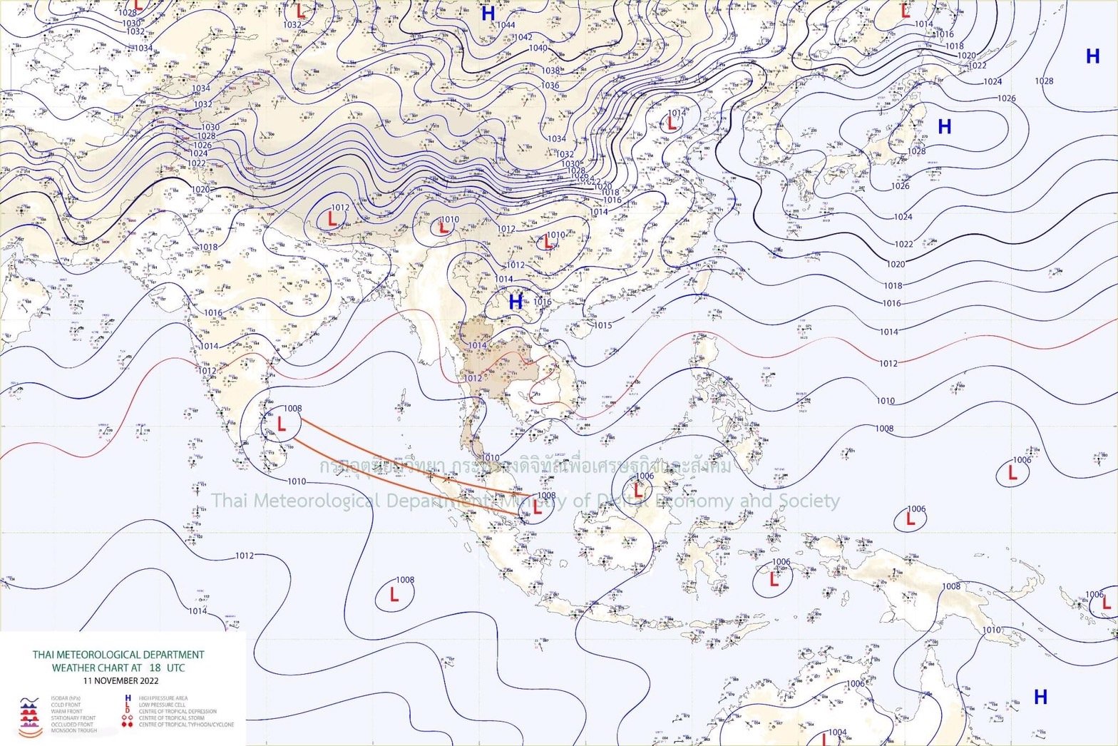 ลักษณะอากาศทั่วไป พยากรณ์อากาศ 24 ชั่วโมงข้างหน้า ร่องมรสุมพาดผ่านตอนล่างของภาคใต้เข้าสู่หย่อมความกดอากาศต่ำที่ปกคลุมบริเวณชายฝั่งของประเทศมาเลเซีย ประกอบกับมรสุมตะวันออกเฉียงเหนือยังคงพัดปกคลุมอ่าวไทย ภาคใต้ และทะเลอันดามัน ในขณะที่ลมตะวันออกพัดปกคลุมภาคใต้ตอนล่าง ลักษณะเช่นนี้ทำให้ภาคใต้ตอนล่างมีฝนตกหนักถึงหนักมากบางแห่ง ขอให้ประชาชนบริเวณดังกล่าวระวังอันตรายจากฝนตกหนักถึงหนักมากและฝนที่ตกสะสมซึ่งอาจทำให้เกิดน้ำท่วมฉับพลันและน้ำป่าไหลหลาก โดยเฉพาะพื้นที่ลาดเชิงเขาใกล้ทางน้ำไหลผ่านและพื้นที่ลุ่มไว้ด้วย