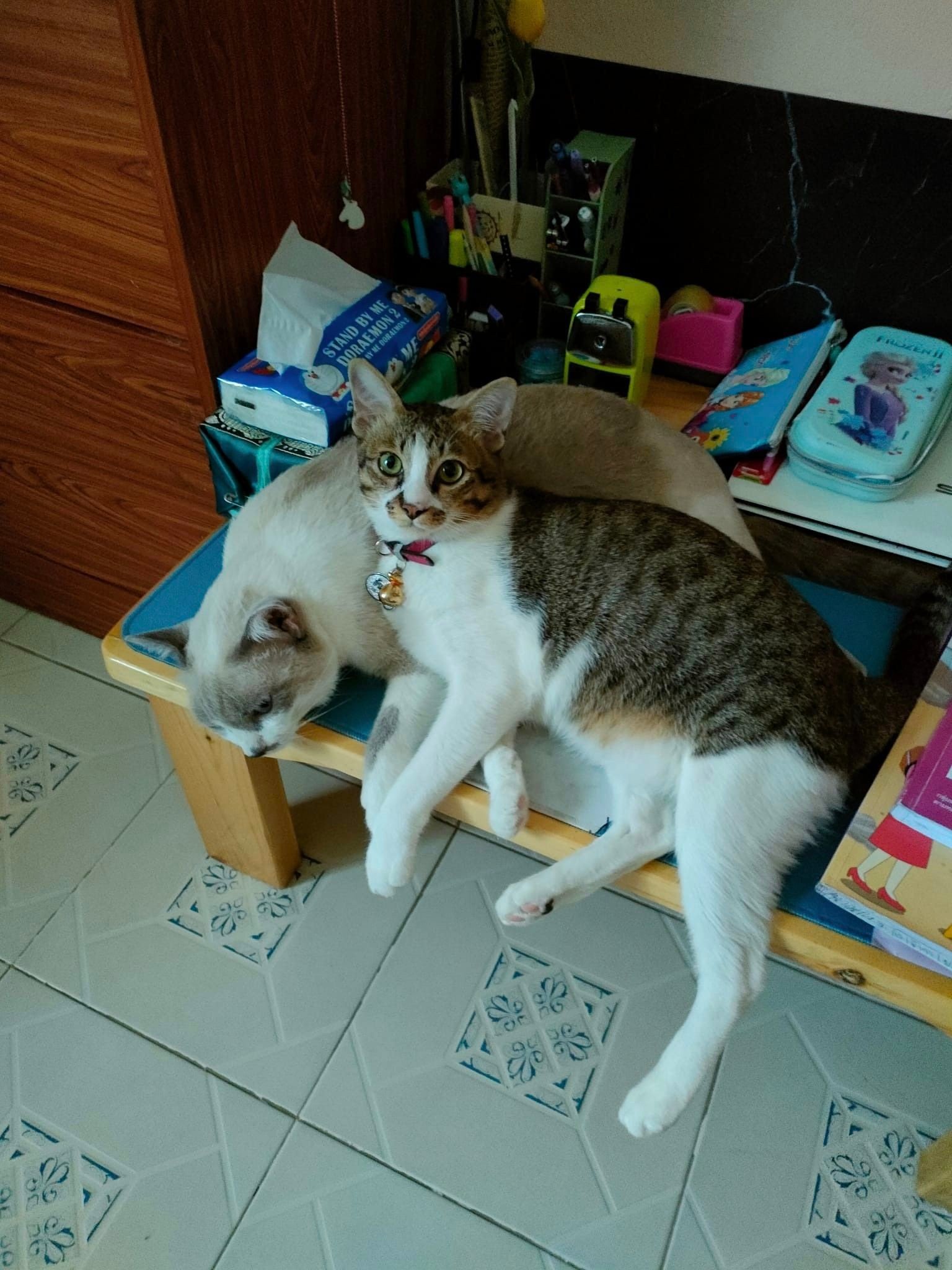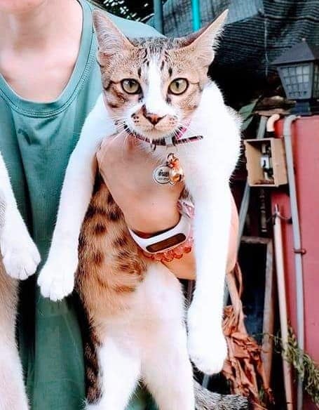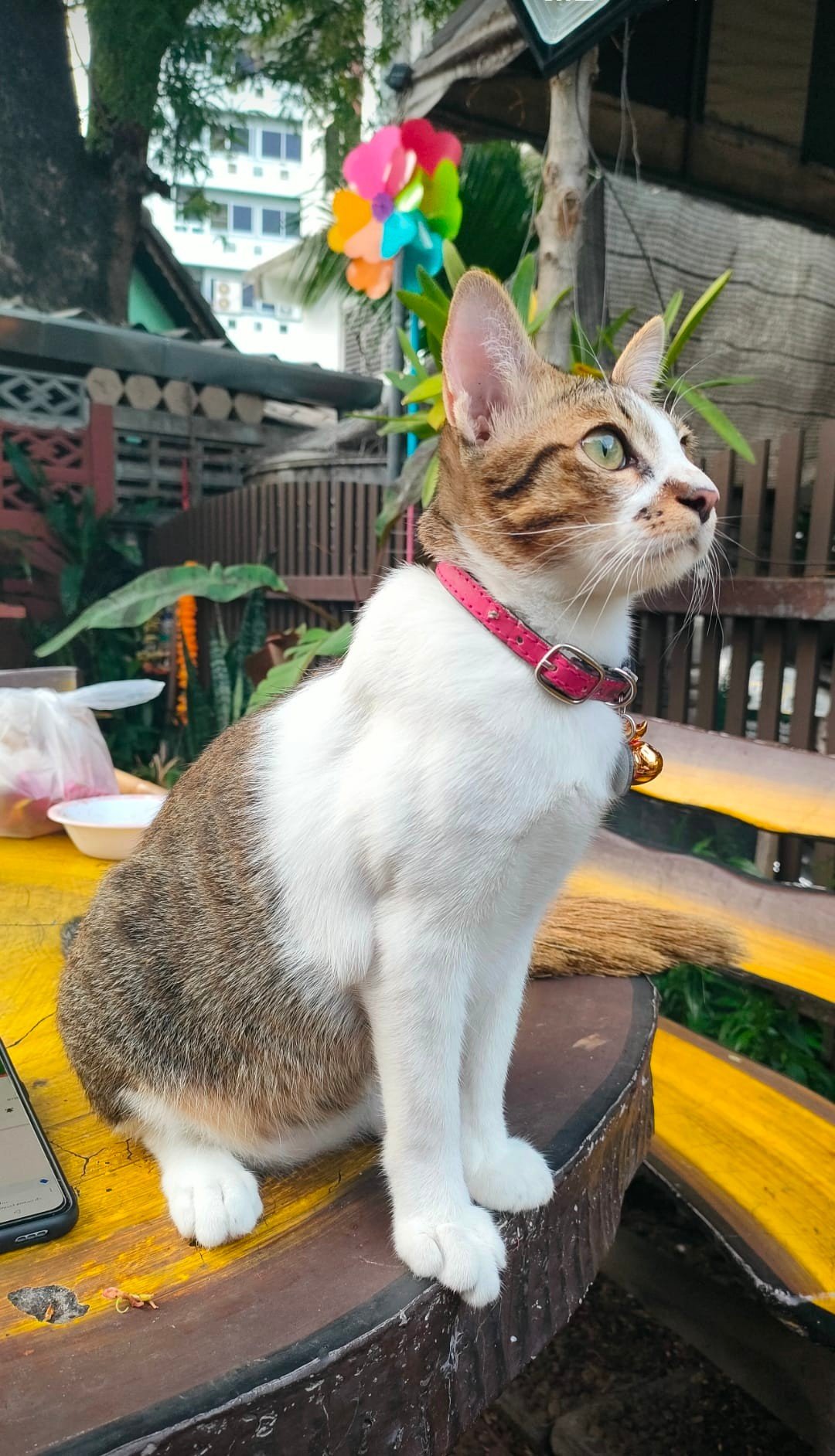 มีปลอกคอสีชมพู ห้อยกระดิ่งรูปถุงเงินสีทอง มีป้ายชื่อพร้อมเบอร์โทรเป็นรูปปลา