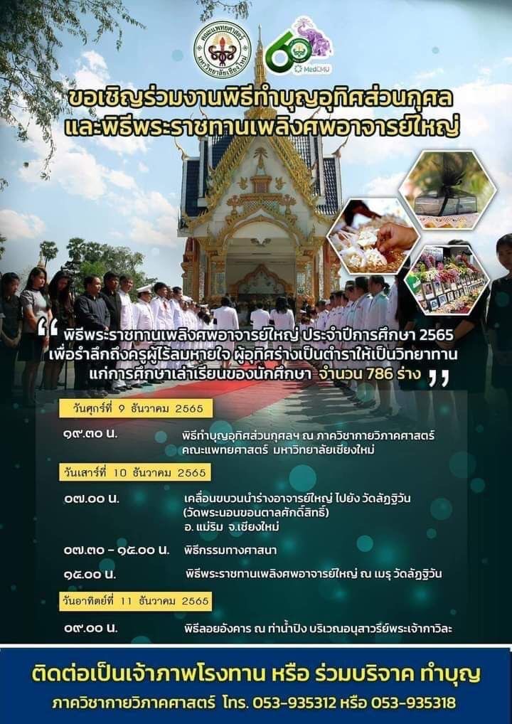 ขอเชิญร่วมงานพิธีทำบุญอุทิศส่วนกุศล และพิธีพระราชทานเพลิงศพอาจารย์ใหญ่ ประจำปีการศึกษา 2565 เพื่อรำลึกถึงครูผู้ไร้ลมหายใจ ผู้อุทิศร่างเป็นตำราให้เป็นวิทยาทาน แก่การศึกษาเล่าเรียนของนักศึกษา จำนวน 786 ร่าง วันศุกร์ที่ 9 ธันวาคม 2565 เวลา 19.30 น. พิธีทำบุญอุทิศส่วนกุศลฯ ณ ภาควิชากายวิภาคศาสตร์ คณะแพทยศาสตร์ มหาวิทยาลัยเชียงใหม่ วันเสาร์ที่ 10 ธันวาคม 2565 เวลา07.00 น. : เคลื่อนขบวนนำร่างอาจารย์ใหญ่ ไปยังวัดลัฎฐิวัน (วัดพระนอนขอนตาลศักดิ์สิทธิ์) อ.แม่ริม จ.เชียงใหม่ เวลา 07.30 – 15.00 น. : พิธีกรรมทางศาสนา เวลา 15.00 น. : พิธีพระราชทานเพลิงศพอาจารย์ใหญ่ ณ เมรุ วัดลัฎฐิวัน วันอาทิตย์ที่ 11 ธันวาคม 2565 เวลา09.00 น. : พิธีลอยอังคาร ณ ท่าน้ำปิง บริเวณอนุสาวรีย์พระเจ้ากาวิละ