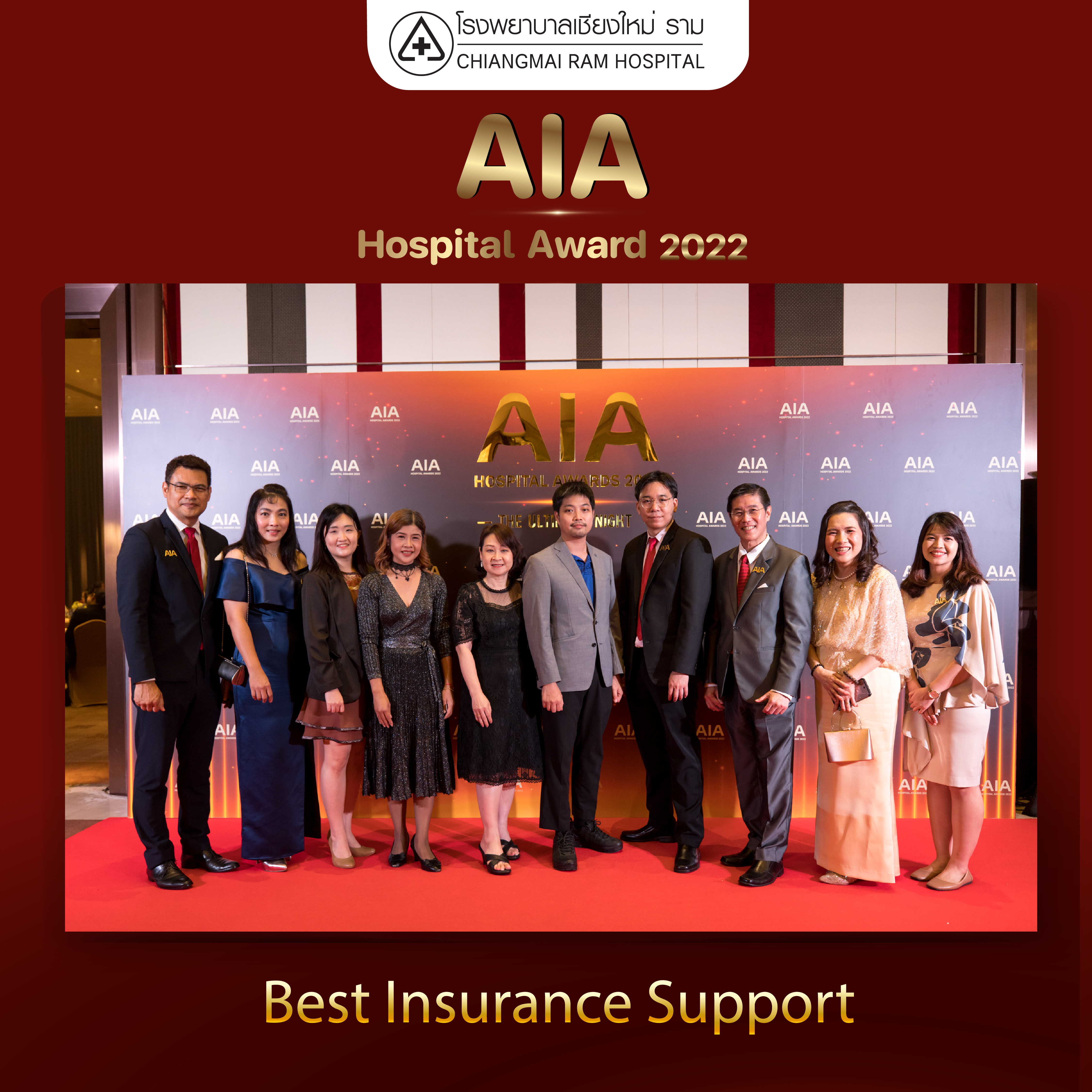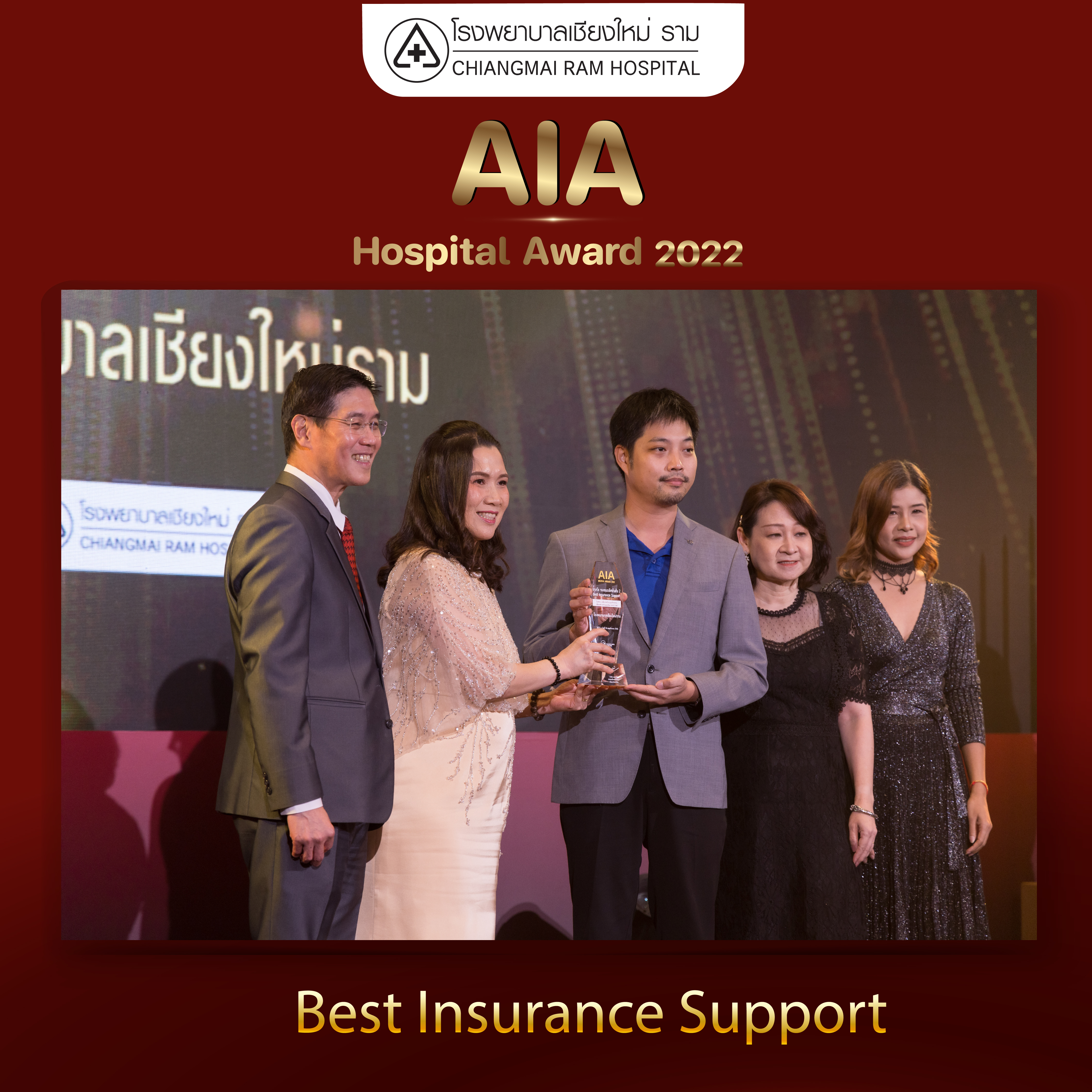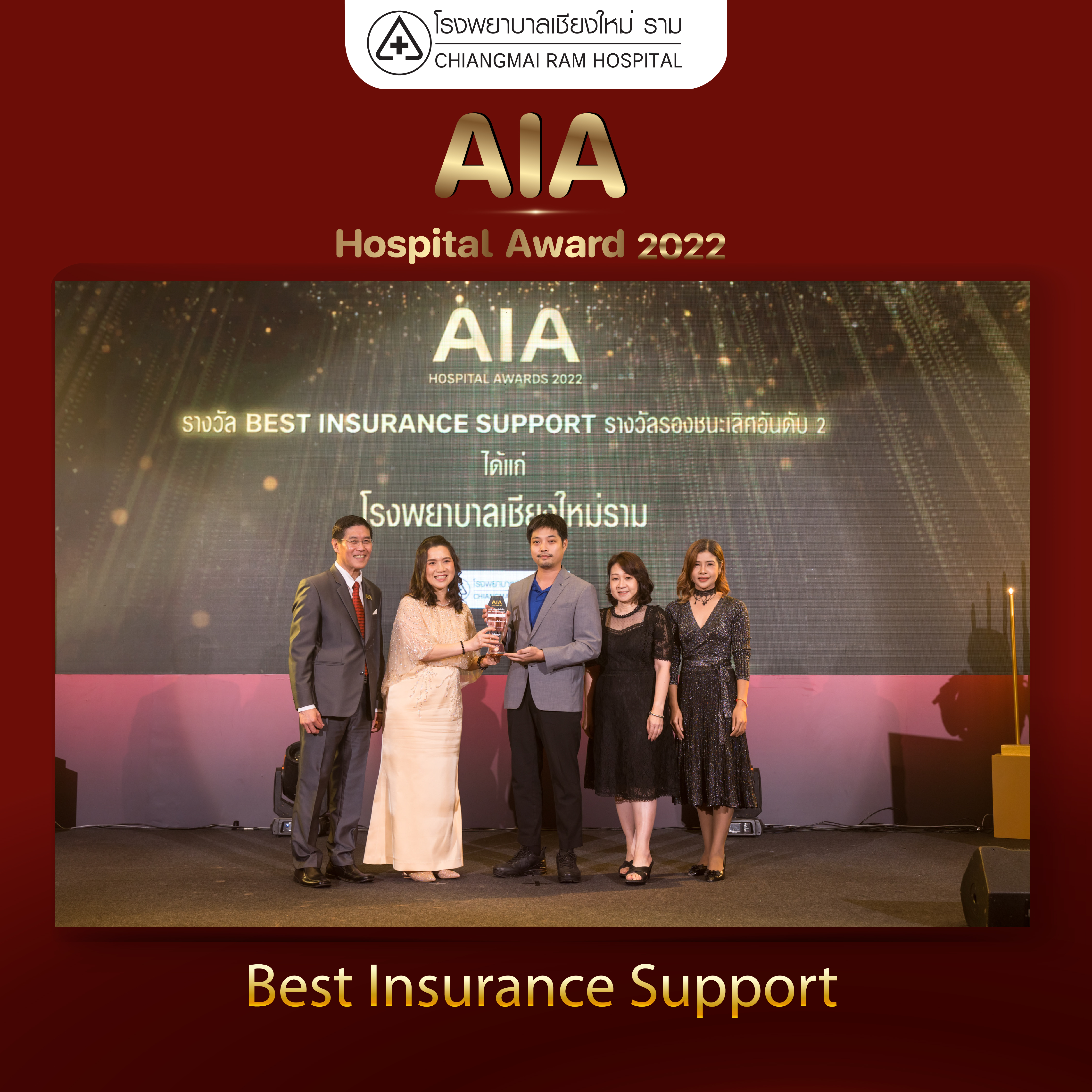ในโอกาศนี้ โรงพยาบาลเชียงใหม่ ราม ได้รับรางวัลรองชนะเลิศ อันดับ 2 “Best Insurance Support โรงพยาบาลที่มีการสนับสนุนธุรกิจประกันเพื่อการทำประกันยอดเยี่ยม” โดยรางวัลดังกล่าวได้รับการประเมินจากหลักเกณฑ์ 2 ส่วนหลัก คือ 1. ความถูกต้อง ครบถ้วนของการให้บริการ 2.ความพึงพอใจของลูกค้าผู้เอาประกันภัยและตัวแทนเอไอเอที่ใช้บริการในโรงพยาบาล และมีการบริหารทรัพยากรทางการแพทย์เป็นอย่างดีเยี่ยม โดยมีการคัดเลือกและเก็บข้อมูลด้านการบริการของโรงพยาบาลคู่สัญญาที่มีอยู่กว่า 383 แห่งทั่วประเทศ ตั้งแต่ 1 พ.ค. – 31 ต.ค. 2565