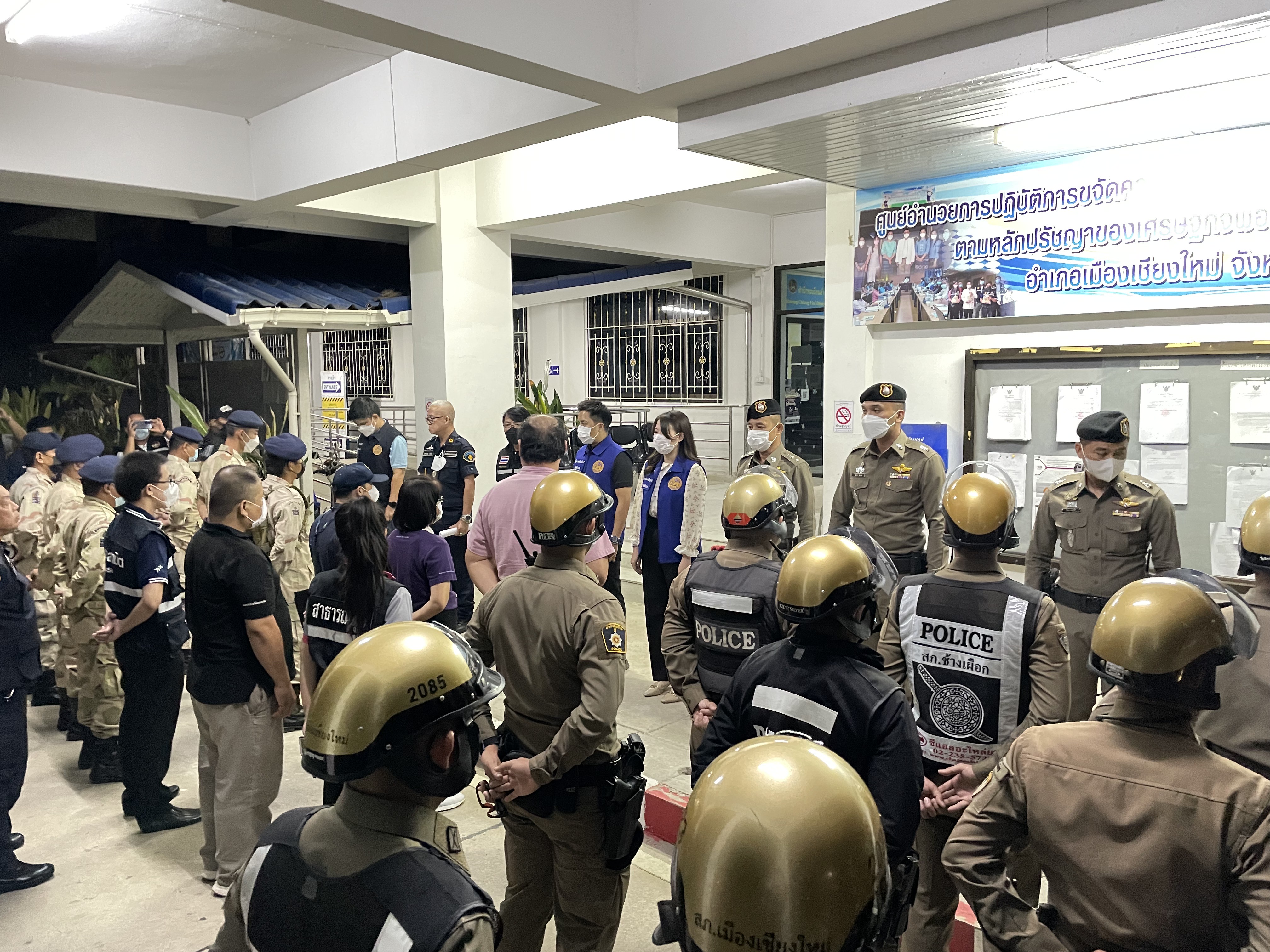 วันที่ 22 พฤศจิกายน 2565 ตั้งแต่เวลา 21.00 น. เป็นต้นไป ภายใต้การอำนวยการของ นายสันติ อินทนิล ปลัดอำเภอหัวหน้ากลุ่มบริหารงานปกครอง รักษาราชการแทนนายอำเภอเมืองเชียงใหม่ ได้สั่งการให้ นางสาวยศธร ผลเจริญรัตน์ นายณัฐกร ชุ่มอินทรจักร์ และนายวริธ ไกยสิทธิ์ ปลัดอำเภอเมืองเชียงใหม่ พร้อมด้วย สมาชิกกองอาสารักษาดินแดนอำเภอเมืองเชียงใหม่ที่ 2 บูรณาการร่วมกับ เจ้าหน้าที่ตำรวจสถานีตำรวจภูธรช้างเผือก เจ้าหน้าที่ตำรวจสถานีตำรวจภูธรเมืองเชียงใหม่ สรรพสามิตจังหวัดเชียงใหม่ วัฒนธรรมจังหวัดเชียงใหม่ เทศบาลนครเชียงใหม่ และเทศบาลเมืองเเม่เหียะ ลงพื้นที่ตรวจสอบข้อร้องเรียน สถานประกอบการที่เปิดให้บริการในลักษณะคล้ายสถานบริการ ผับ บาร์ คาราโอเกะ ในพื้นที่อำเภอเมืองเชียงใหม่ จำนวน 5 แห่ง