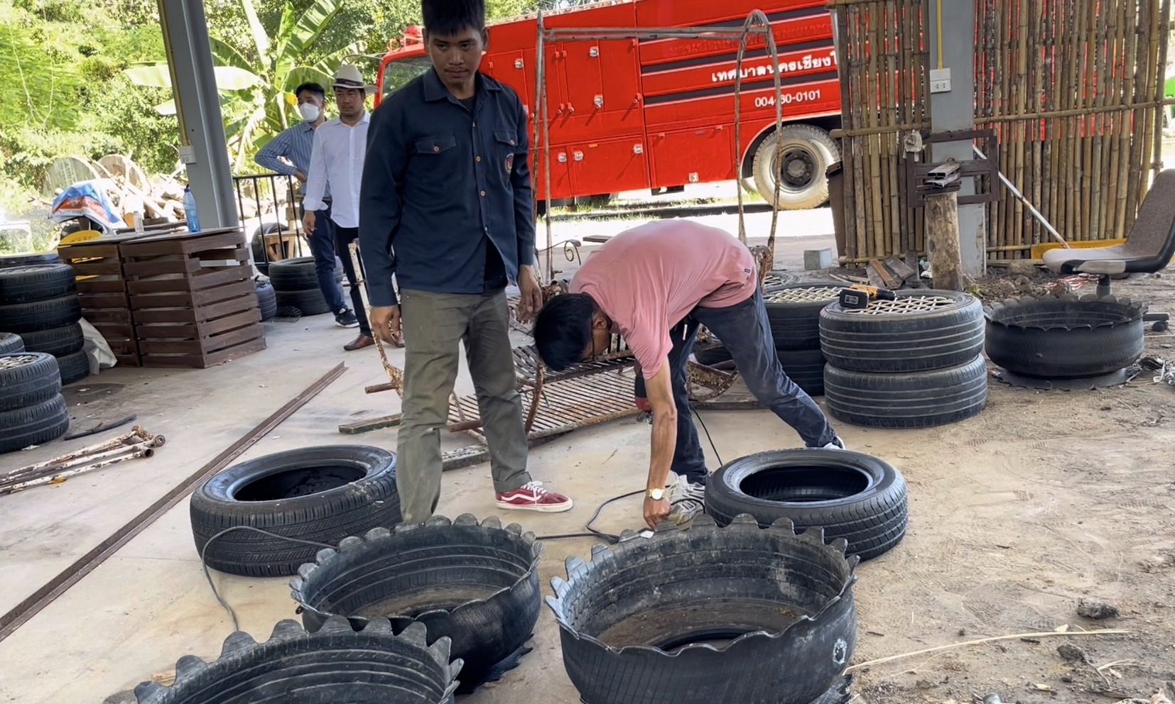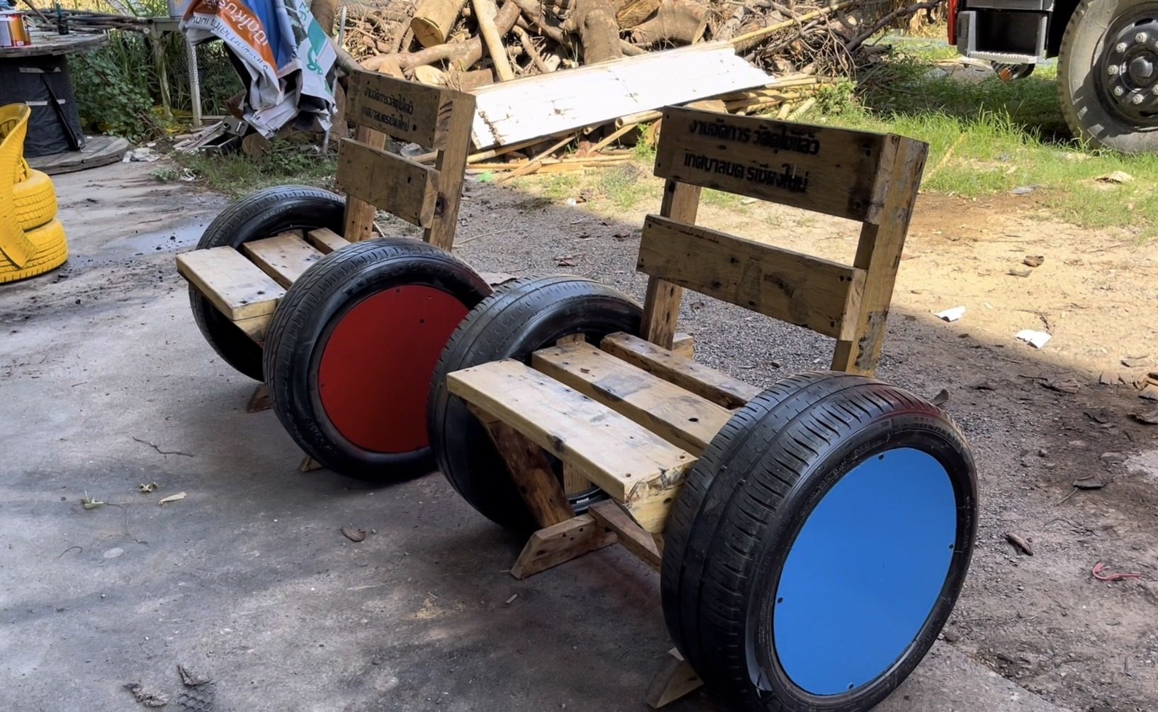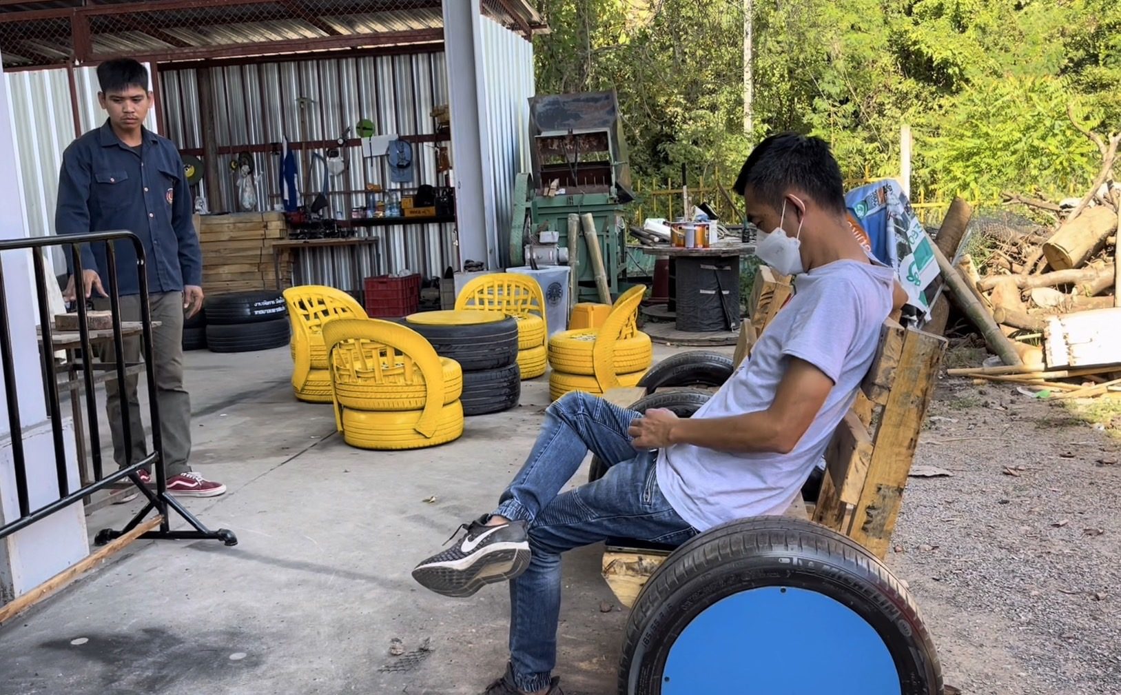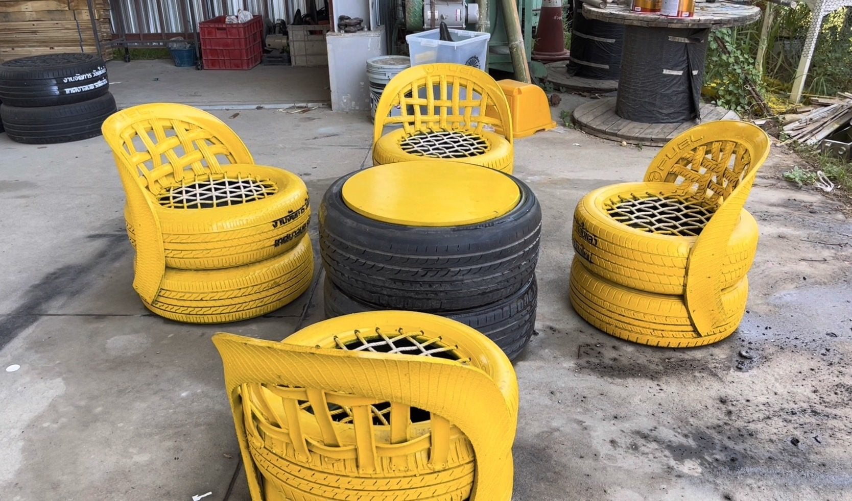 นอกจากนี้ในกลุ่มของยางรถยนต์เก่า ยังมีการดัดแปลงและออกแบบเป็นทั้งที่นั่งแบบต่างๆ ชิงช้ายางรถยนต์ หรือ ชุดเฟอร์นิเจอร์สีเหลือง เก้าอี้มีพนักพิงหลัง 4 ชิ้น พร้อมโต๊ะกลาง เอาไว้ใช้สำหรับนั่งพักผ่อนหรือเอาไว้รับแขกภายในสวนของบ้านได้ ส่วนใหญ่ชิ้นที่ผลิตเสร็จแล้วจะนำไปมอบให้กับชุมชน และโรงเรียนเพื่อนำไปใช้ประโยชน์