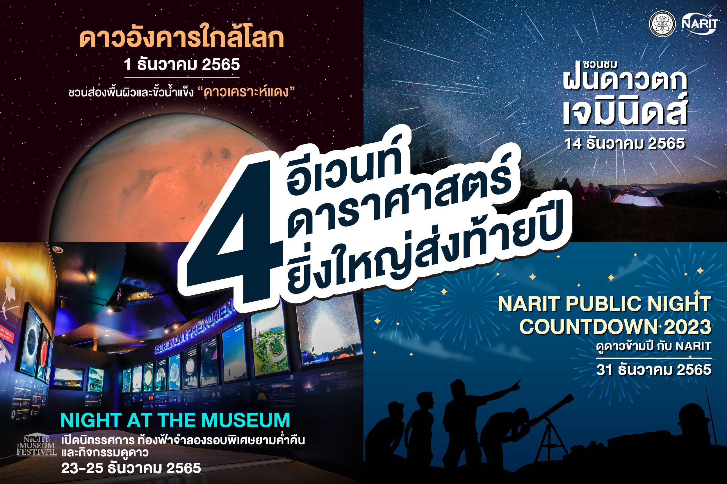 3) 23 – 25 ธันวาคม 2565 Night at the Museum : เปิดนิทรรศการ ท้องฟ้าจำลองรอบพิเศษยามค่ำคืน และกิจกรรม ดูดาว สัมผัสประสบการณ์เรียนรู้ดาราศาสตร์ในช่วงกลางคืน ร่วมแต่งตัวธีมสนุก ๆ พร้อมเก็บความประทับใจผ่านภาพถ่ายสุดลิมิเต็ด และกิจกรรมพิเศษในธีม The Secrets of NARIT