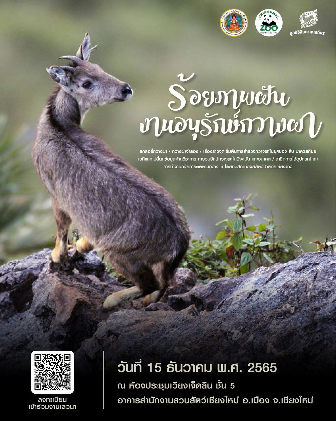 จึงขอใช้โอกาสนี้บอกเล่าเรื่องราวการทำงานด้านกวางผาตั้งแต่อดีตจนถึงปัจจุบันผ่านข้อมูลด้านวิชาการ การอนุรักษ์ และการสร้างเครือข่ายแนวร่วมงานอนุรักษ์กวางผา ผ่านการจัดงานสัมมนา “ร้อยภาพฝันงานอนุรักษ์กวางผา” ในวันพฤหัสบดีที่ 15 ธันวาคม 2565 เวลา 09.30-16.30 น. ณ ห้องประชุมเวียงเจ็ดลิน ชั้น 5 อาคารสำนักงานสวนสัตว์เชียงใหม่ อ.เมือง จ.เชียงใหม่