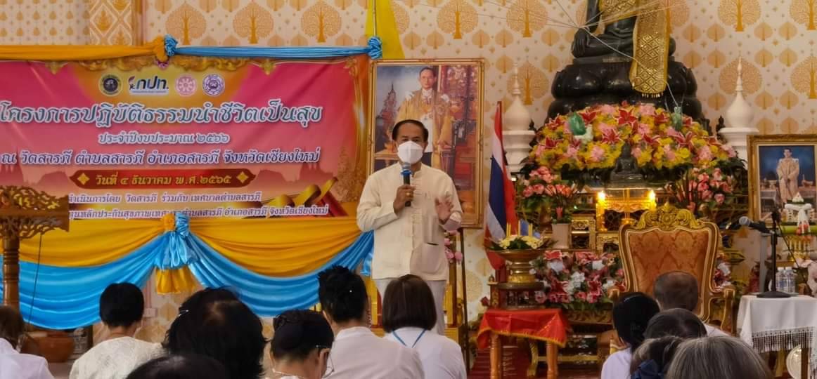 โดยในช่วงเริ่มพิธีฯ ท่านพระครูสุจิตบุญญาภรณ์ (บุญชุม จิตฺตสุโภ) ที่ปรึกษาเจ้าคณะอำเภอสารภี/เจ้าอาวาสวัดหนองแฝก ตำบลหนองแฝก ได้เป็นองค์ประธานพิธีฯได้จุดธุปเทียนบูชาพระรัตนตรัย และเทศนาธรรม หลังจากนั้นได้มีการบรรยายหัวข้อที่สำคัญๆ ได้แก่ การจัดการความเครียดด้วยวิปัสสนากรรมฐาน, การสร้างสรรค์สุขภาวะทางจิต ทางสังคม และทางจิตวิญญาณตามแนวพระพุทธศาสนา, การดูแลสุขภาวะจิตตามแนวทางพระพุทธศาสนา โดย คณะสงฆ์ผู้เป็นวิทยากรทรงความรู้จากสำนักวัดต่าง ๆในอำเภอสารภี มีจำนวนผู้เข้าร่วมโครงการฯประมาณ 200 คน เริ่มตั้งแต่เวลา 07.00-16.30 น.