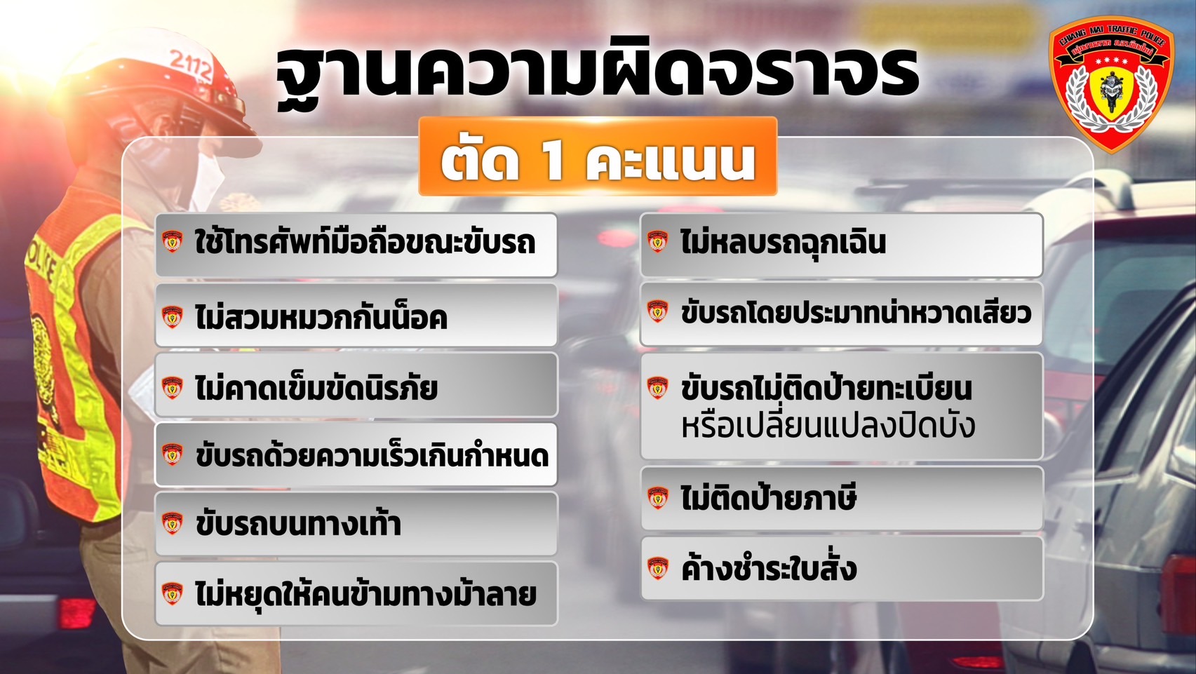 - ตัด 1 คะแนน เช่น ขับรถเร็วเกินกำหนด ไม่สวมหมวกนิรภัย, ไม่รัดเข็มขัดนิรภัย, ไม่หยุดให้คนข้าม ทางม้าลาย, ใช้โทรศัพท์ขณะขับรถ