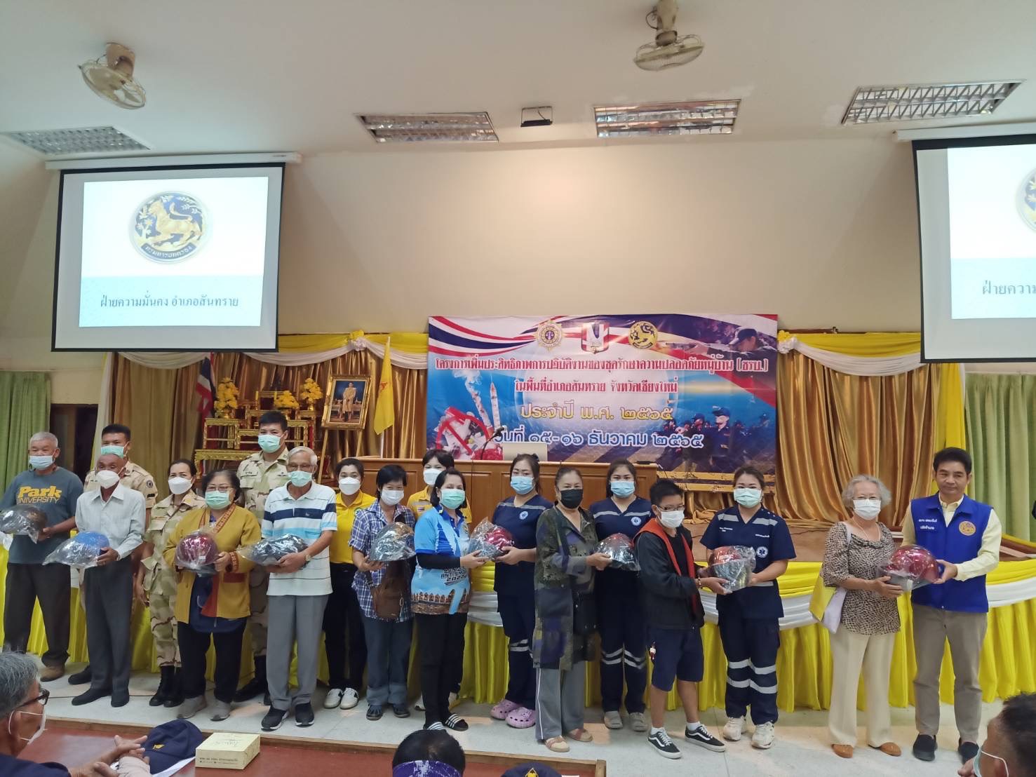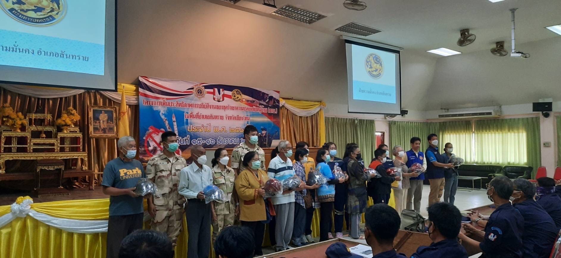 วันที่ 16 ธันวาคม 2565 ณ หอประชุมอำเภอสันทราย จังหวัดเชียงใหม่ ภายใต้การอำนวยการของ นายศิวะ ธมิกานนท์ นายอำเภอสันทราย/ผู้อำนวยการ ศูนย์อำนวยการความปลอดภัยทางถนนอำเภอสันทราย ได้มอบหมายให้ ฝ่ายความมั่นคงจัดกิจกรรมรณรงค์สวมหมวกนิรภัย 100% ตามนโยบายของปลัดกระทรวงมหาดไทย โดยดำเนินการส่งมอบหมวกนิรภัยแก่กลุ่มเป้าหมาย ซึ่งเป็นกลุ่มผู้สูงอายุฐานะยากจน ต้องใช้ยานพาหนะรถจักรยานยนต์ในการทำงานหาเลี้ยงชีพดำรงชีวิตประจำวัน โดยได้รับการสนับสนุนจากสำนักงานป้องกันและบรรเทาสาธารณภัยจังหวัดเชียงใหม่