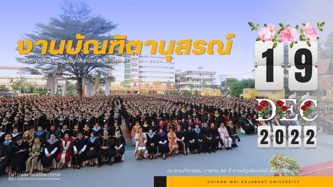 วันที่ 19 ธันวาคม 2565 เวลา 06.00 – 15.00 น. มหาวิทยาลัยราชภัฏเชียงใหม่ กำหนดจัดงานบัณฑิตานุสรณ์ เพื่อแสดงความยินดีแก่บัณฑิตมหาวิทยาลัยราชภัฏเชียงใหม่ รุ่นที่ 43 ประจำปีการศึกษา 2560 – 2562 และการถ่ายรูปหมู่บัณฑิต ณ มหาวิทยาลัยราชภัฏเชียงใหม่ พื้นที่เวียวบัว อำเภอเมือง จังหวัดเชียงใหม่