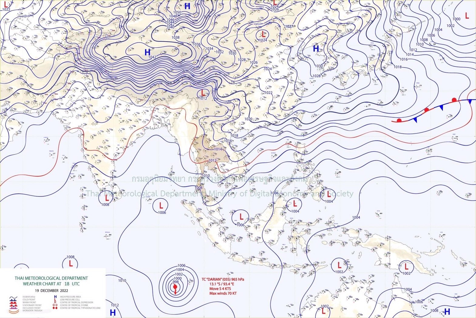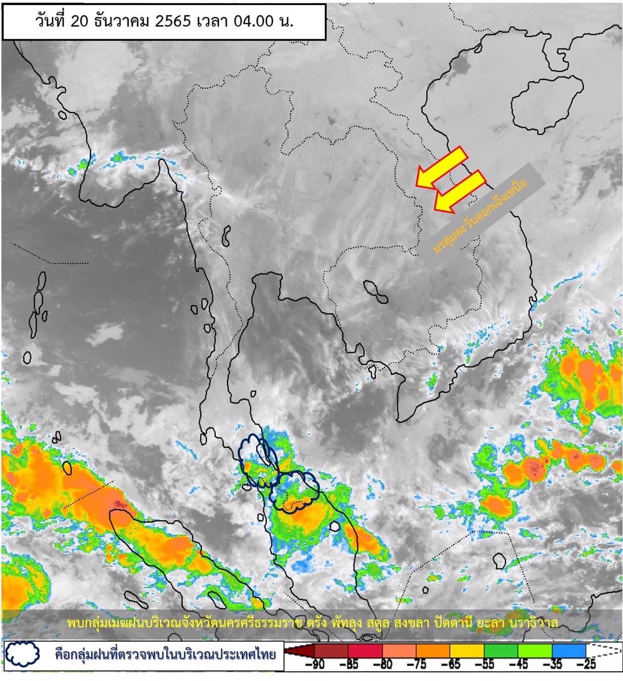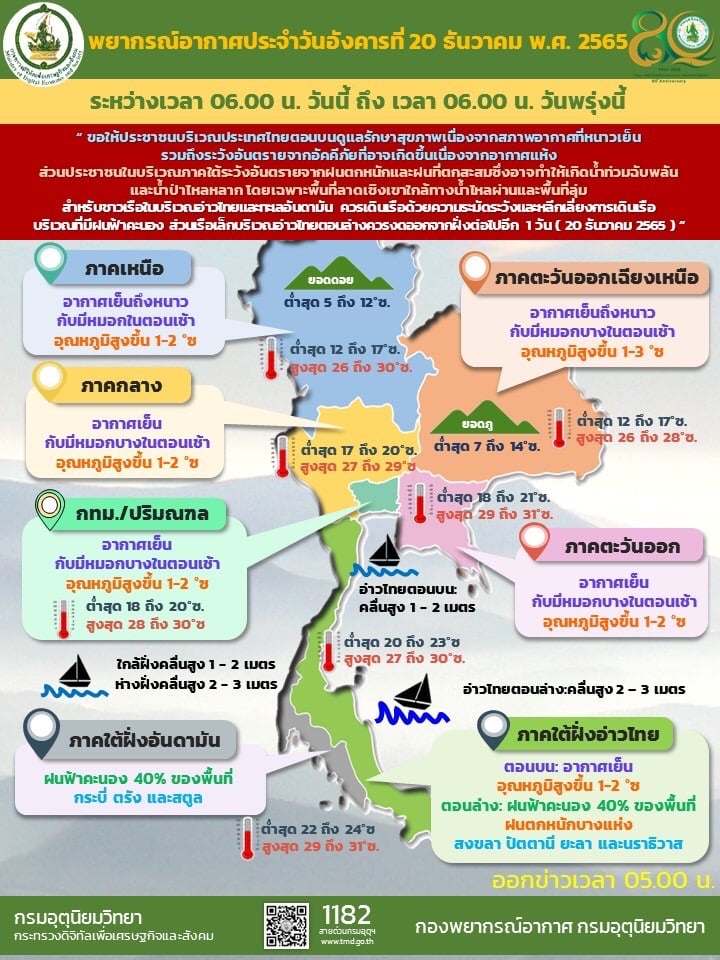 สำหรับมรสุมตะวันออกเฉียงเหนือกำลังแรง ที่พัดปกคลุมอ่าวไทย ภาคใต้ และทะเลอันดามันเริ่มมีกำลังอ่อนลง แต่ยังคงทำให้ภาคใต้ตอนล่างมีฝนตกหนักถึงหนักมากบางแห่ง ส่วนคลื่นลมบริเวณอ่าวไทยมีกำลังค่อนข้างแรง โดยอ่าวไทยและห่างฝั่งบริเวณทะเลอันดามันคลื่นสูง 2-3 เมตร บริเวณที่มีฝนฟ้าคะนองคลื่นสูงมากกว่า 3 เมตร ชาวเรือควรเดินเรือด้วยความระมัดระวัง และหลีกเลี่ยงการเดินเรือบริเวณที่มีฝนฟ้าคะนอง เรือเล็กบริเวณอ่าวไทยตอนล่างควรงดออกจากฝั่งจนถึงวันที่ 20 ธันวาคม 2565