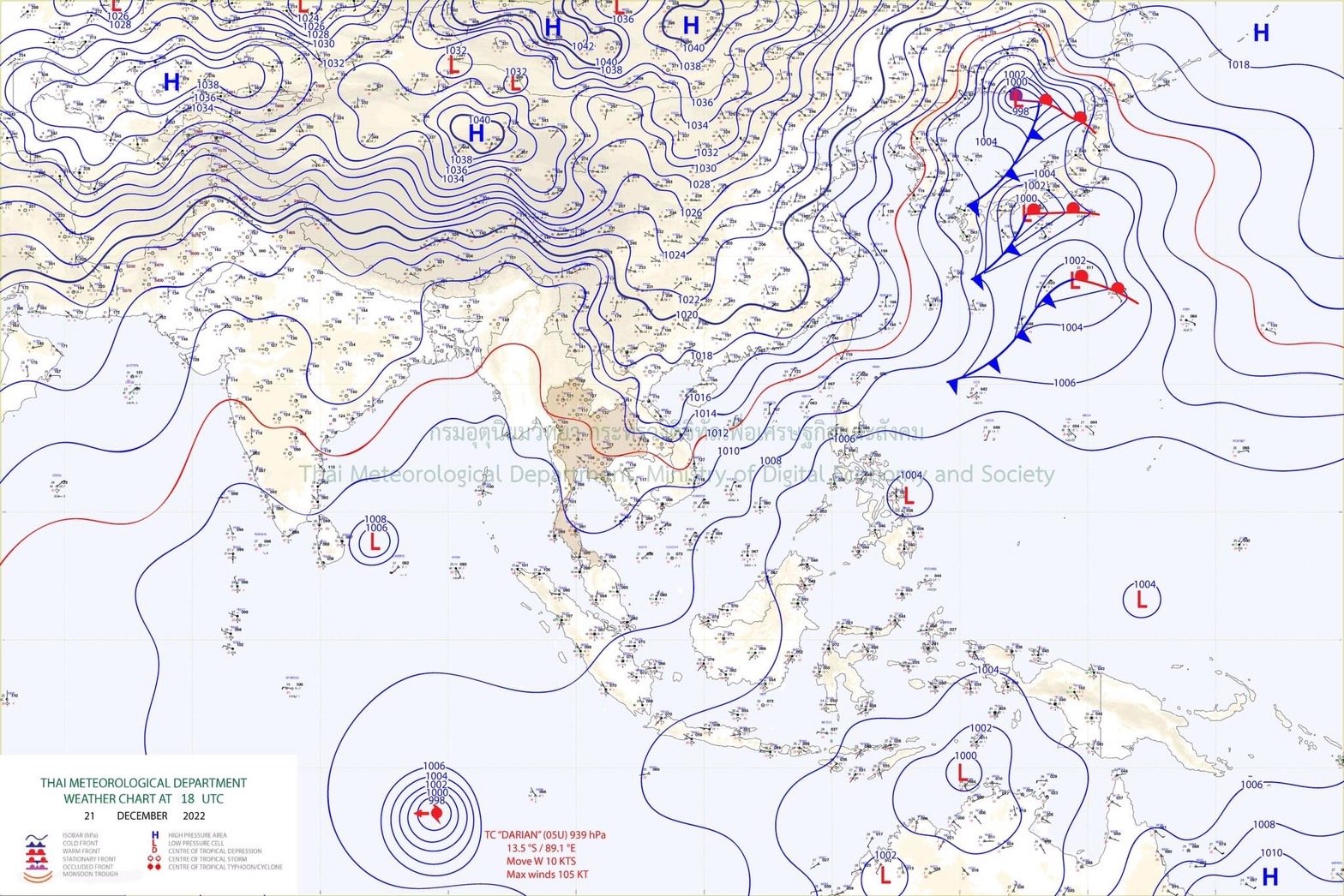 ลักษณะอากาศทั่วไป พยากรณ์อากาศ 24 ชั่วโมงข้างหน้า บริเวณความกดอากาศสูงหรือมวลอากาศเย็นกำลังปานกลาง ปกคลุมประเทศไทยตอนบน ลักษณะเช่นนี้ยังคงทำให้ภาคเหนือและภาคตะวันออกเฉียงเหนือ มีอากาศเย็นถึงหนาว ส่วนภาคกลางรวมทั้งกรุงเทพมหานครและปริมณฑล ภาคตะวันออก และภาคใต้ตอนบน มีอากาศเย็นในตอนเช้า ขอให้ประชาชนดูแลรักษาสุขภาพ เนื่องจากสภาพอากาศที่หนาวเย็น รวมถึงให้ระวังอันตรายจากอัคคีภัย ที่อาจเกิดขึ้นเนื่องจากอากาศแห้งในระยะนี้ไว้ด้วย