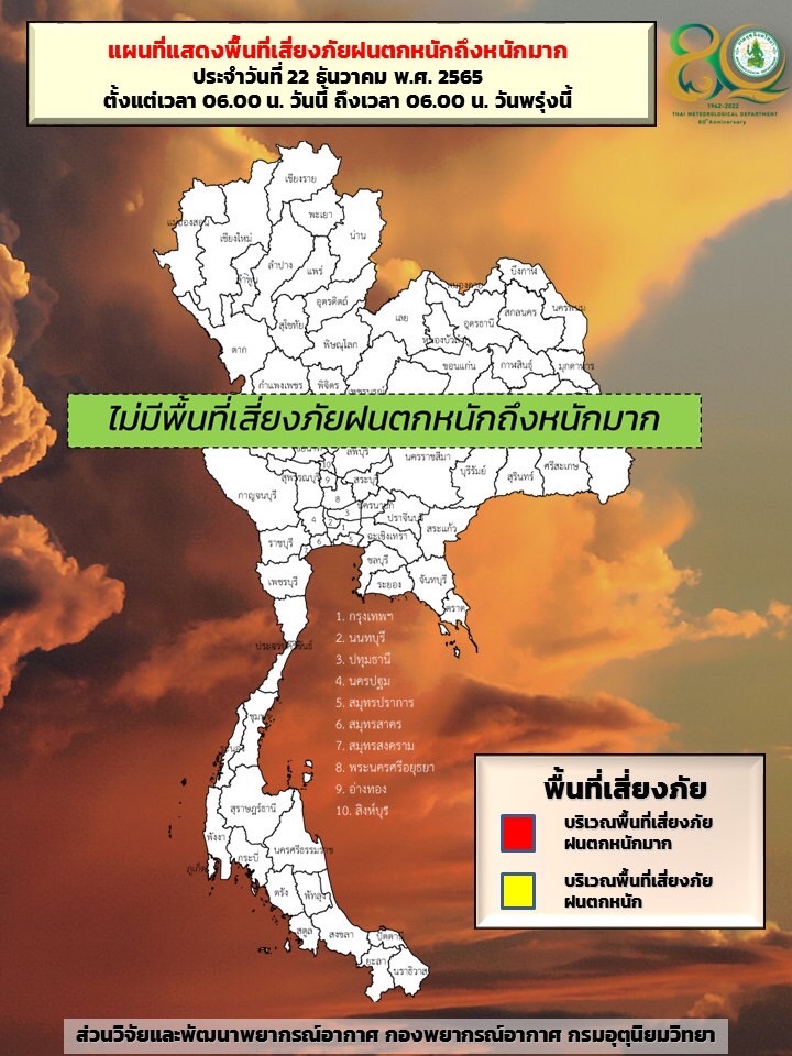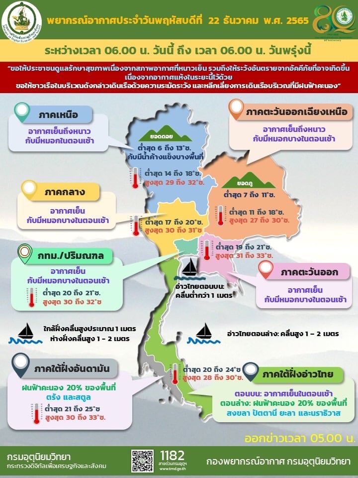 กรุงเทพ,มหานครและปริมณฑล อากาศเย็นกับมีหมอกบางในตอนเช้า อุณหภูมิต่ำสุด 20-21 องศาเซลเซียส อุณหภูมิสูงสุด 30-32 องศาเซลเซียส ลมตะวันออกเฉียงเหนือ ความเร็ว 10-20 กม./ชม.