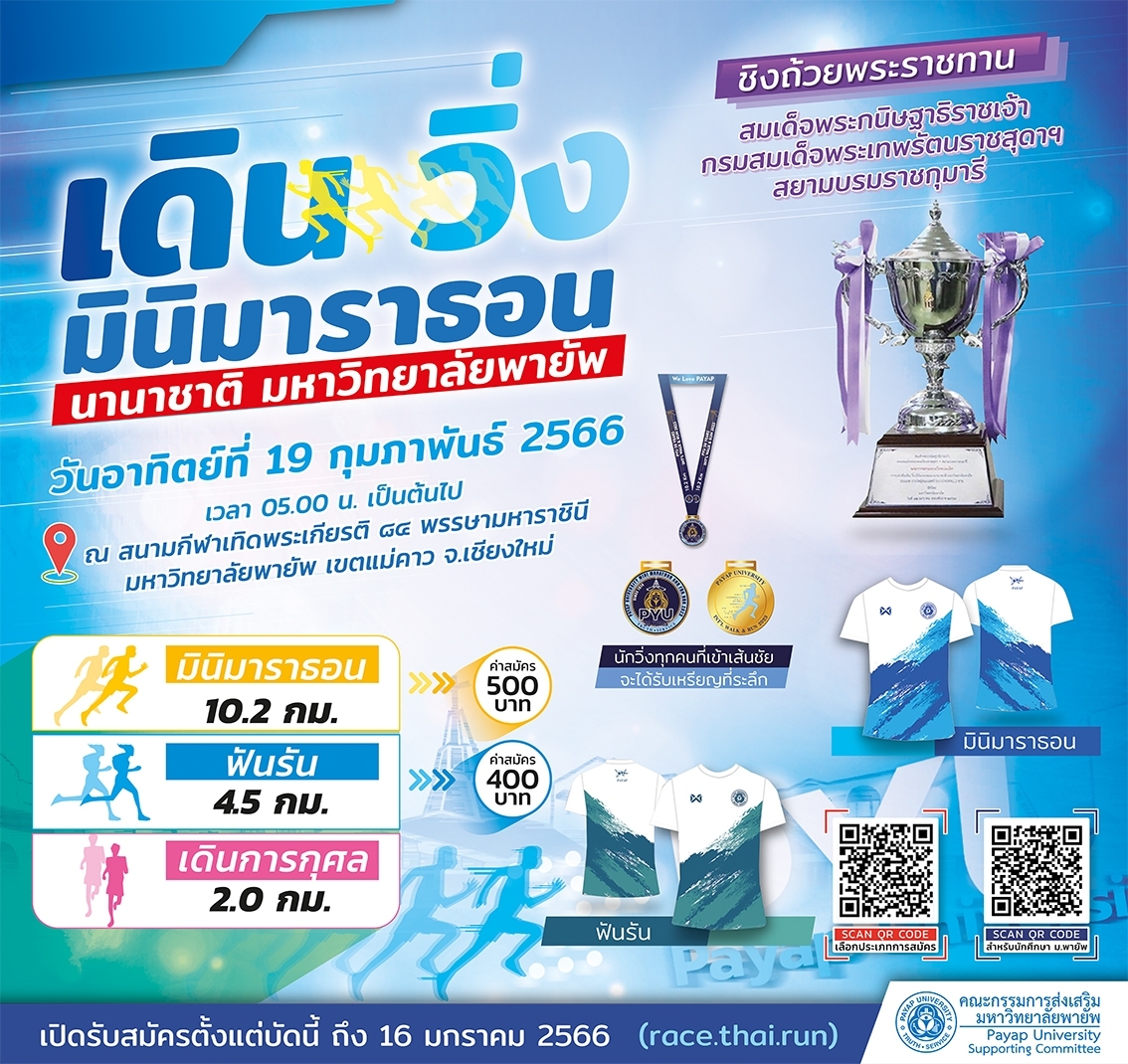 มหาวิทยาลัยพายัพ จัดกิจกรรม “เดิน วิ่ง มินิมาราธอน นานาชาติ มหาวิทยาลัยพายัพ” ประจำปีพุทธศักราช 2566 ชิงถ้วยพระราชทานสมเด็จพระกนิษฐาธิราชเจ้า กรมสมเด็จพระเทพรัตนราชสุดา เจ้าฟ้ามหาจักรีสิรินธร มหาวชิราลงกรณวรราชภักดี สิริกิจการิณีพีรยพัฒน รัฐสีมาคุณากรปิยชาติ สยามบรมราชกุมารี ในวันอาทิตย์ที่ 19 กุมภาพันธ์ 2566 เวลา 05.00 น. ณ สนามกีฬาเทิดพระเกียรติ 84 พรรษามหาราชินี มหาวิทยาลัยพายัพ เขตแม่คาว จังหวัดเชียงใหม่