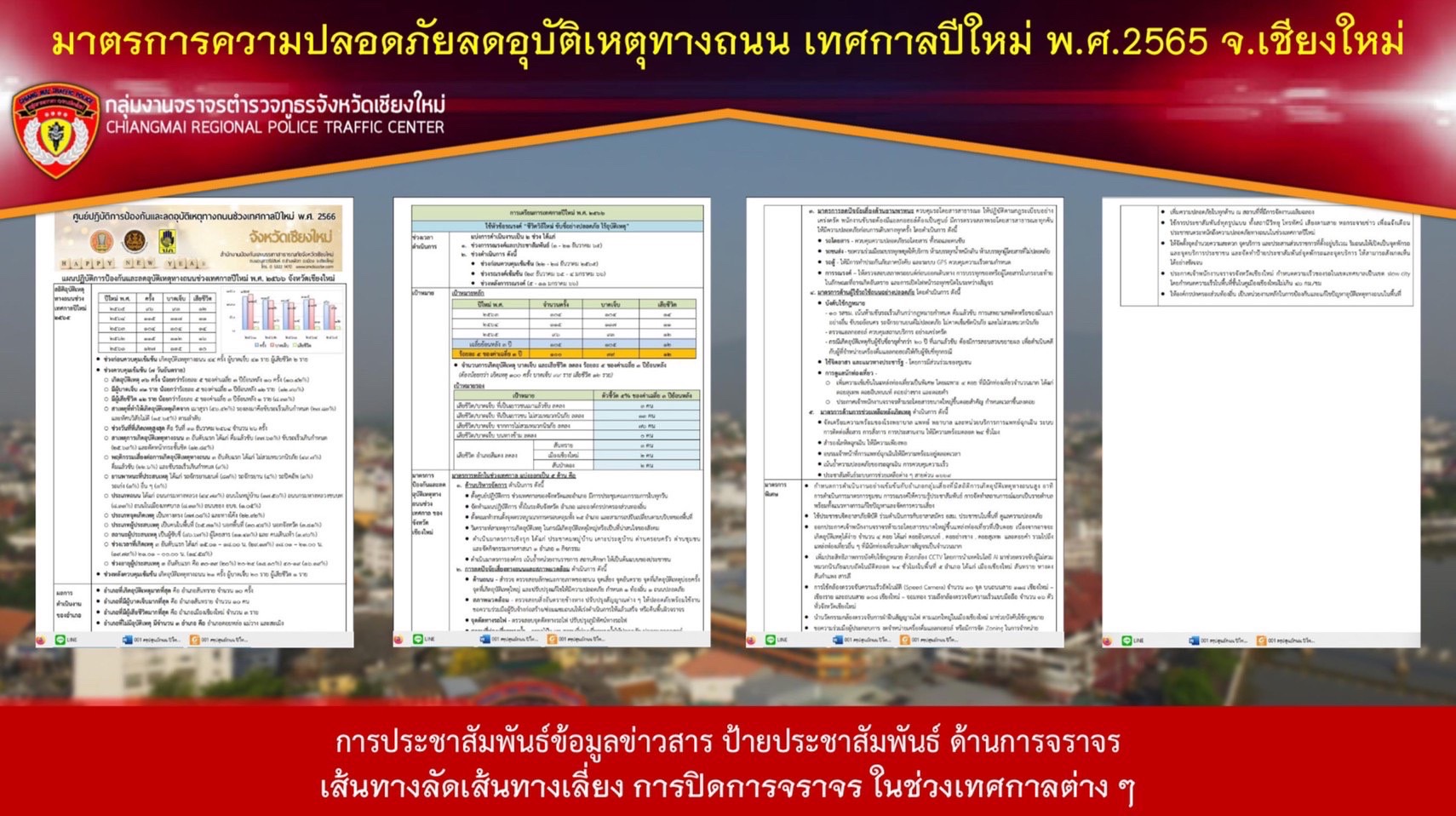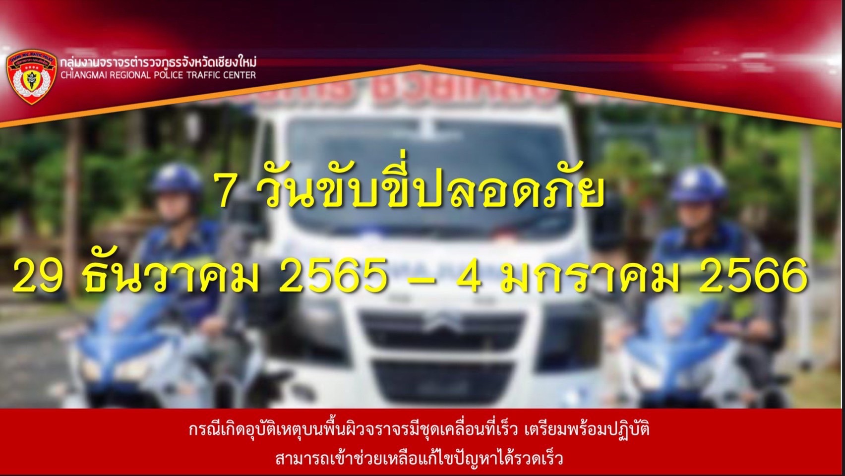 มาปฏิบัติอย่างจริงจังและต่อเนื่อง เพื่อลดปัจจัยเสี่ยง ป้องกันการเกิดอุบัติเหตุ และความสะดวกปลอดภัย ของผู้ใช้รถใช้ถนน โดยจะนําเทคโนโลยีมาบังคับใช้กฎหมาย โดยเฉพาะการใช้กล้องอัจฉริยะ(AI) เข้ามาตรวจสอบ การกระทําความผิด เรื่องการไม่สวมใส่หมวกนิรภัยขณะขับขี่รถจักรยานยนต์ ซึ่งเป็นสาเหตุสําคัญของการเพิ่มความรุนแรงของการเกิดอุบัติเหตุในช่วงเทศกาลต่างๆ เพื่อปลูกจิตสํานึกให้มีการสร้างวินัยจราจรเริ่มจากตัวผู้ขับขี่เอง โดยเริ่มบังคับใช้กฎหมายตั้งแต่ 15 ธันวาคม 2563 เป็นต้นมา ในการจัดการจราจรและอํานวยความสะดวกด้านการจราจร และดูแลความปลอดภัยในช่วงเทศกาลปีใหม่ พ.ศ. 2566 นี้ได้ระดมและจัดกําลังเจ้าหน้าที่ตํารวจจราจร เจ้าหน้าที่อาสาจราจรออกปฏิบัติหน้าที่รวมทั้งสิ้น จํานวน 300 นาย มาร่วมช่วยกันลดสถิติอุบัติเหตุ ป้องกันการบาดเจ็บ สูญเสียชีวิต และทรัพย์สิน ทําให้ช่วงเทศกาล สําคัญดังกล่าว มีแต่ความสุข ความสนุกสนาน ตั้งสติก่อนสตาร์ท เมาไม่ขับ ง่วงไม่ขับ ขับไม่ไว งดใช้ โทรศัพท์ ด้วยความปรารถนาดีจากตํารวจภูธรภาค 5 ตํารวจ ภ.จ.เชียงใหม่
